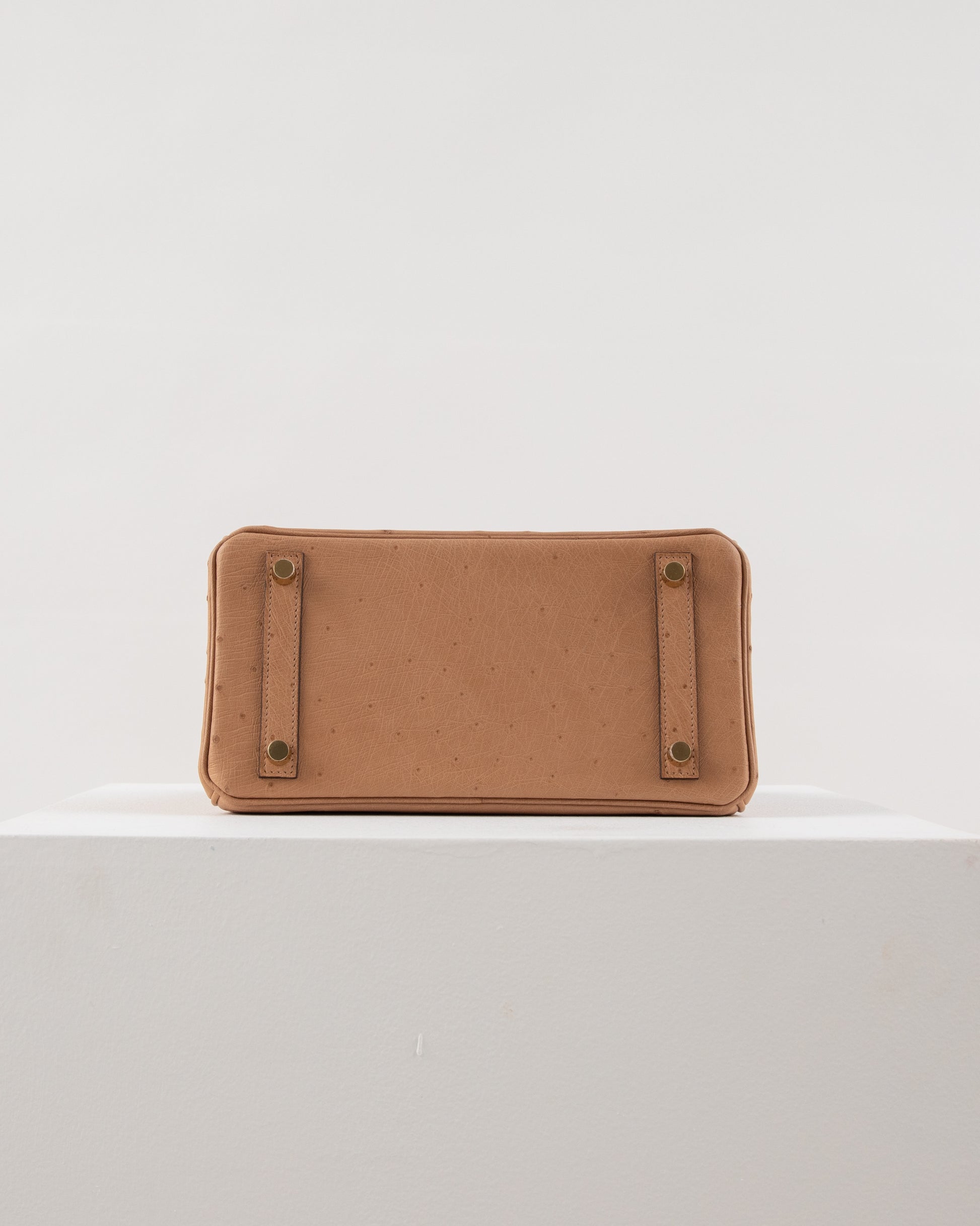 Our Birkin 25 in Chai is crafted with Ostrich leather and finished with gold hardware details. The interior is lined with Chai chevre and has a zip pocket with a Hermès engraved zipper pull and an open pocket on the opposite side.