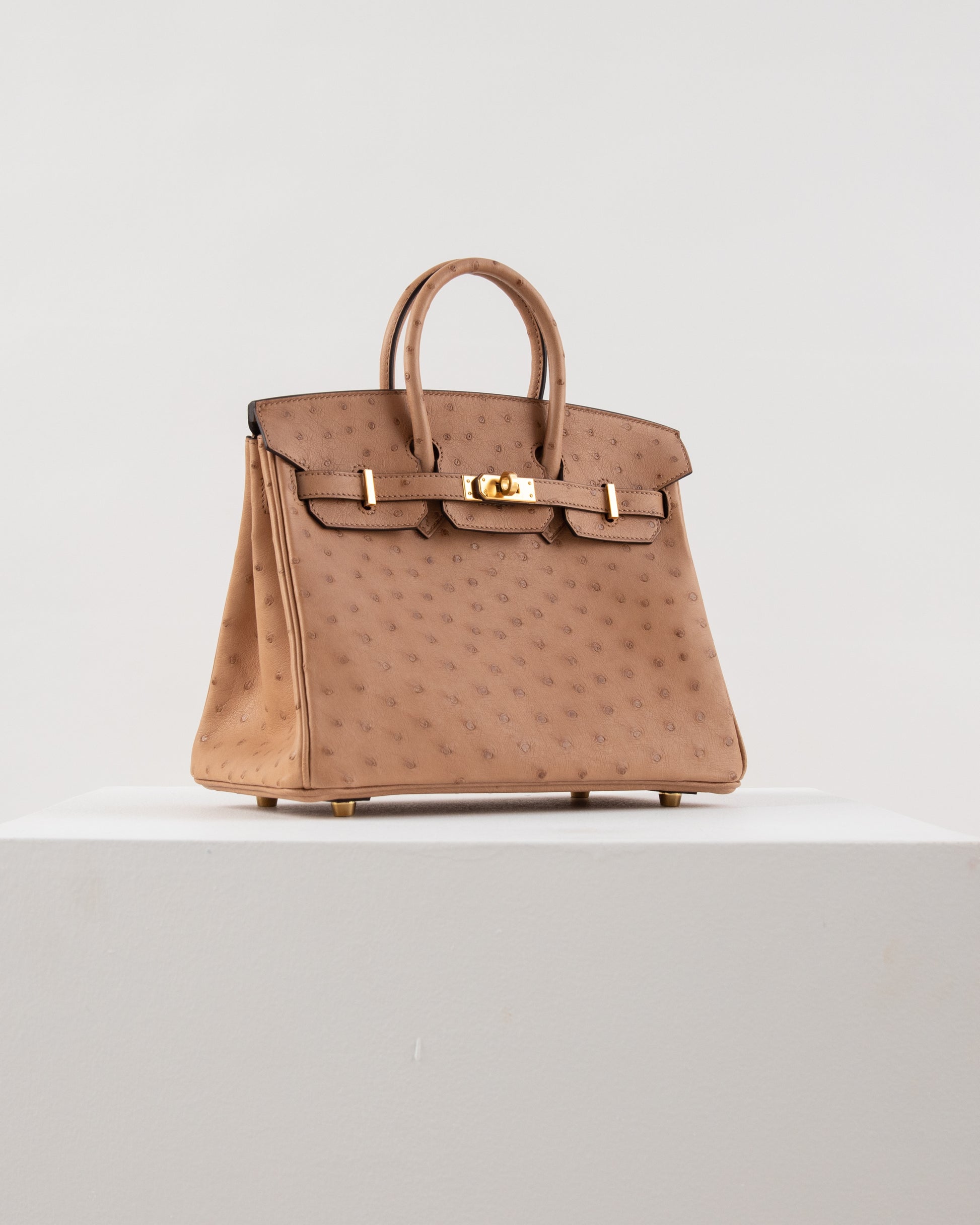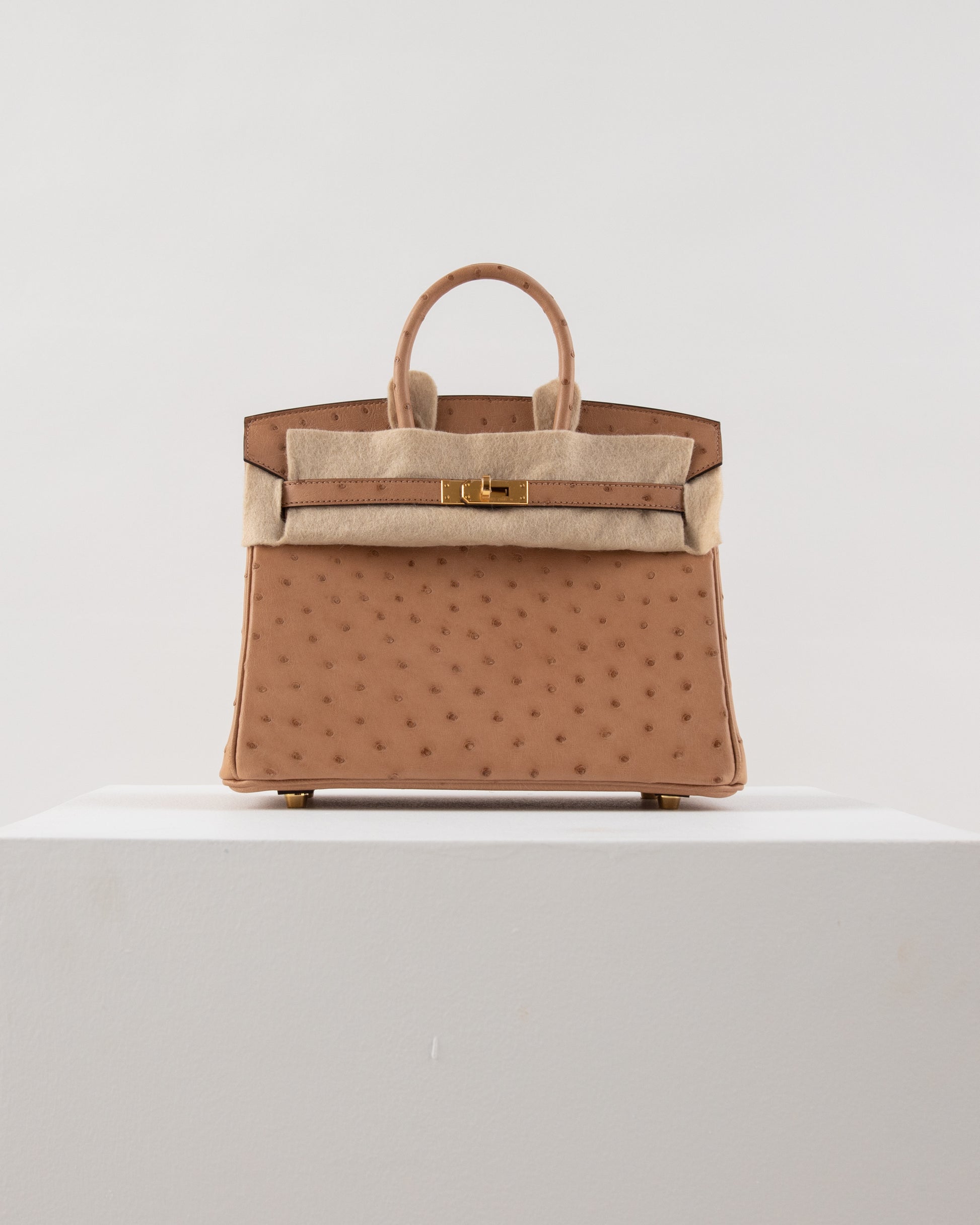 This Hermès Ostrich Birkin 25 in Chai is a unique and eye-catching piece that is sure to make a statement in your collection. Made from luxurious Ostrich leather and adorned with gold hardware details, this Birkin is a truly special item. The combination of the warm Chai color and the durable and sought-after Ostrich leather makes this Birkin an exceptional addition to any collection.