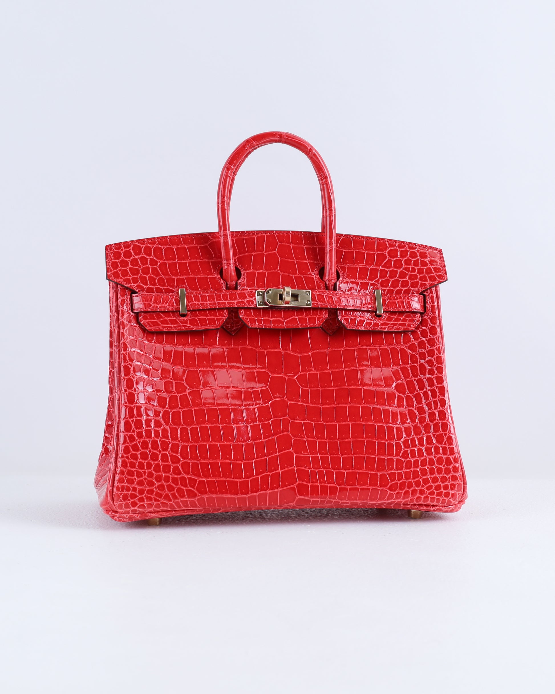 With its rare Crocodile Porosus leather, the Birkin 25 showcases not only a timeless design but also an exquisite texture that accentuates the uniqueness of each scale. The gold hardware complements the Rouge de Ceour hue, creating a harmonious fusion of opulence and elegance.