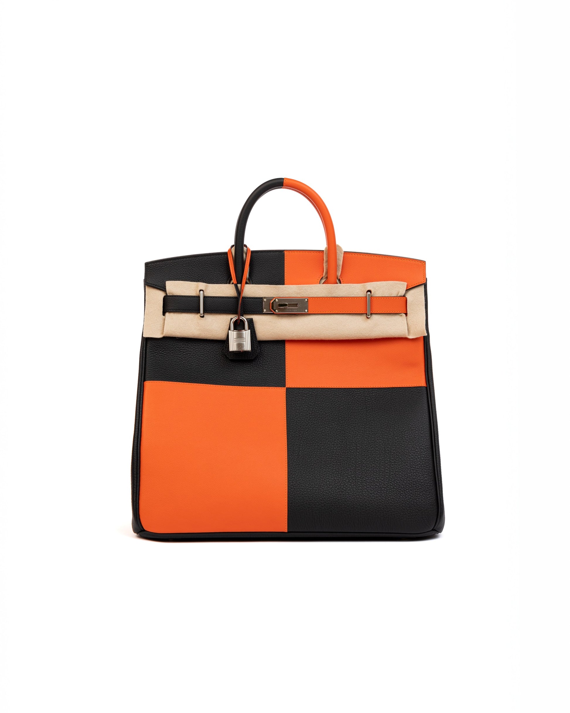 The Hermès Birkin 40cm HAC Casaque in Black and Orange H Togo Leather with Palladium Hardware is an exceptionally rare and collectible piece. The vibrant two-tone Casaque design, inspired by the bold colors of equestrian racing silks, features the iconic Hermès orange paired with a deep black for a stunning contrast. This particular color combination is not only rare but is also accompanied by the exclusive Hermès blue box, which further adds to its desirability and collectibility.