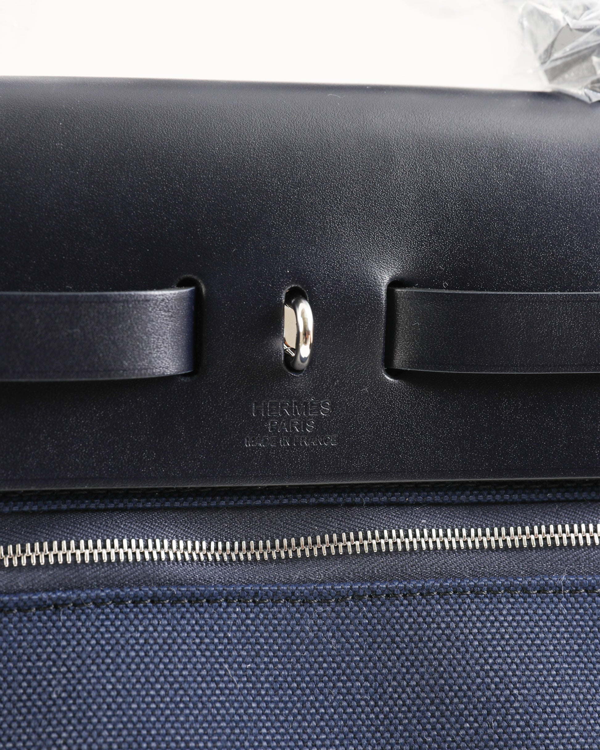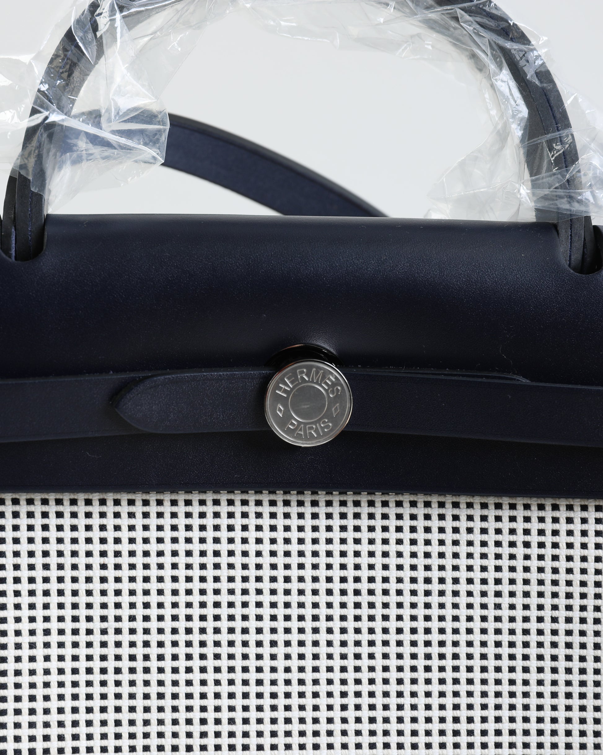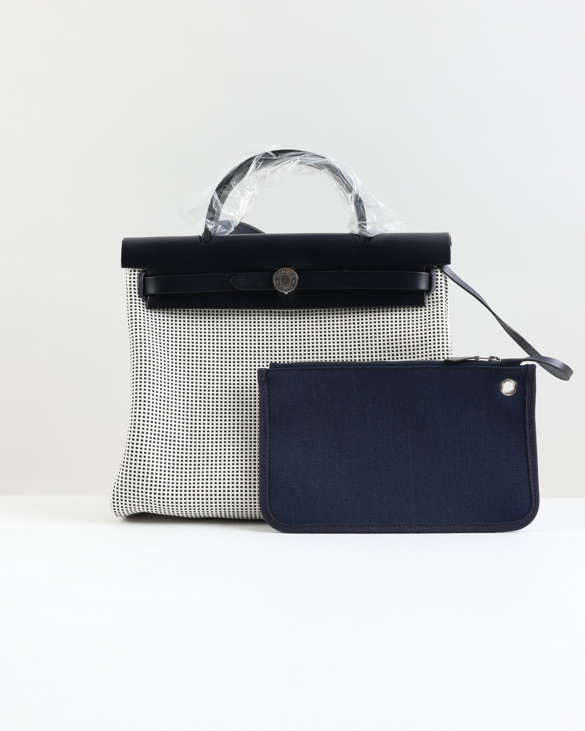 Herbag 31 Bag Retourne Ecru Blanc Noir/Bleu Indigo Toile Quadrille Viking Laiton with Palladium Hardware