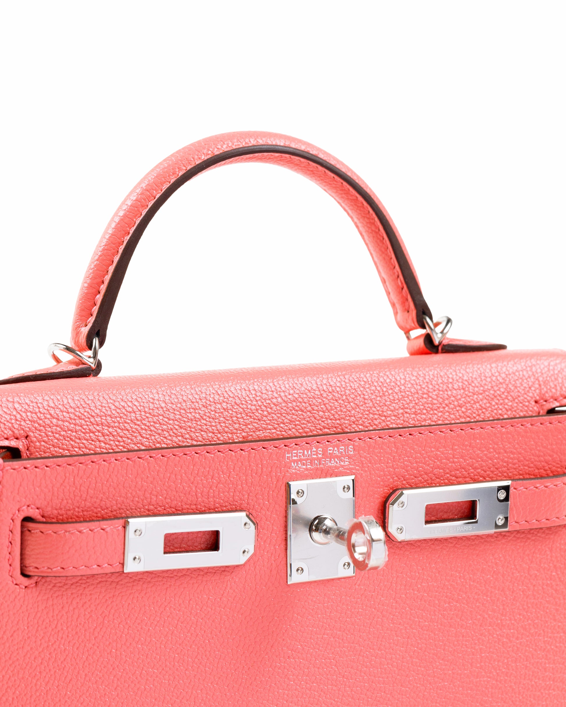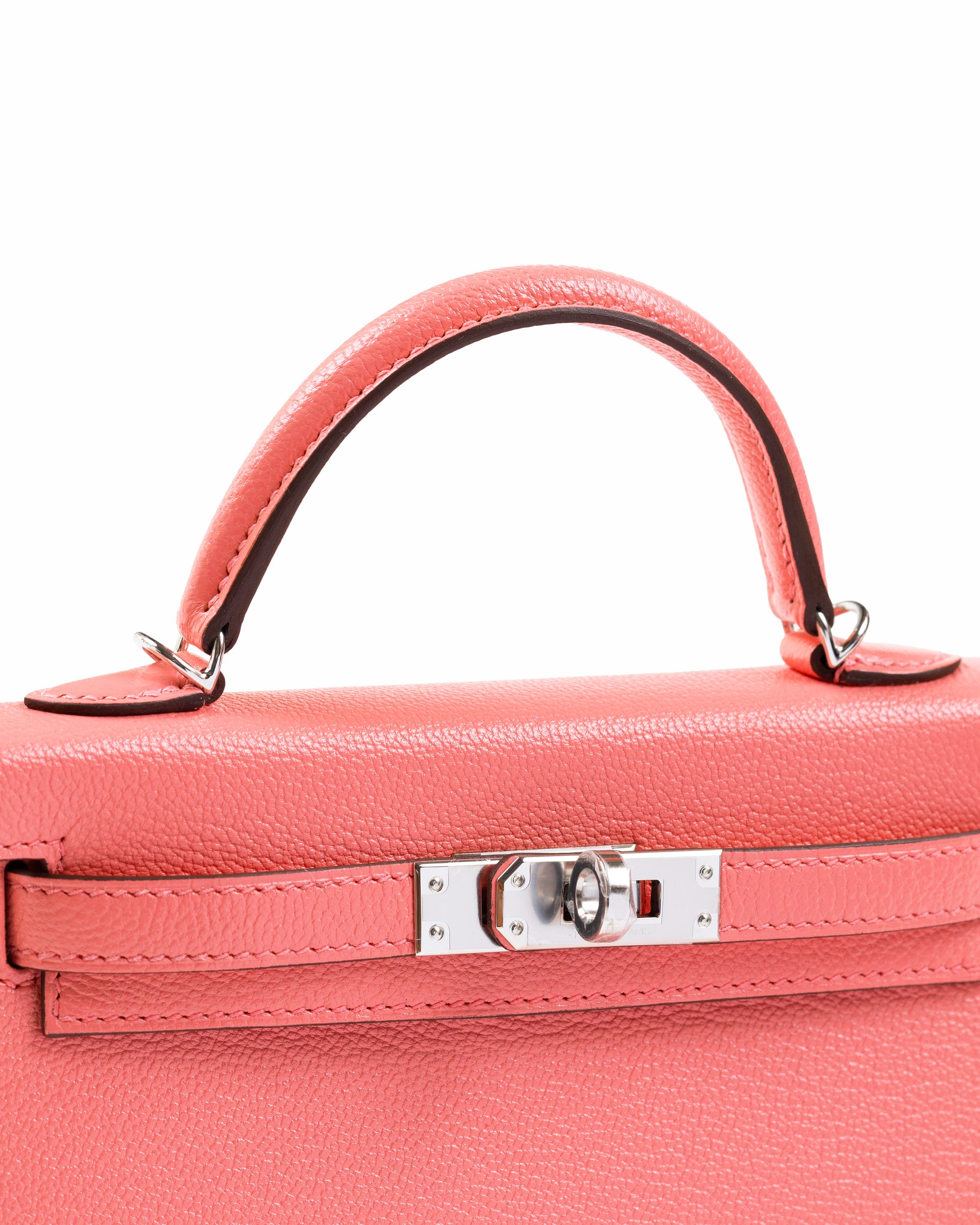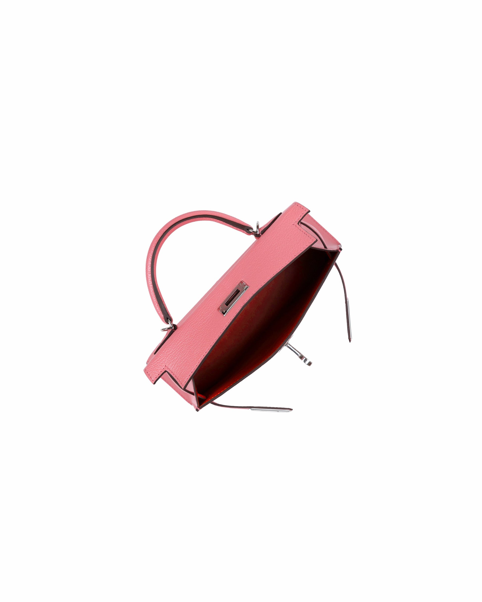 The interior of this elegant piece is beautifully lined in Rouge Venetian, offering a striking contrast that enhances its beauty. The rich red interior adds a bold touch to the soft pink exterior, creating a harmonious blend of colors. The palladium hardware provides a sleek and modern finish, complementing the overall design. This Kelly 20 is a refined and stylish accessory that stands out for its unique color combination and quality craftsmanship.