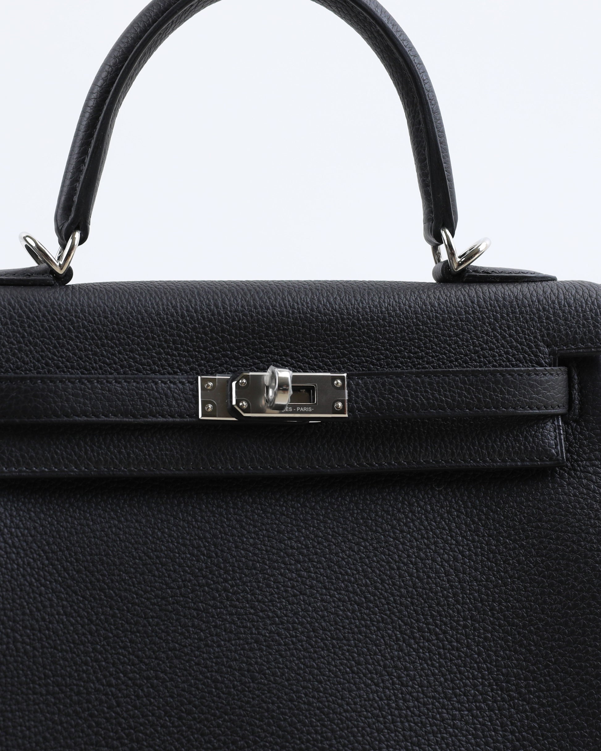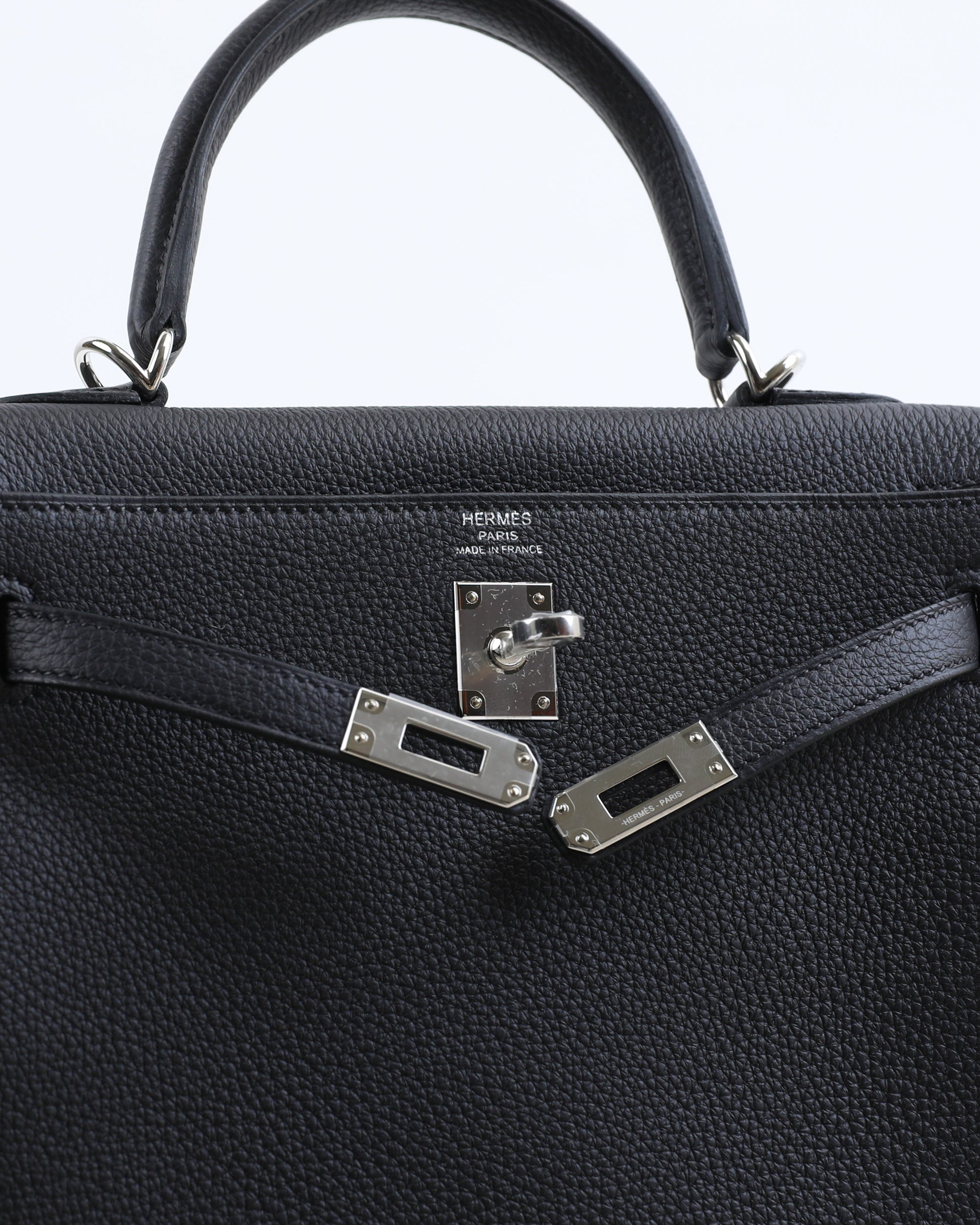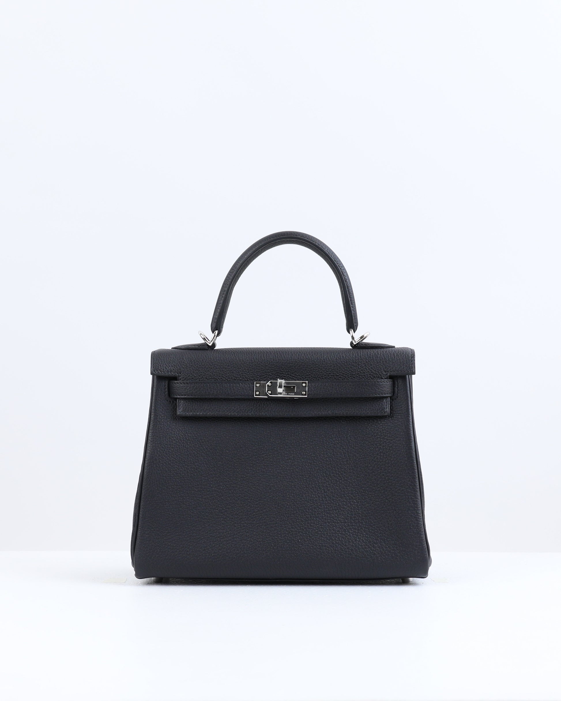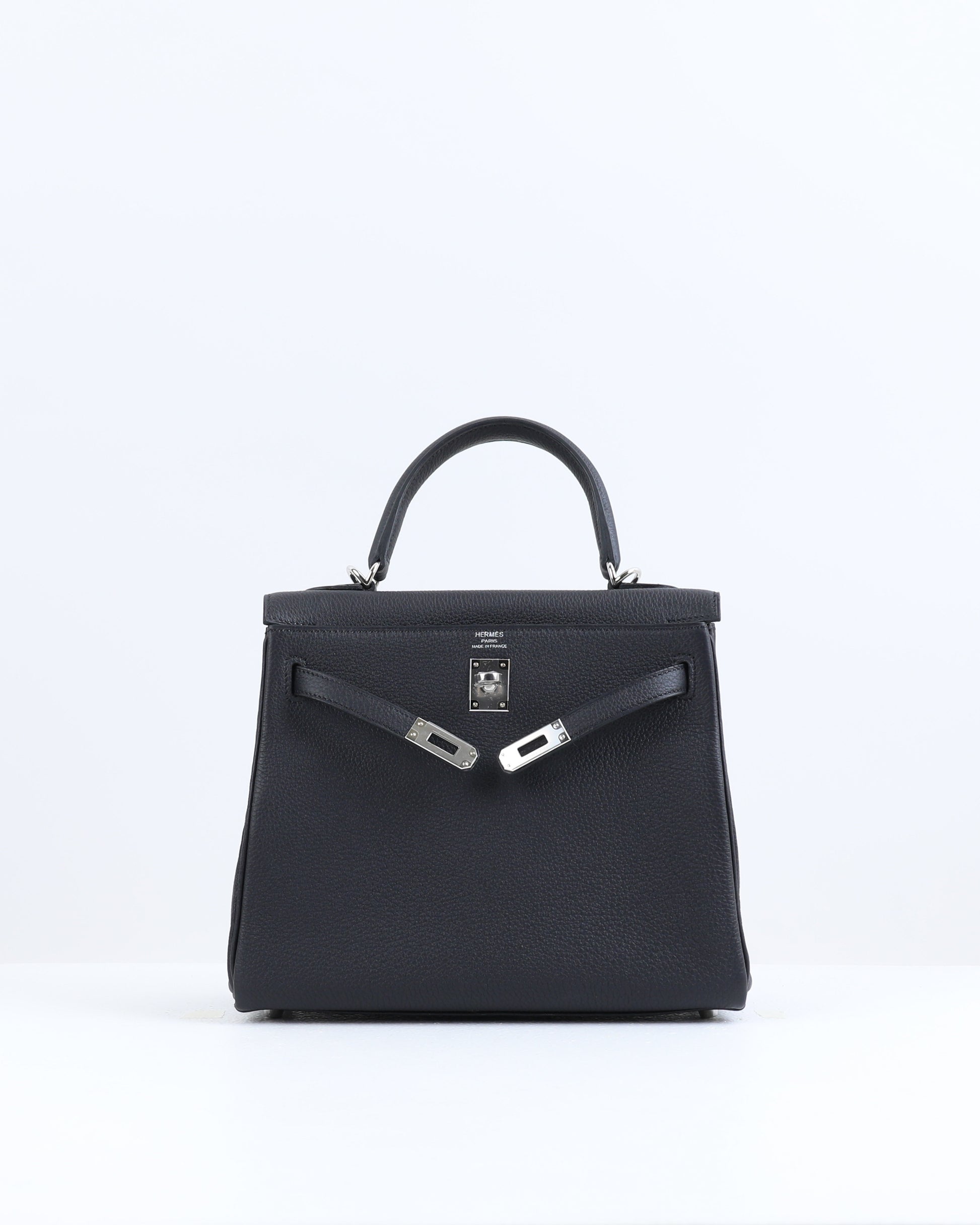 This Kelly 25 is crafted with classic Black Togo leather and complemented with palladium hardware. It features tonal stitching, a front flap, two straps with center toggle closure, a clochette with a lock and two keys, and double rolled handles.