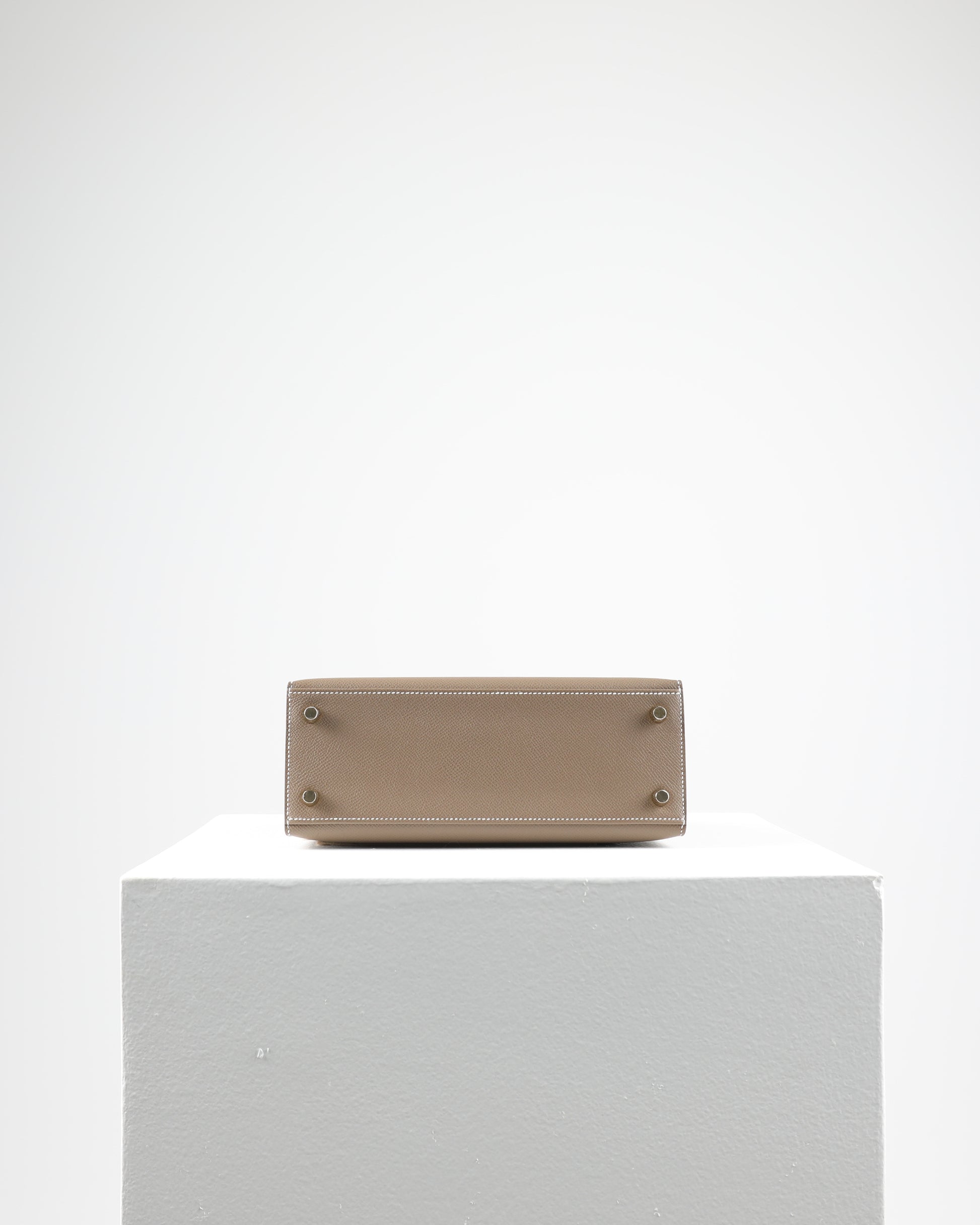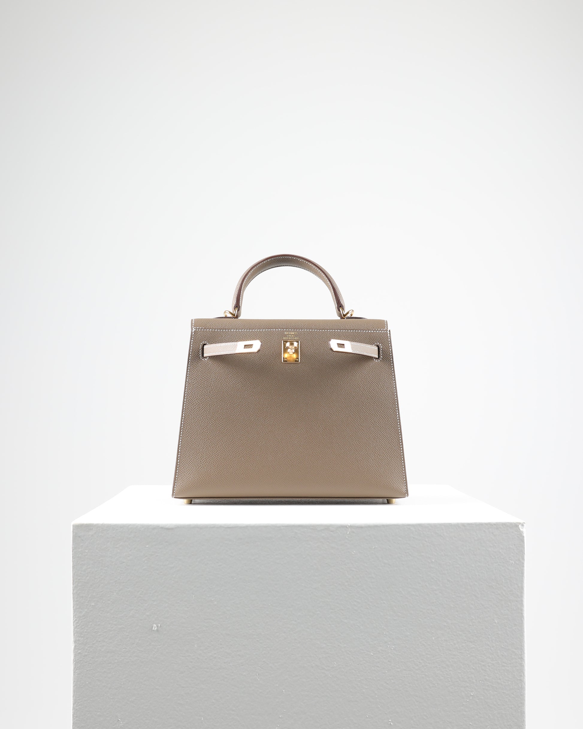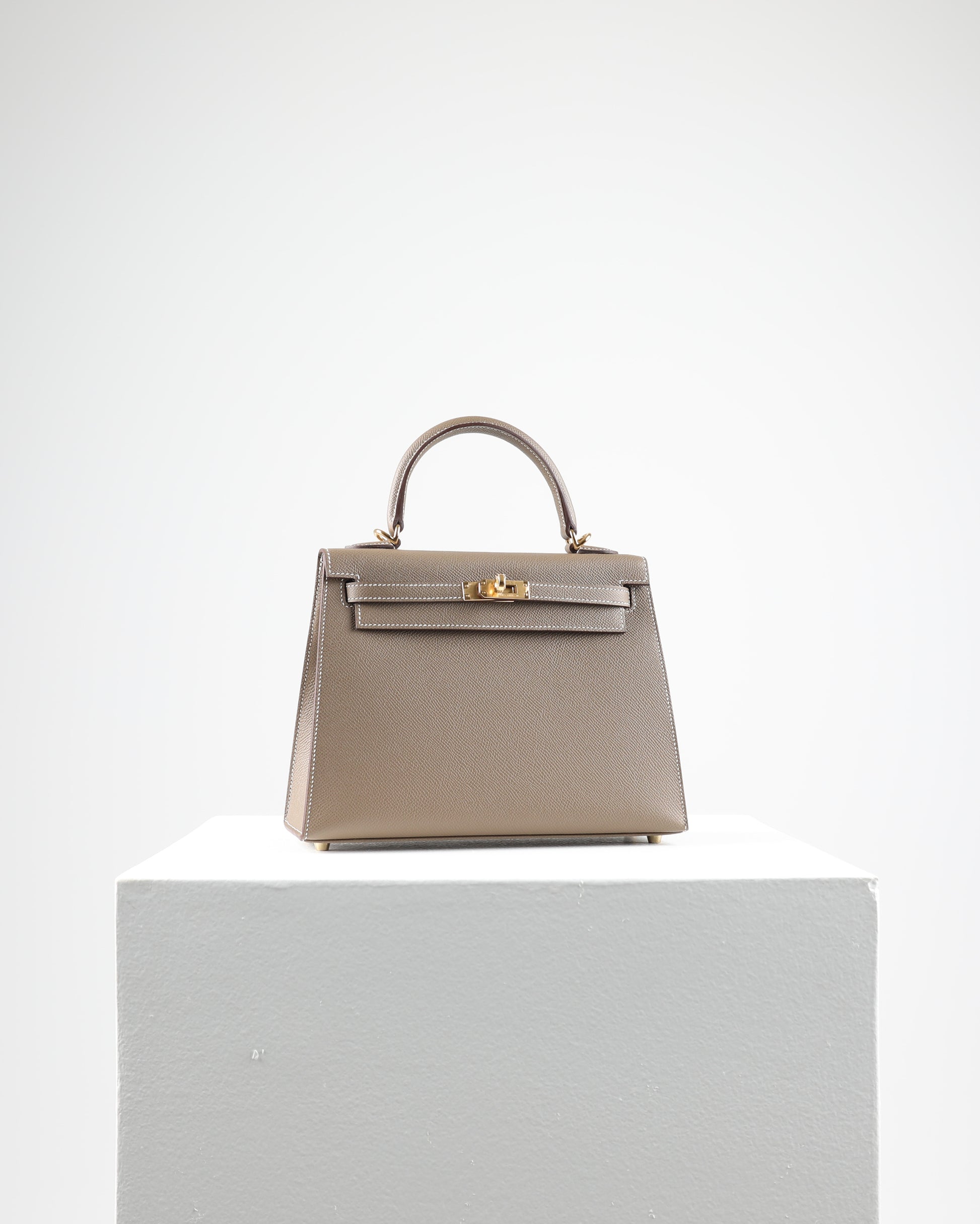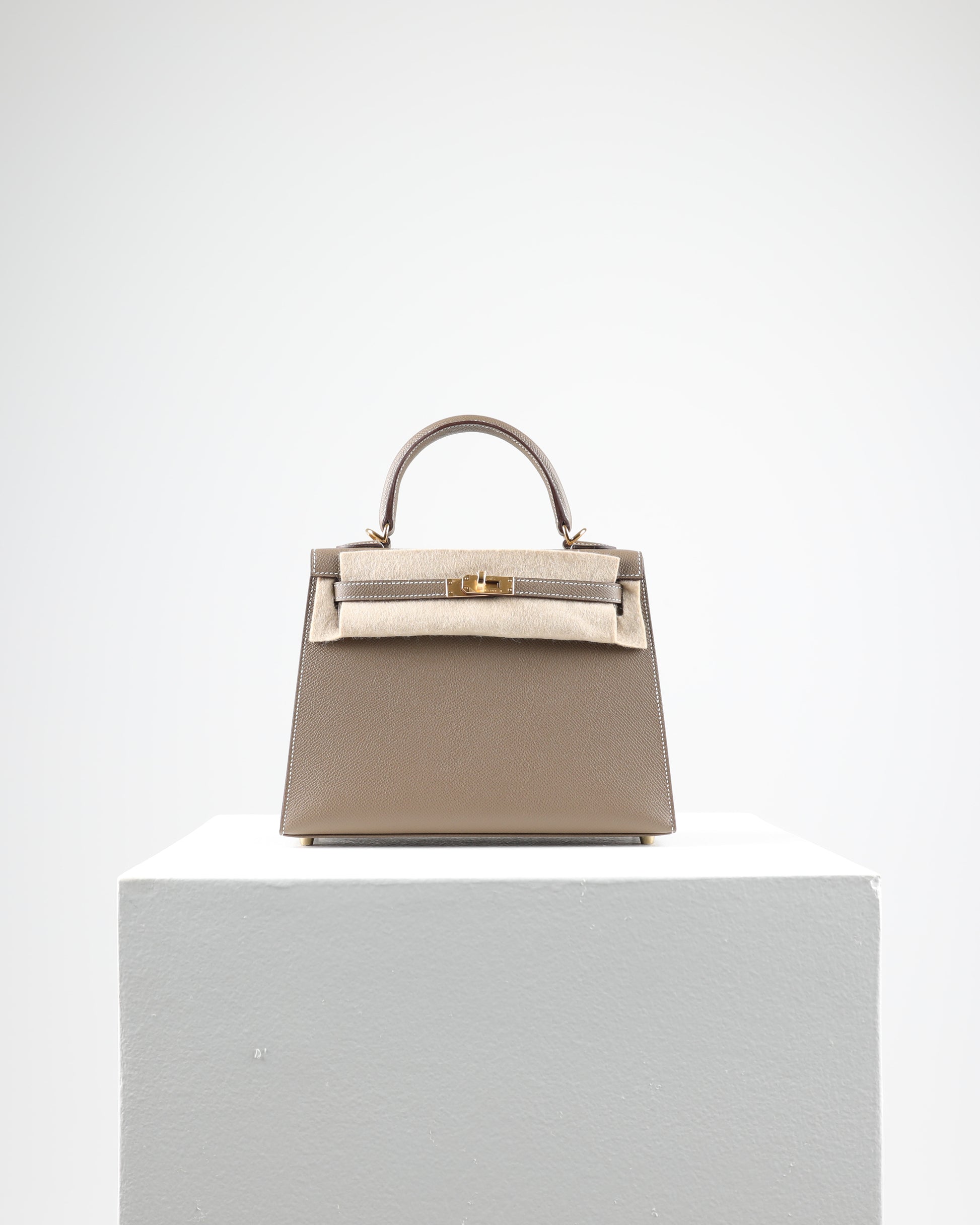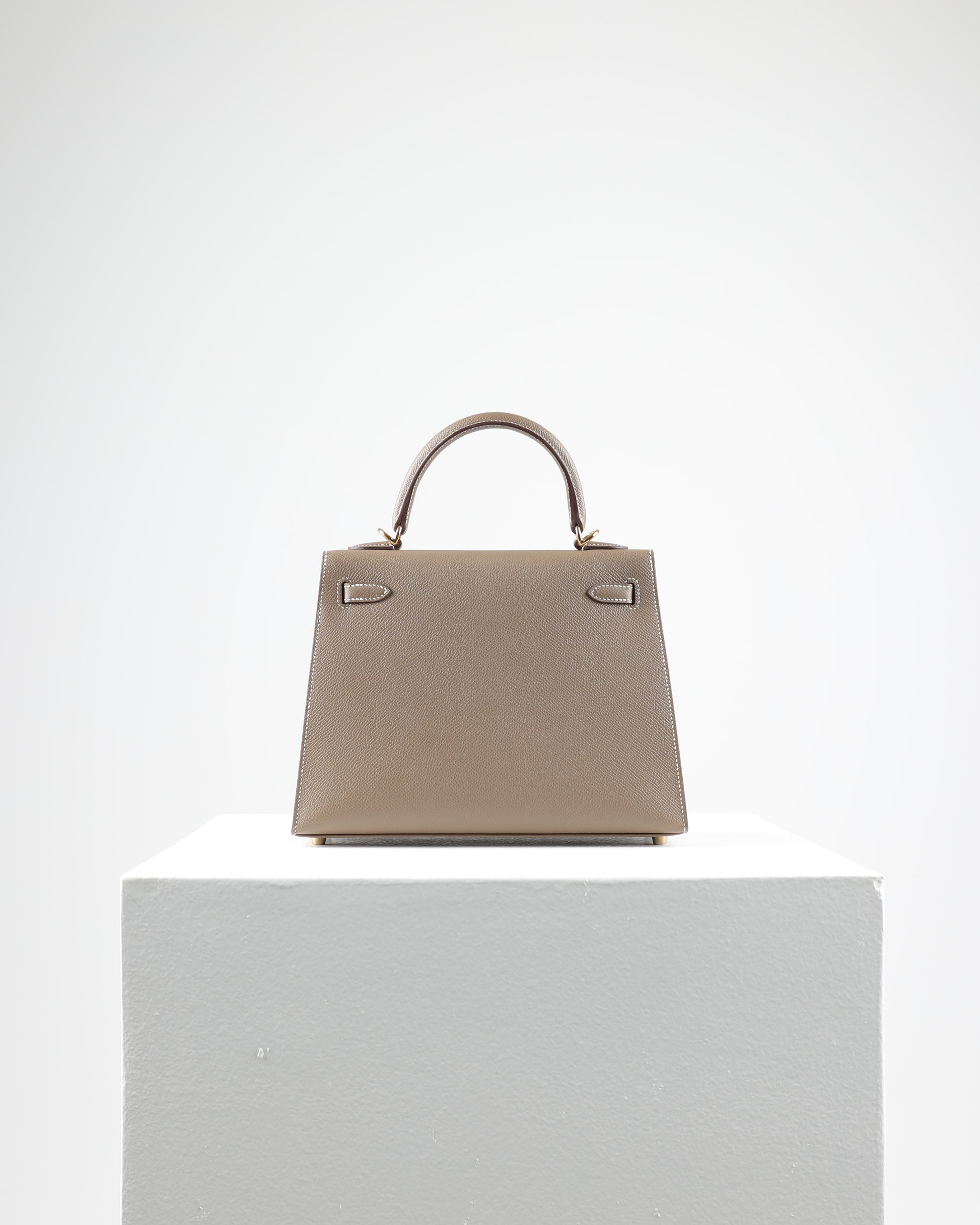 Our Kelly 25 in Etoupe is crafted with classic Epsom leather and finished with gold hardware details. Features tonal stitching, front flap, two straps with center toggle closure, a single rolled handle, and removable shoulder strap. The interior is lined with Etoupe and has one zip pocket with an Hermès engraved zipper pull.