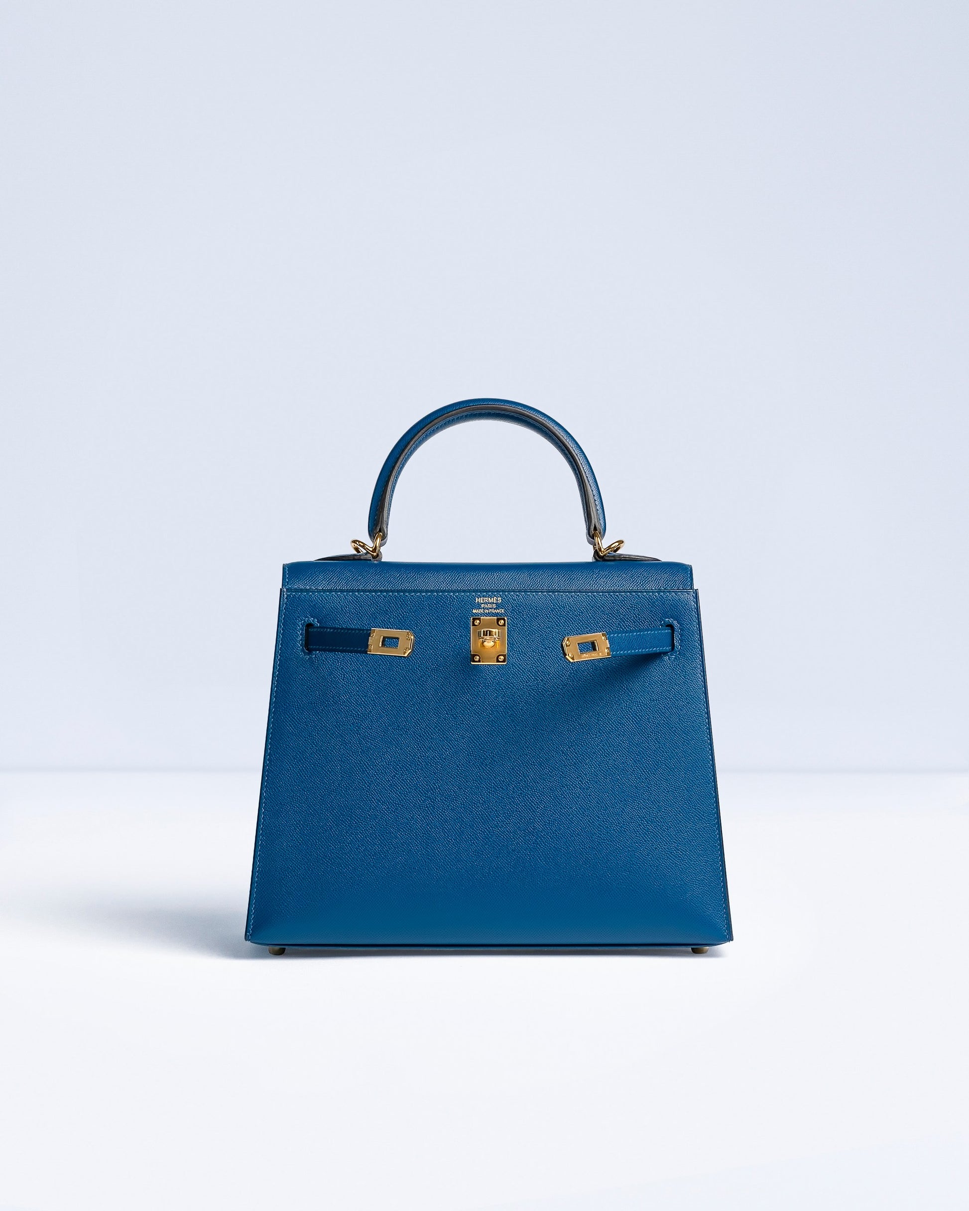 The Deep Bleu Hermès Kelly 25 in Madame Veau leather with gold hardware (ghw) is a stunning embodiment of elegance and sophistication. This particular shade of deep blue is rich and captivating, with subtle hints of green that evoke the serene and mysterious depths of ocean waters. It stands distinct among Hermès' extensive palette of over 40 shades of blue, offering a unique hue that is neither too dark like navy nor leaning towards green or purple. It’s a true deep blue that feels both unplaceable in nature yet inherently natural.