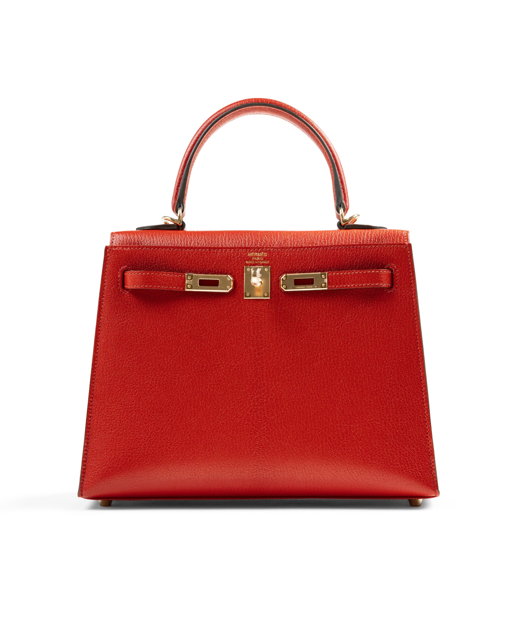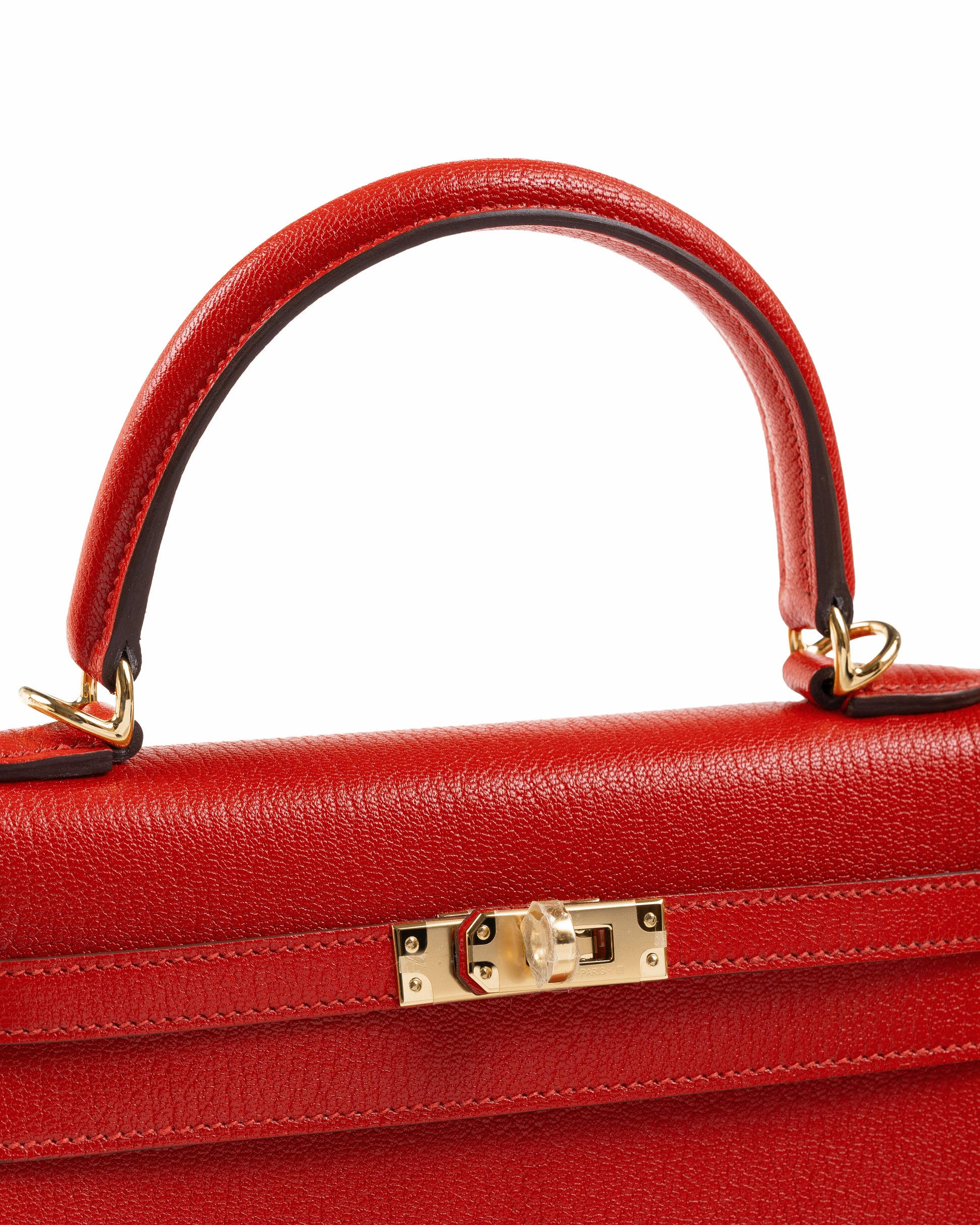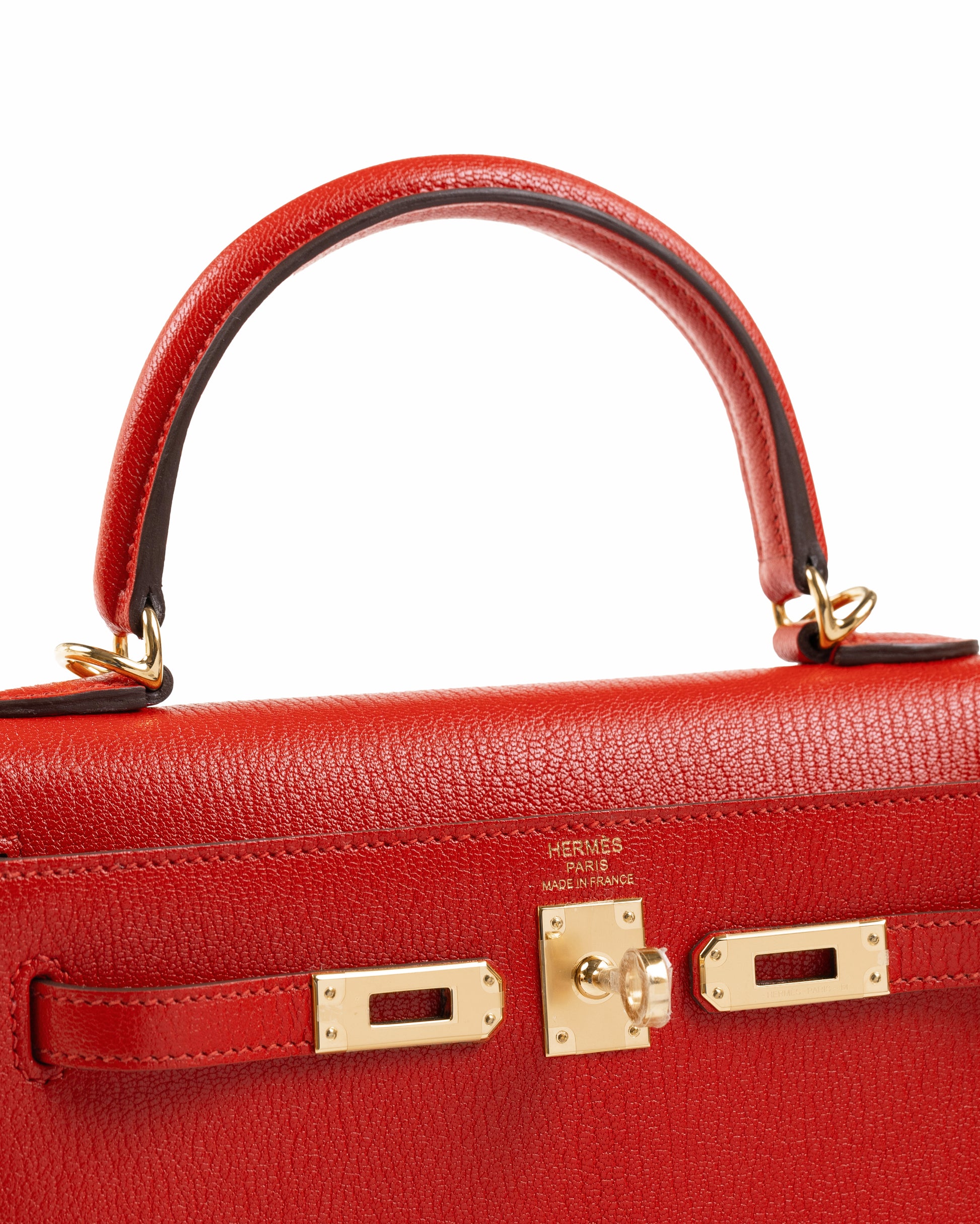 This Kelly is crafted in Chevre leather, a prized Hermès material known for its lightweight structure, durability, and beautiful natural sheen. It’s paired with warm gold hardware, enhancing the richness of the hue and giving the bag an elevated, collectible appeal.