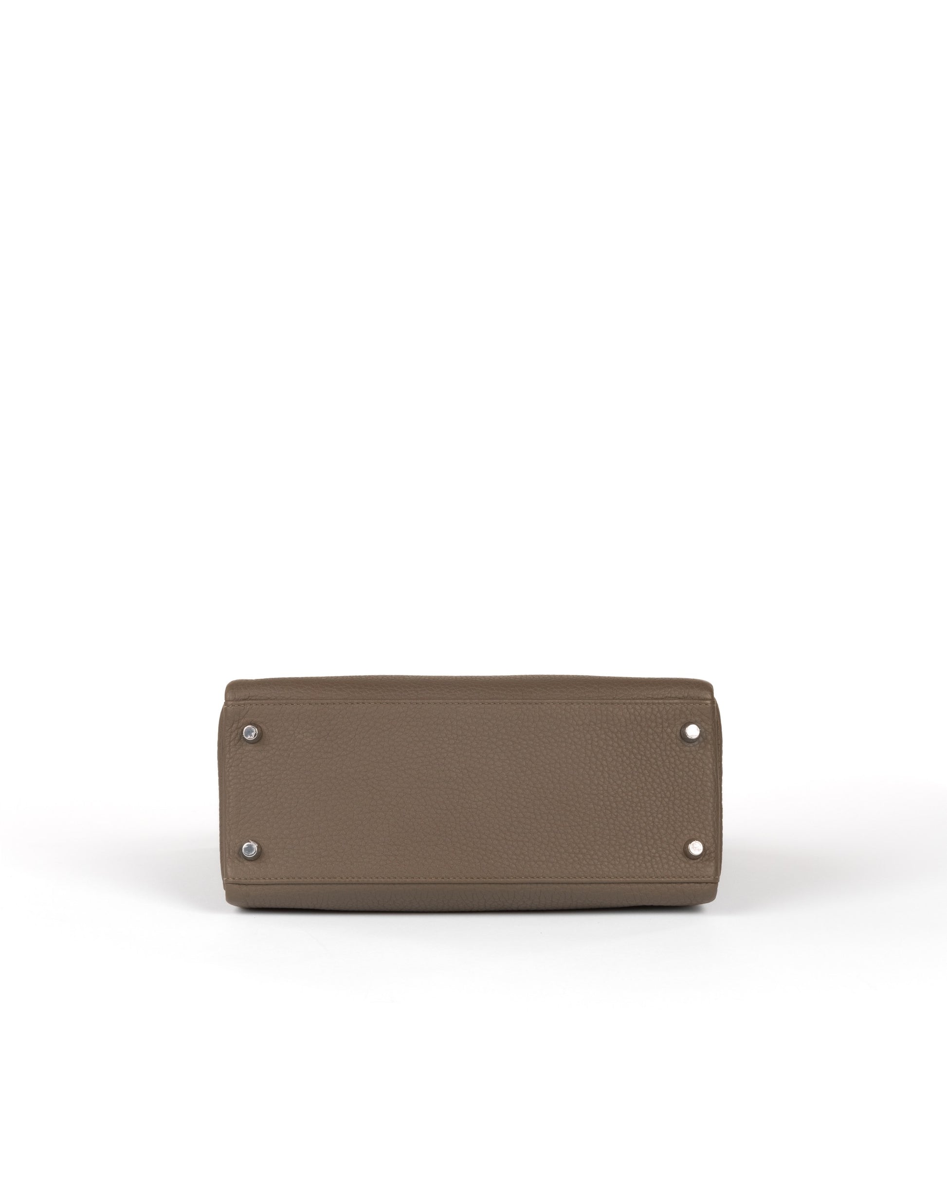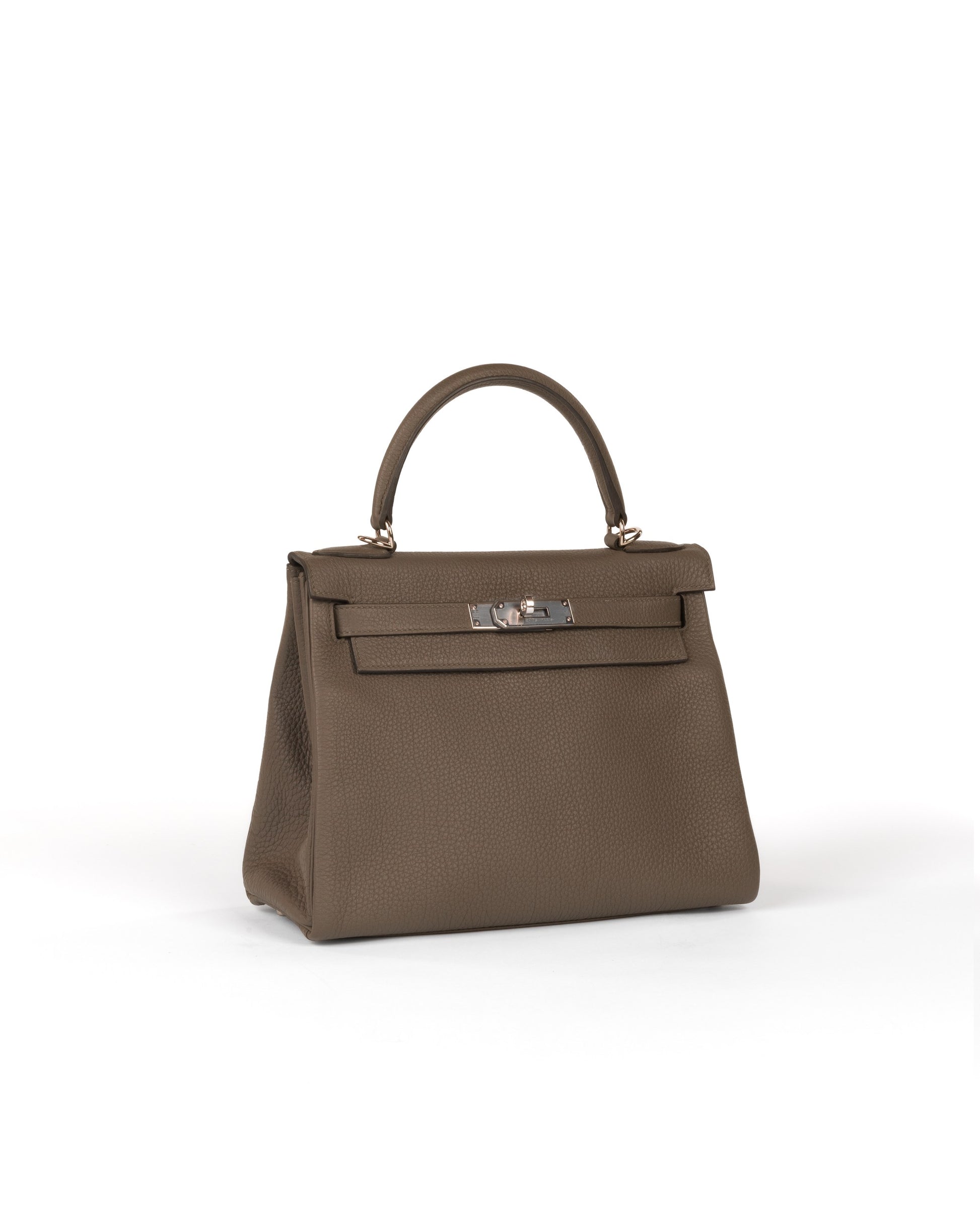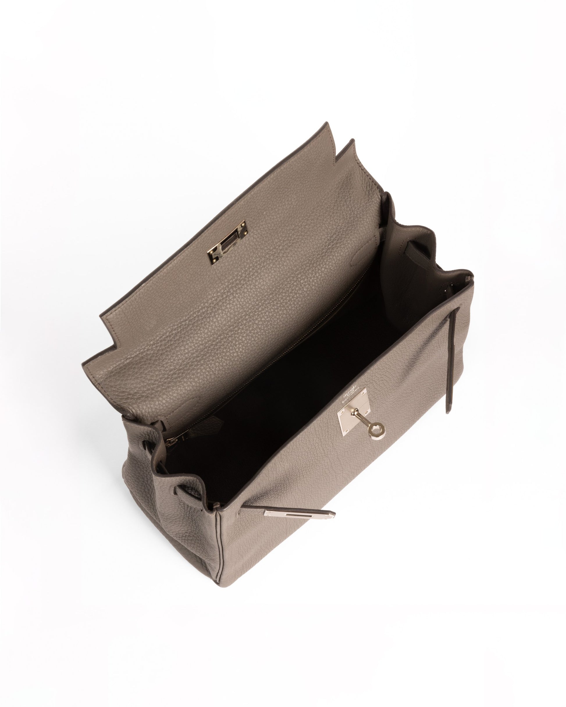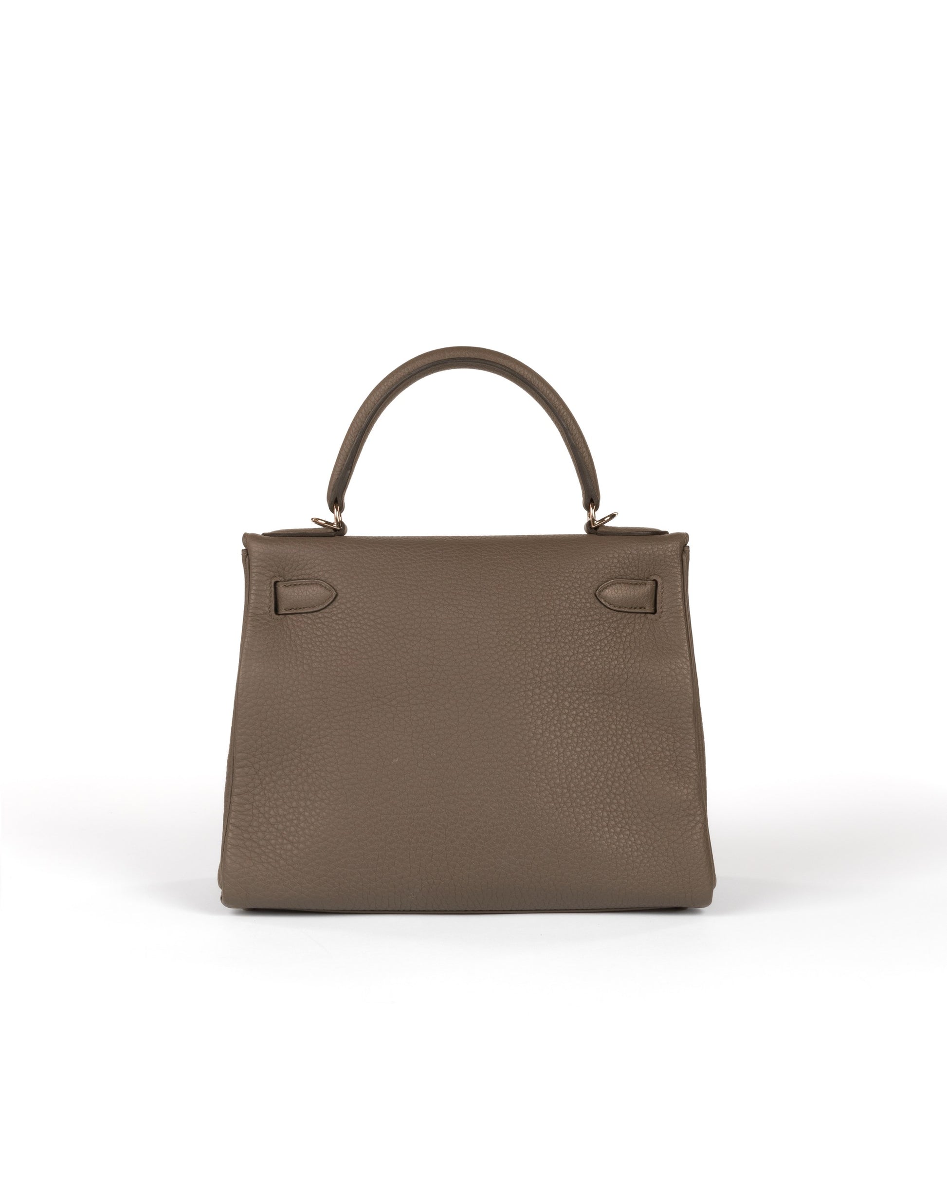 Crafted from Togo leather, this Kelly 28 is celebrated for its soft, pebbled texture and resilience. The leather is durable yet supple, allowing it to showcase the depth and richness of the Gris Etain color beautifully. The palladium hardware adds a contemporary edge, creating a sleek contrast against the muted grey leather.
