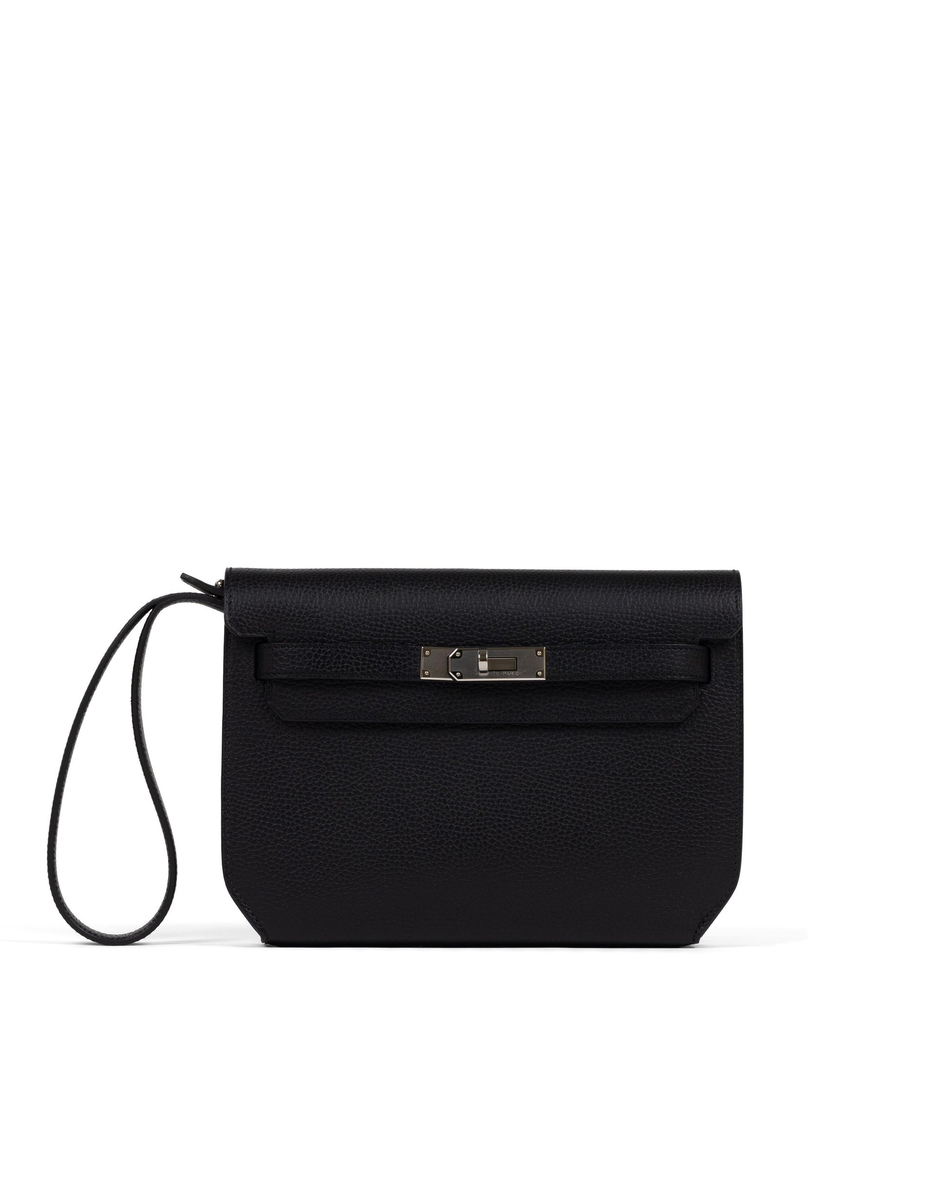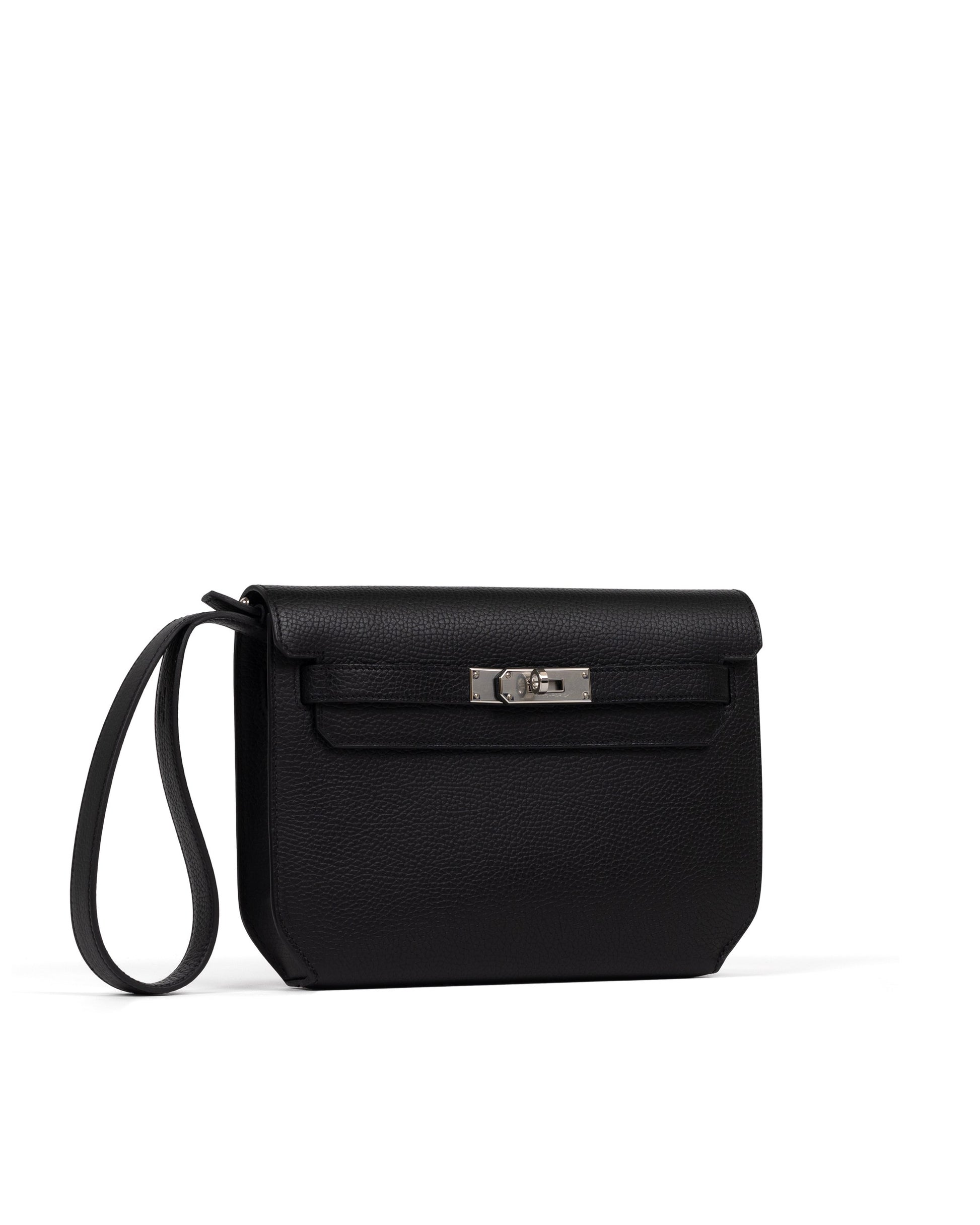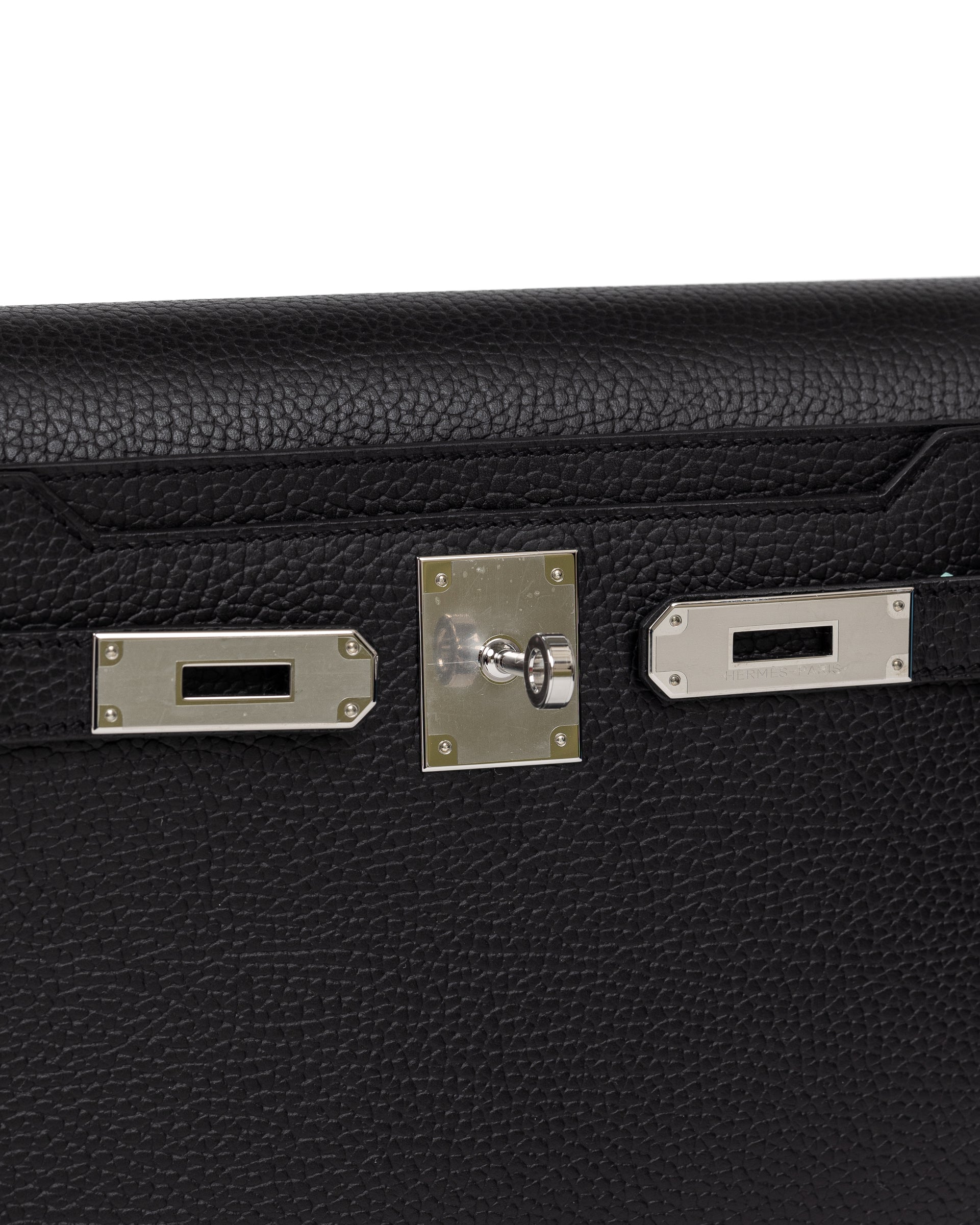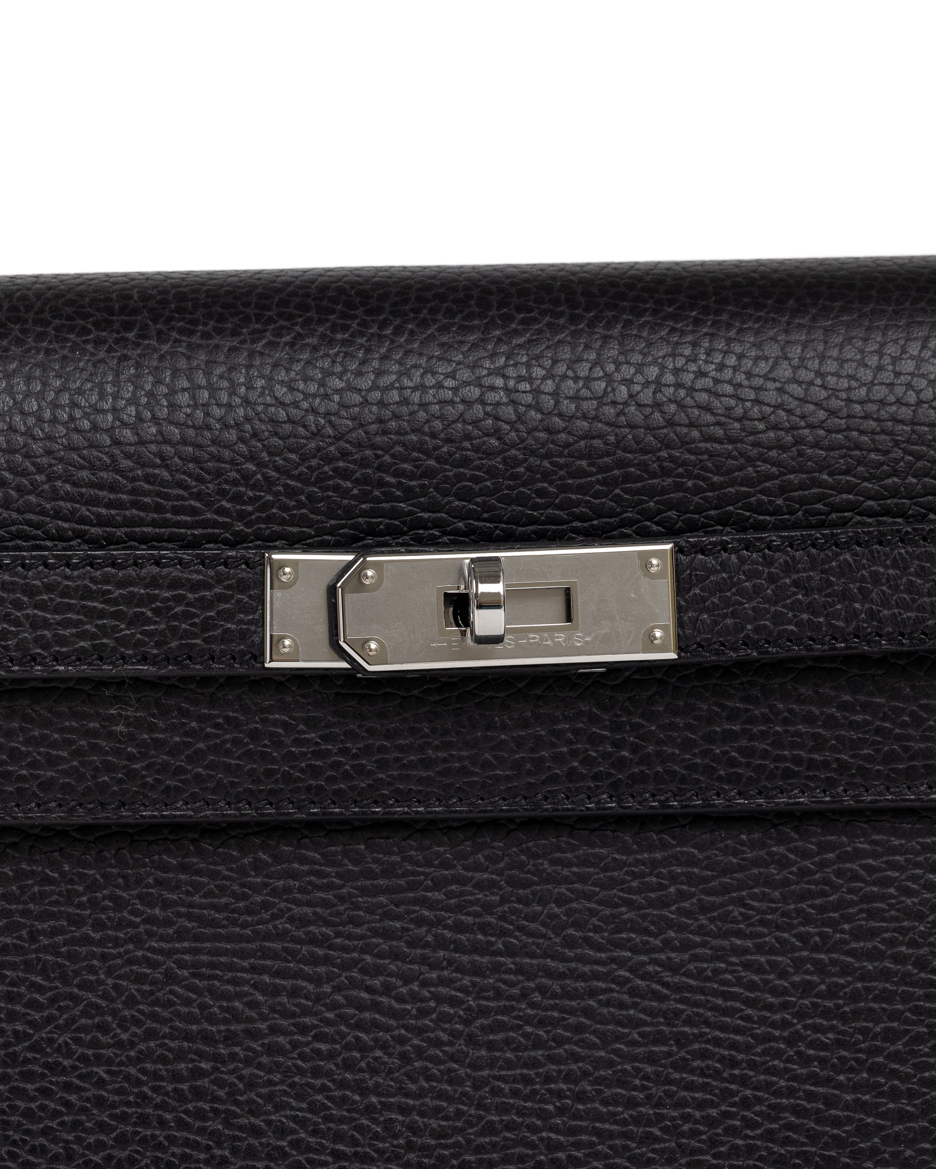 The Hermès Kelly Dépêches 25 in Black Galop Leather with Palladium Hardware is a sophisticated reinterpretation of the classic Kelly bag, blending functionality with timeless elegance. Designed as the ultimate structured briefcase-style handbag, this piece is perfect for those seeking luxury with practicality, whether for business or everyday use.