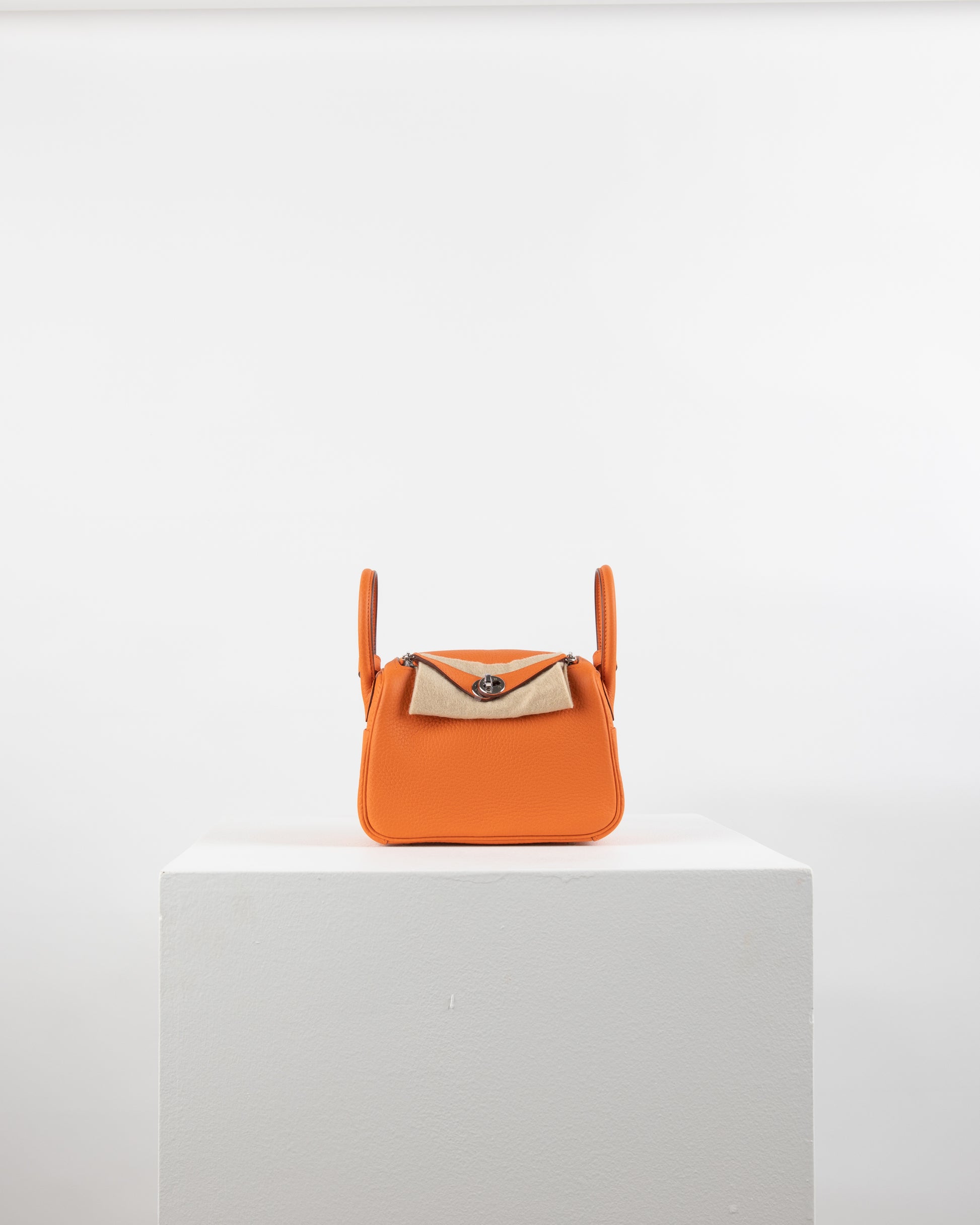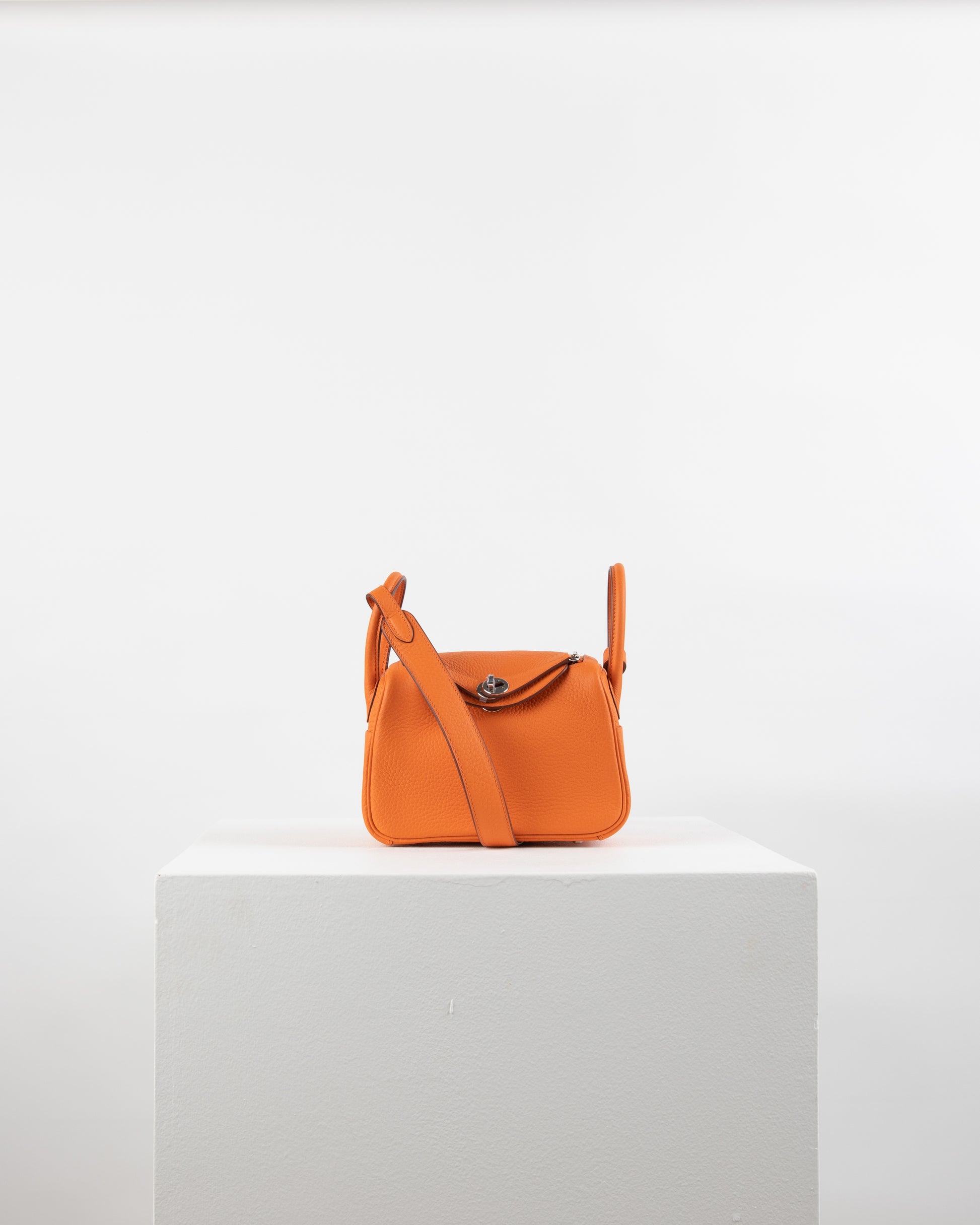 Introducing our Mini Lindy - crafted with the finest Clemence leather, renowned for its durability and luxurious texture. It features a stunning fiery shade aptly named "Orange," with the perfect finishing touch in Palladium Hardware. The interior is lined in a buttery Orange and has one zip pocket with an Hermès engraved pull, along with two open pockets on the opposite side.