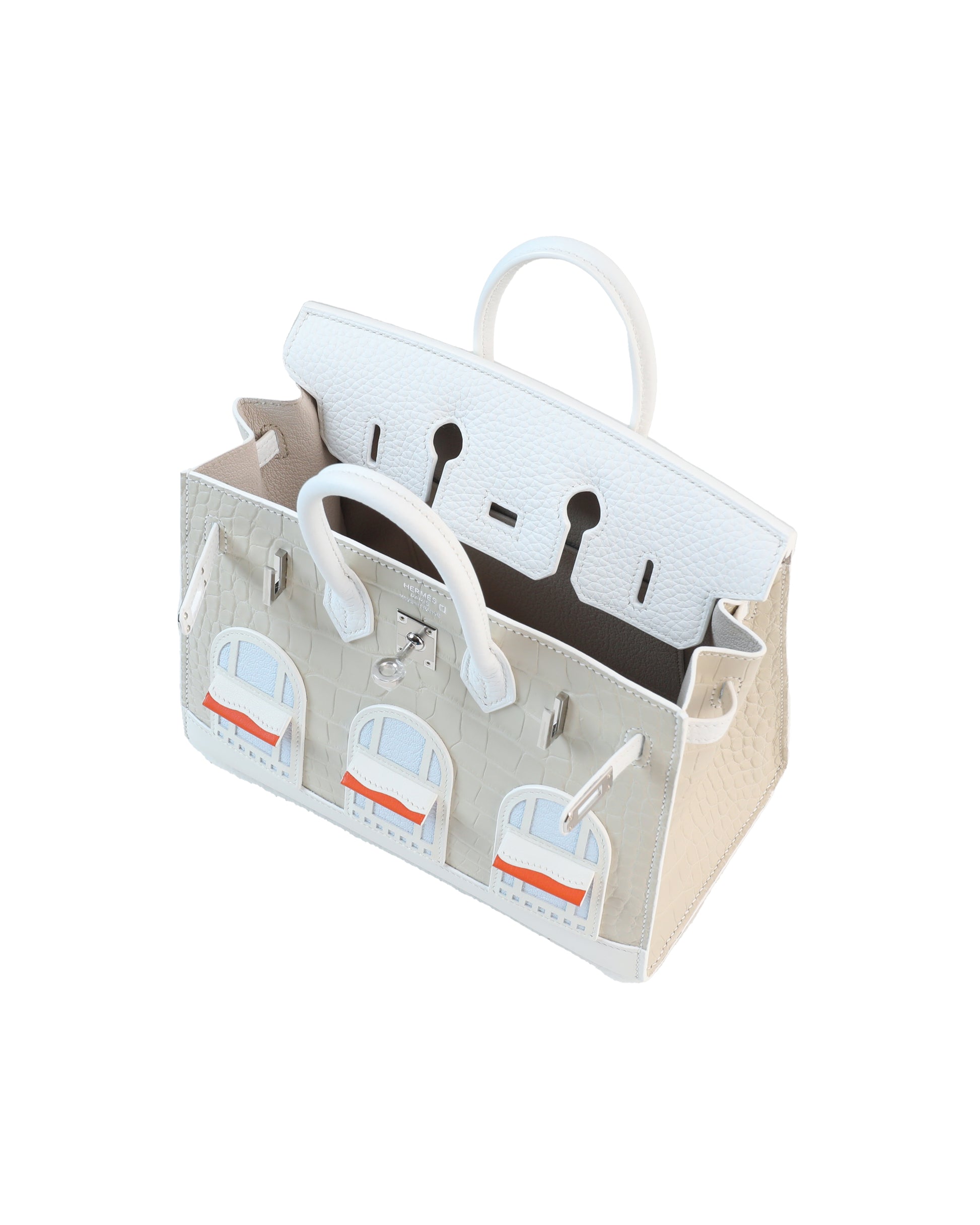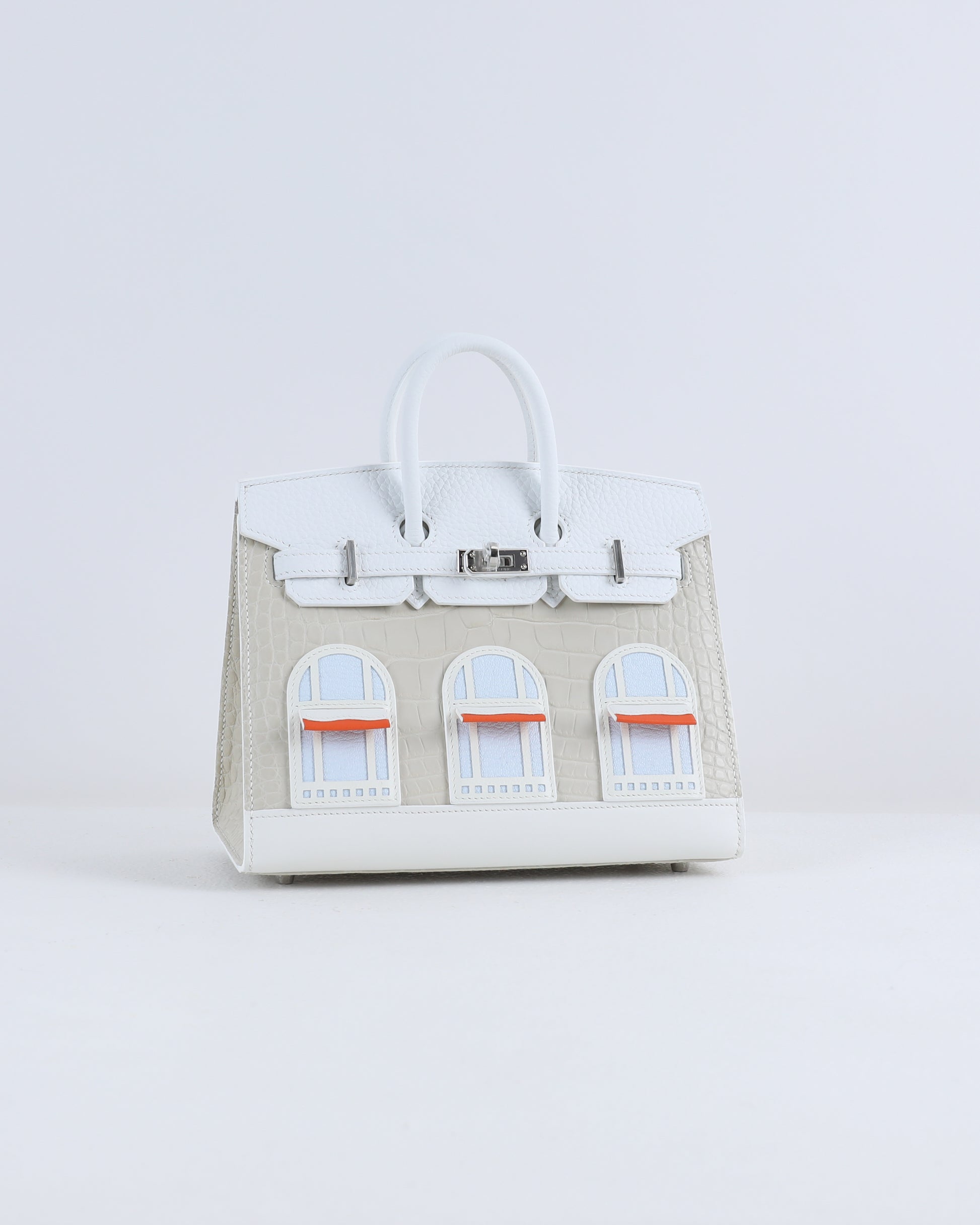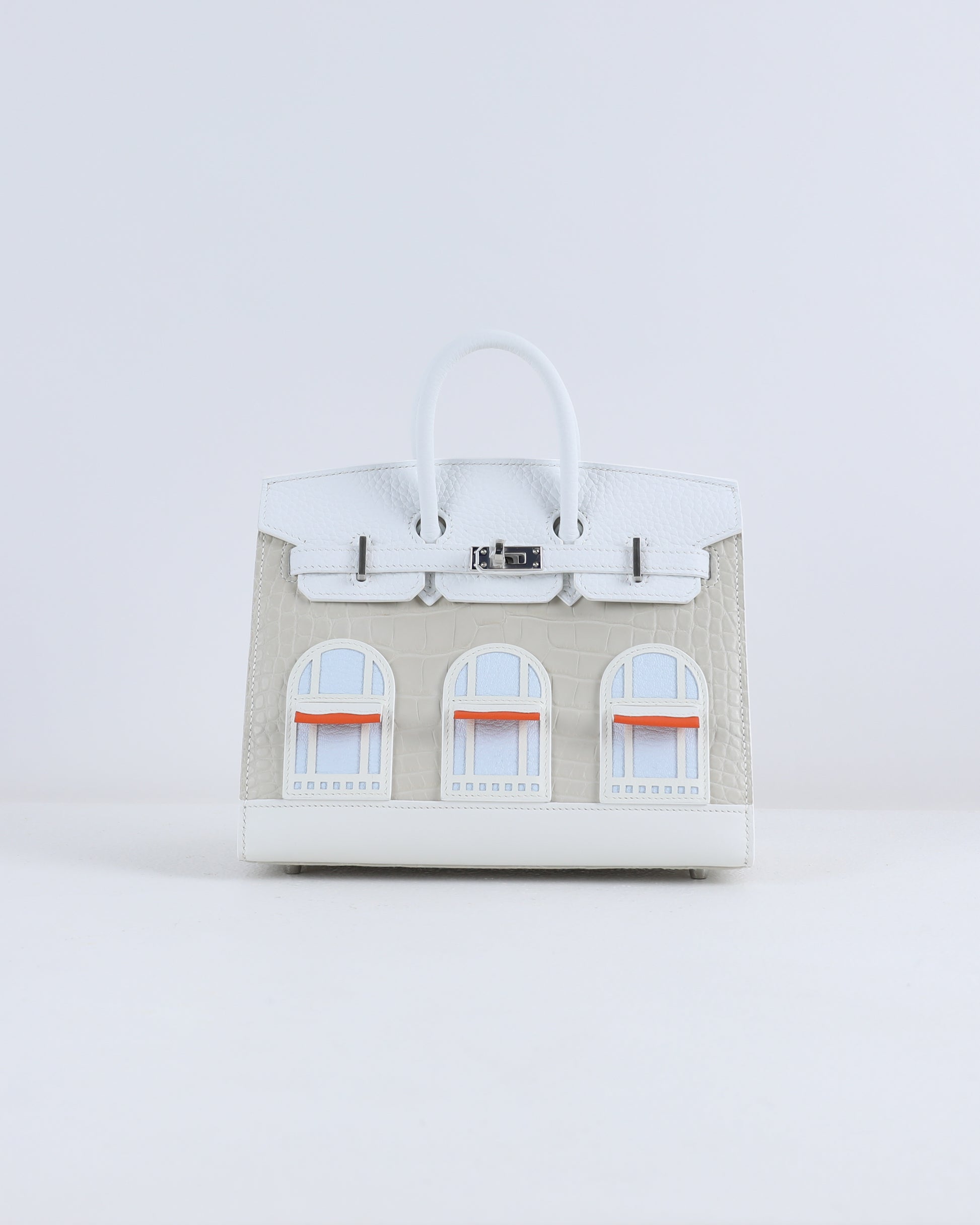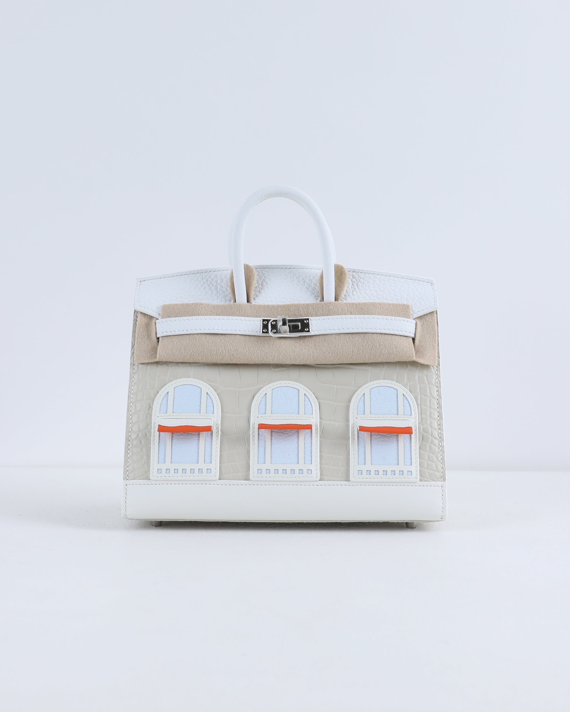 The Faubourg Birkin is a special tribute to Hermès' flagship store in Paris. It was introduced in 2019, featuring a 20 cm size crafted in their Sellier fabrication. The design replicates the building's facade, with orange awnings and a key clochette resembling the iconic orange shopping bag. The bag's exterior combines five contrasting leathers, including Matte Alligator, Veau Madame, Epsom, Sombrero, and Swift, while the interior is lined with luxurious Chèvre Mysore. The Faubourg Birkin quickly became highly sought after, joining the ranks of Hermès' legendary Himalaya Birkin and Kelly bags.