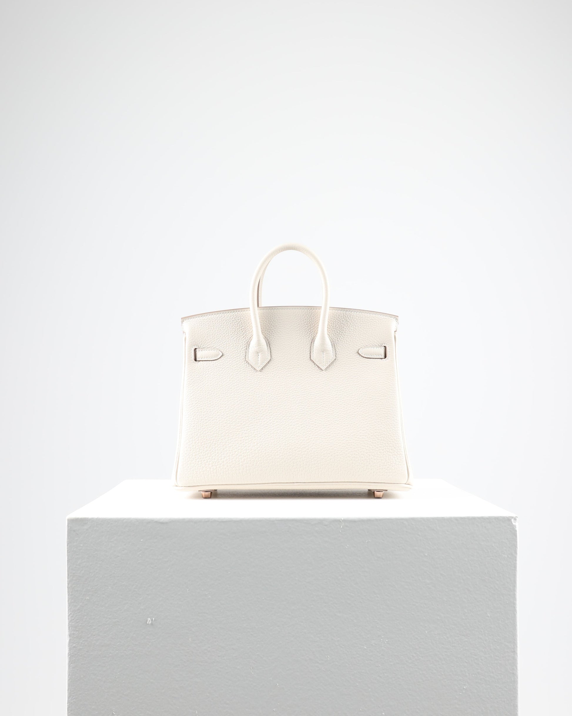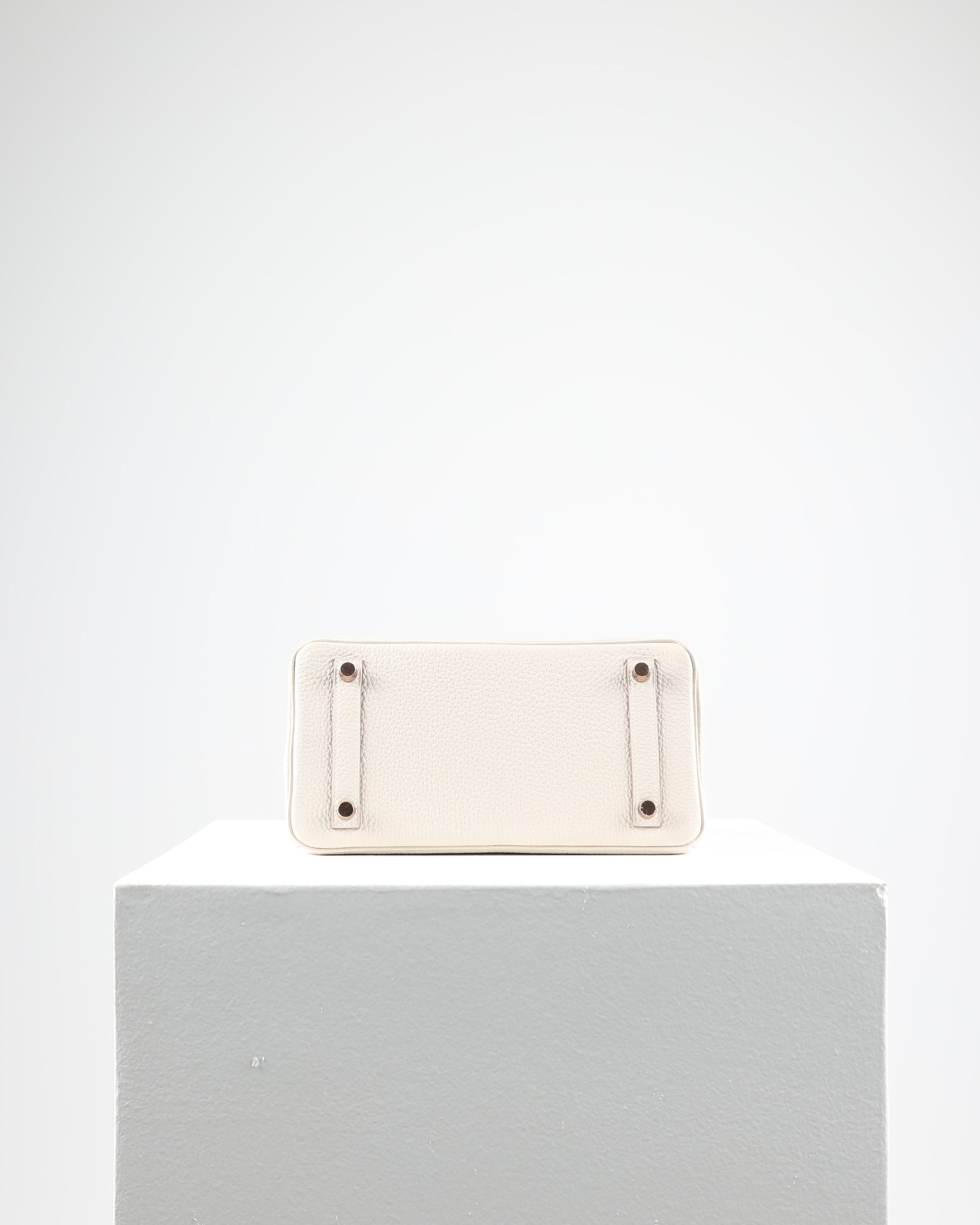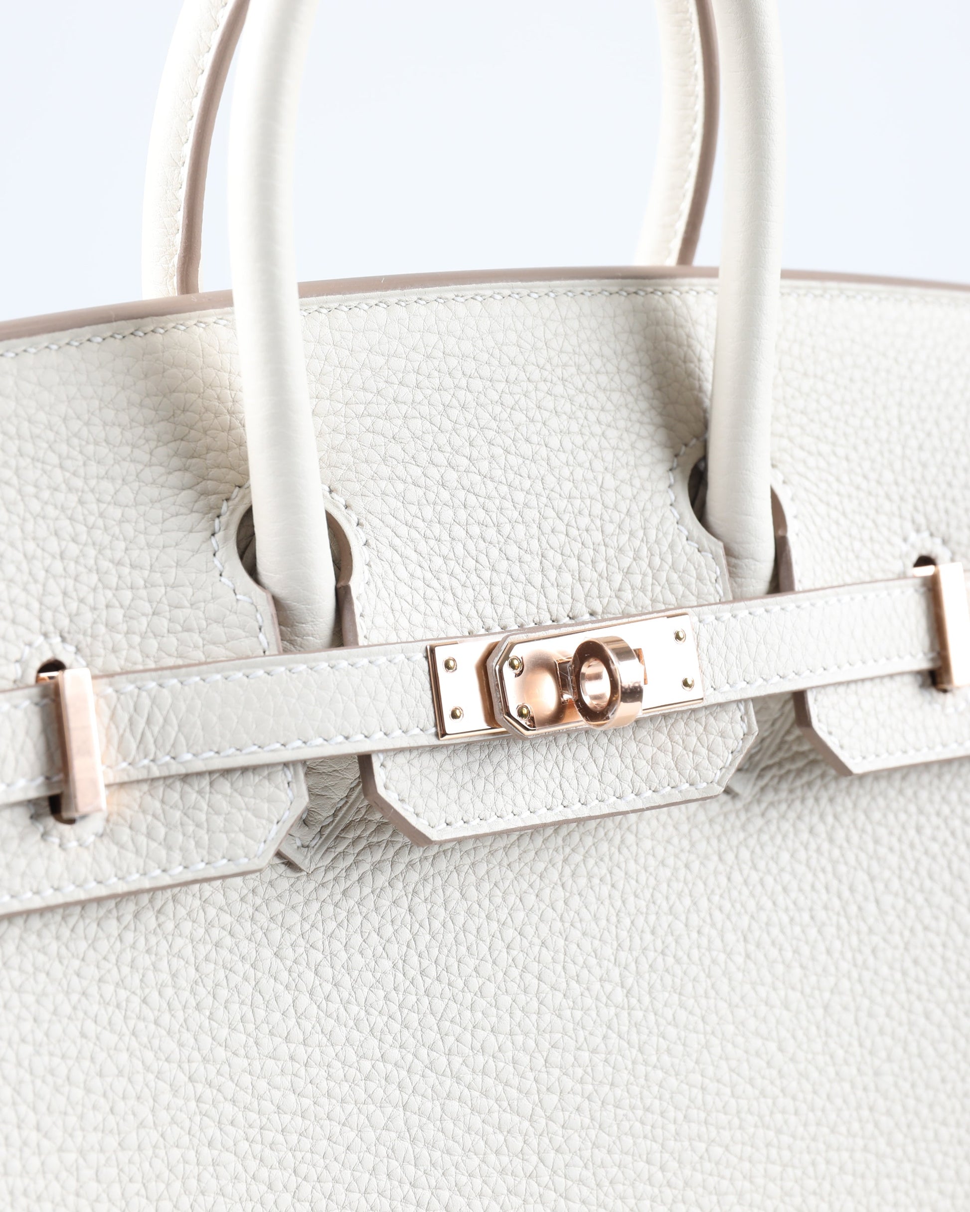Our Birkin 25 in Craie with gold hardware is a stunning and rare collector's piece, crafted with Togo leather. Togo leather is known for its natural grain and durability, making it a popular choice for collectors' handbags. The leather is carefully selected and tanned to create a soft yet sturdy material that ages beautifully over time.