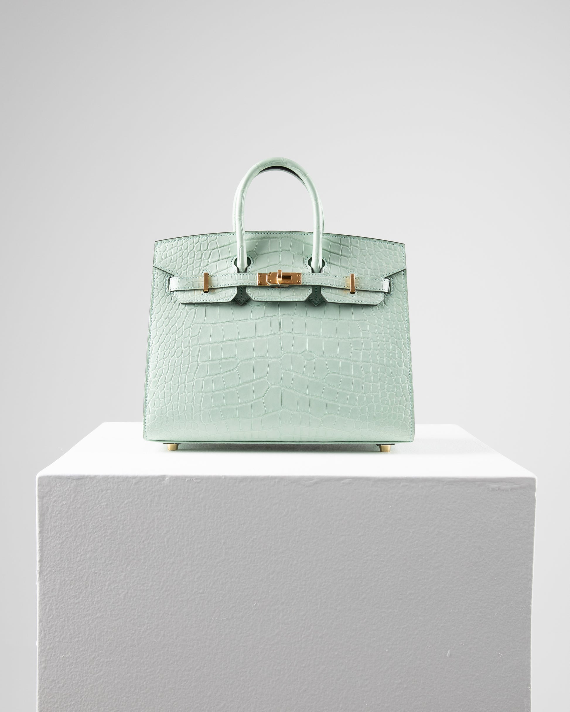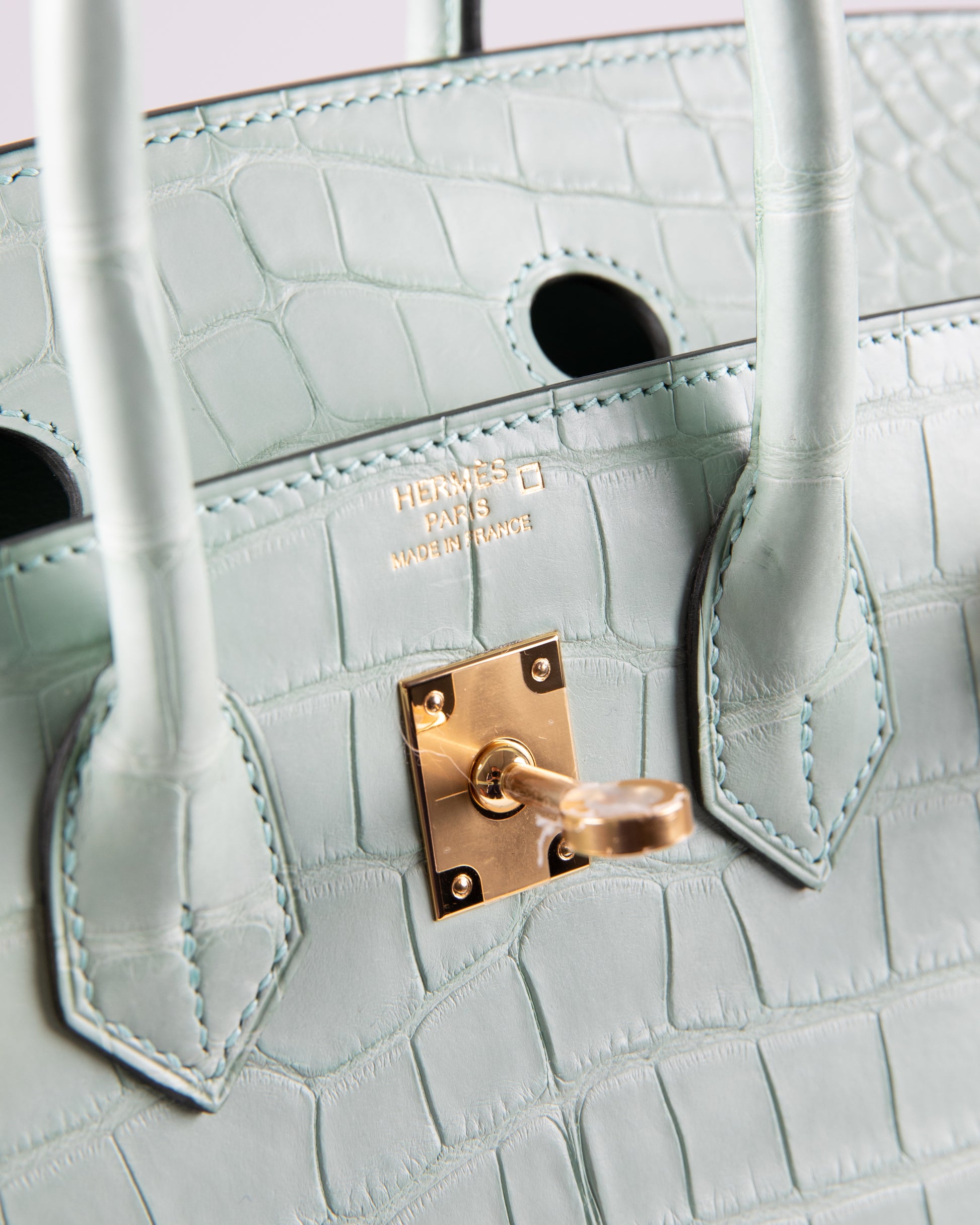 This Birkin 25 is crafted with matte Alligator in Vert D'Eau, and complimented with gold hardware. It features two front straps with front toggle closure, a single rolled handle and a removable shoulder strap.