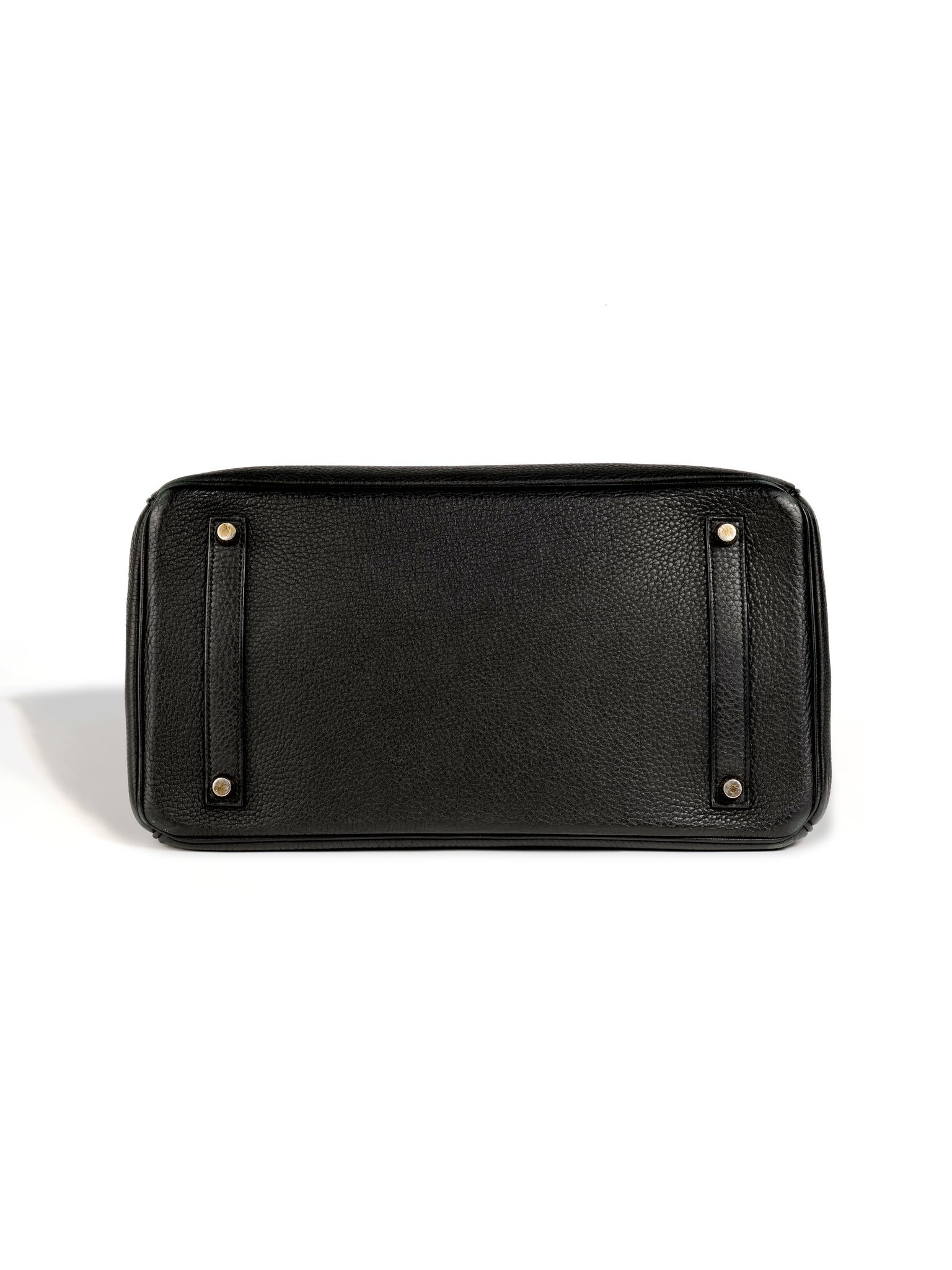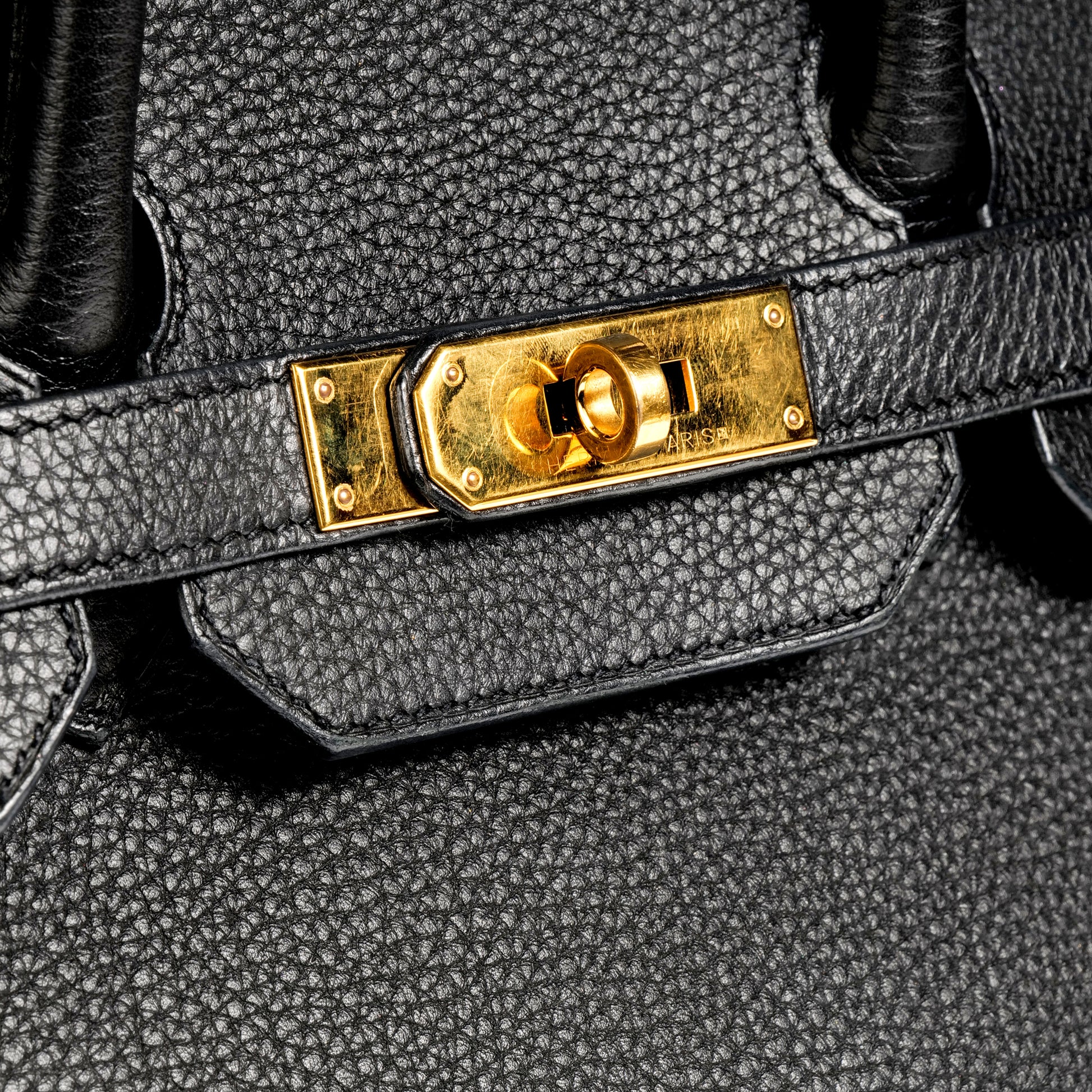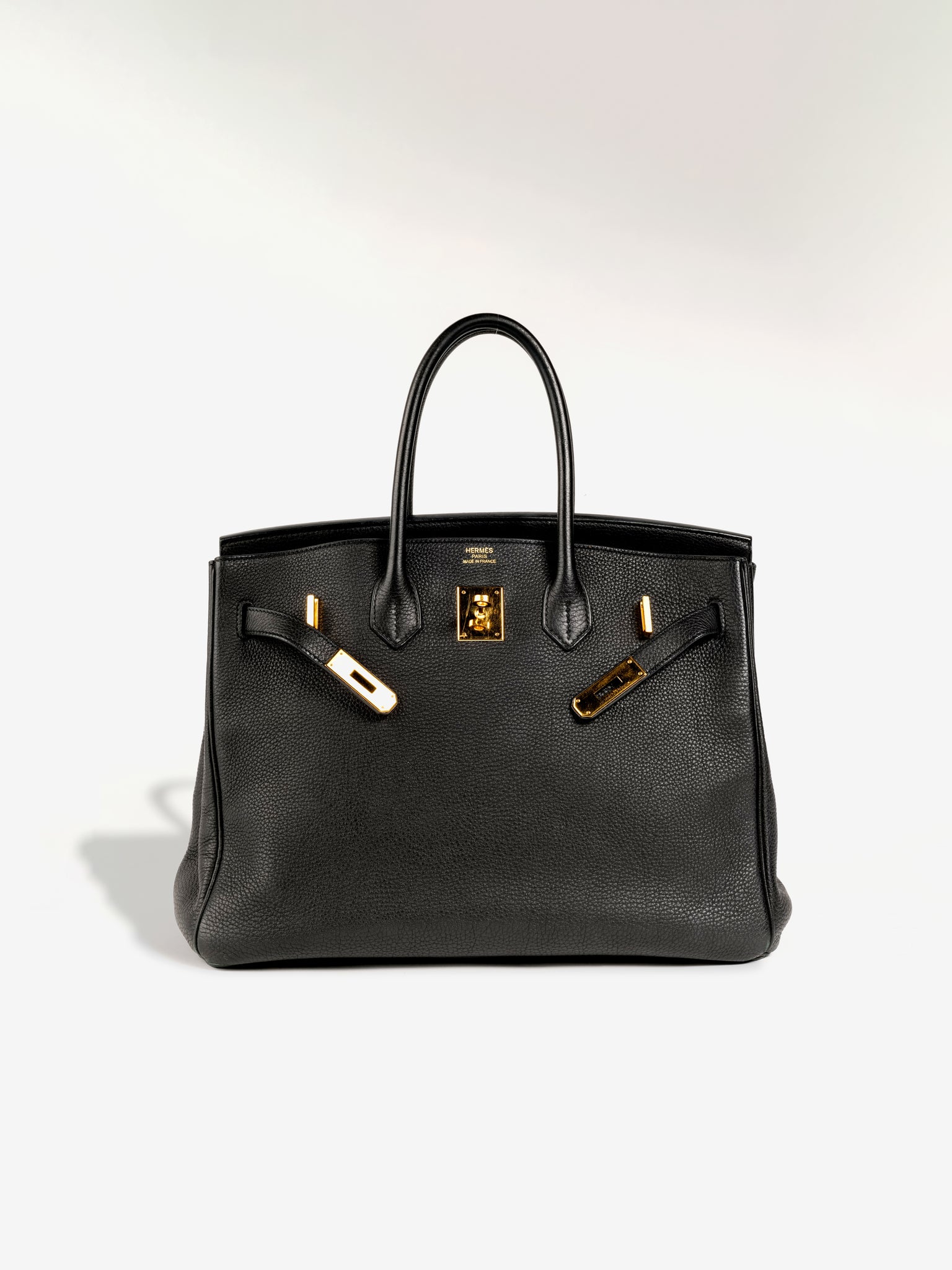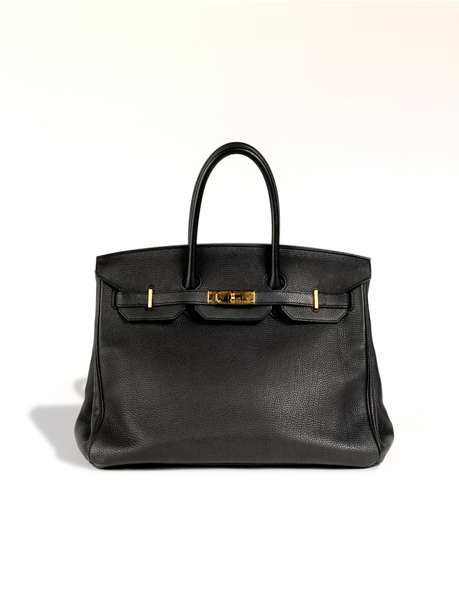 This Birkin 35 is crafted with classic Black Togo leather and complemented with gold hardware. It features tonal stitching, a front flap, two straps with center toggle closure, a clochette with a lock and two keys, and double rolled handles.