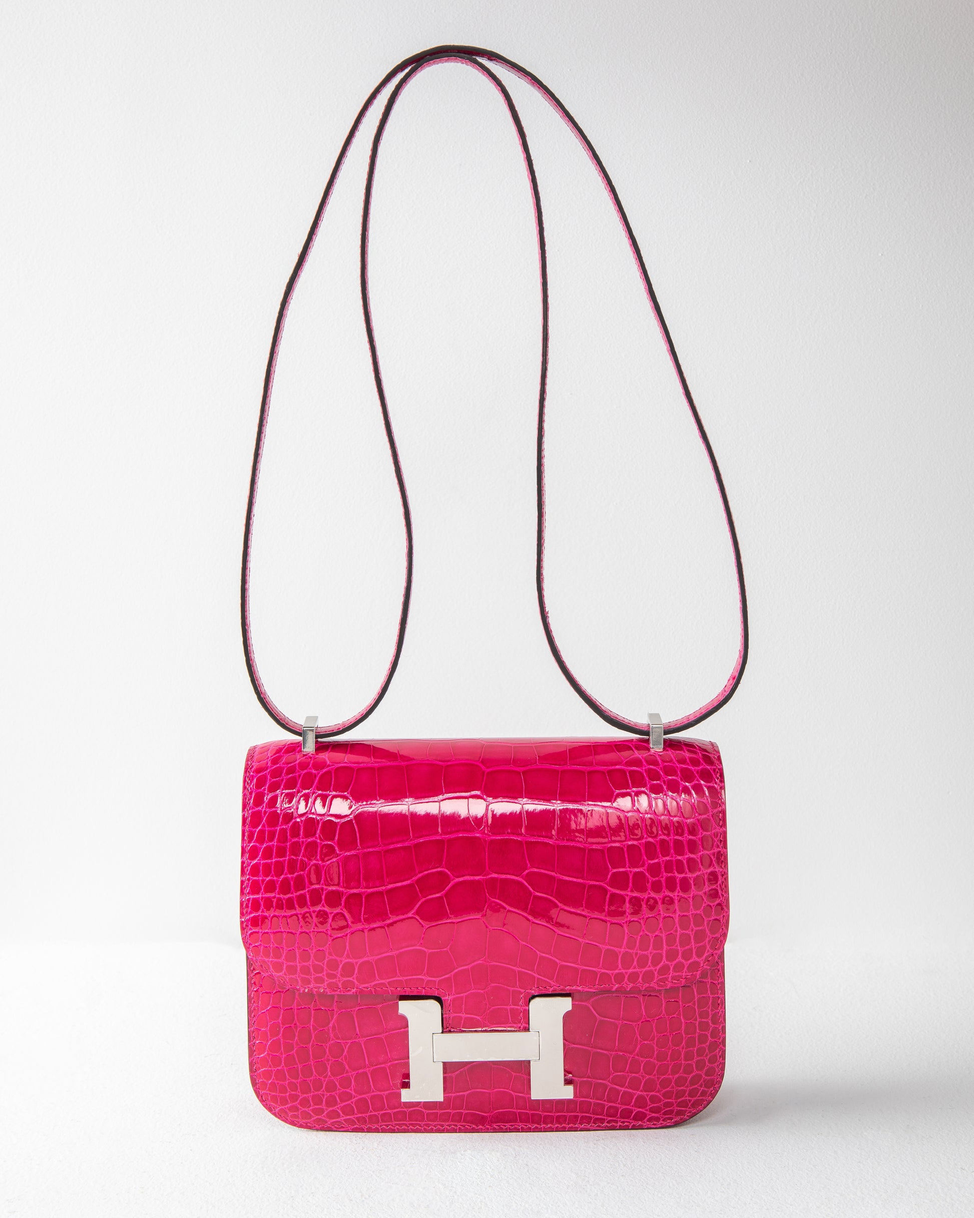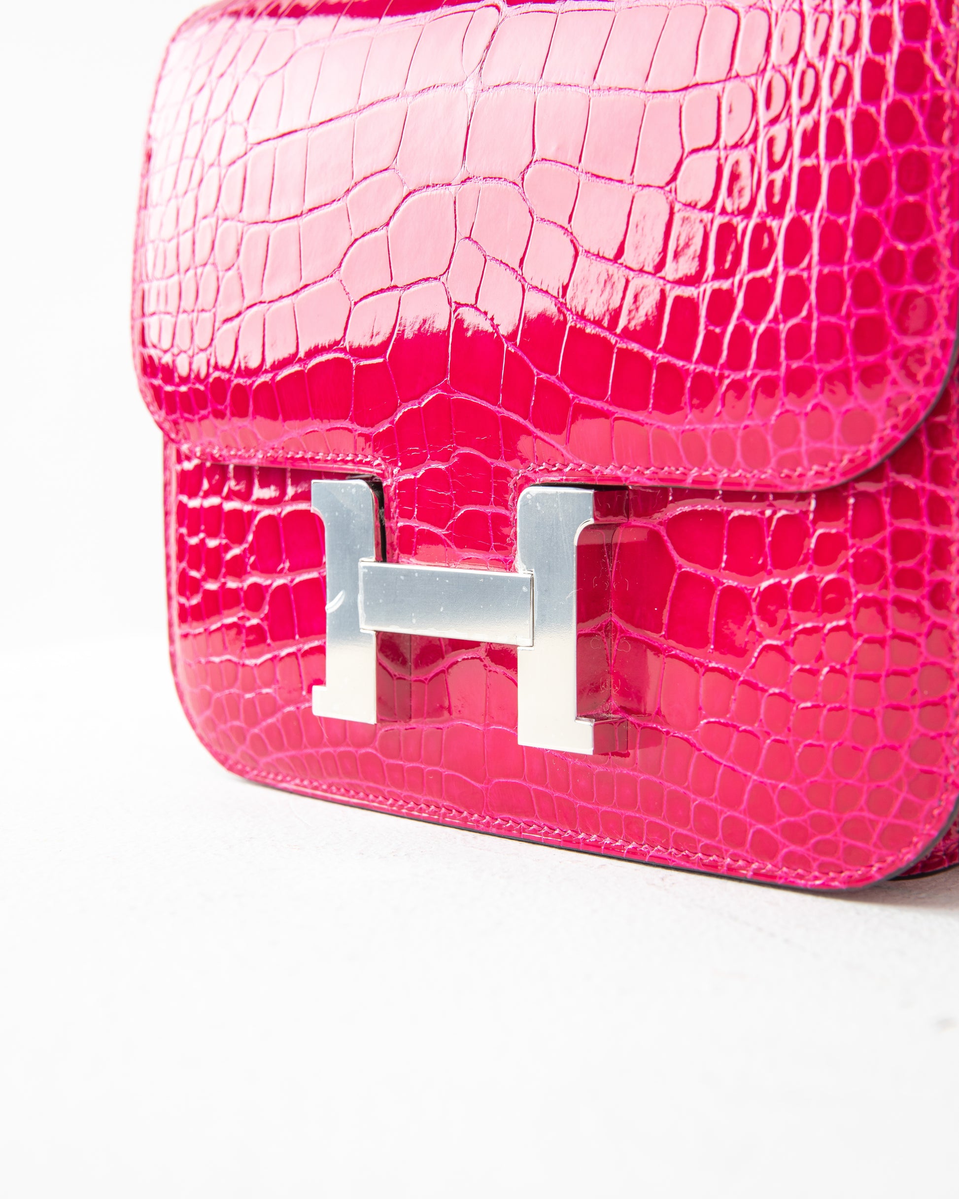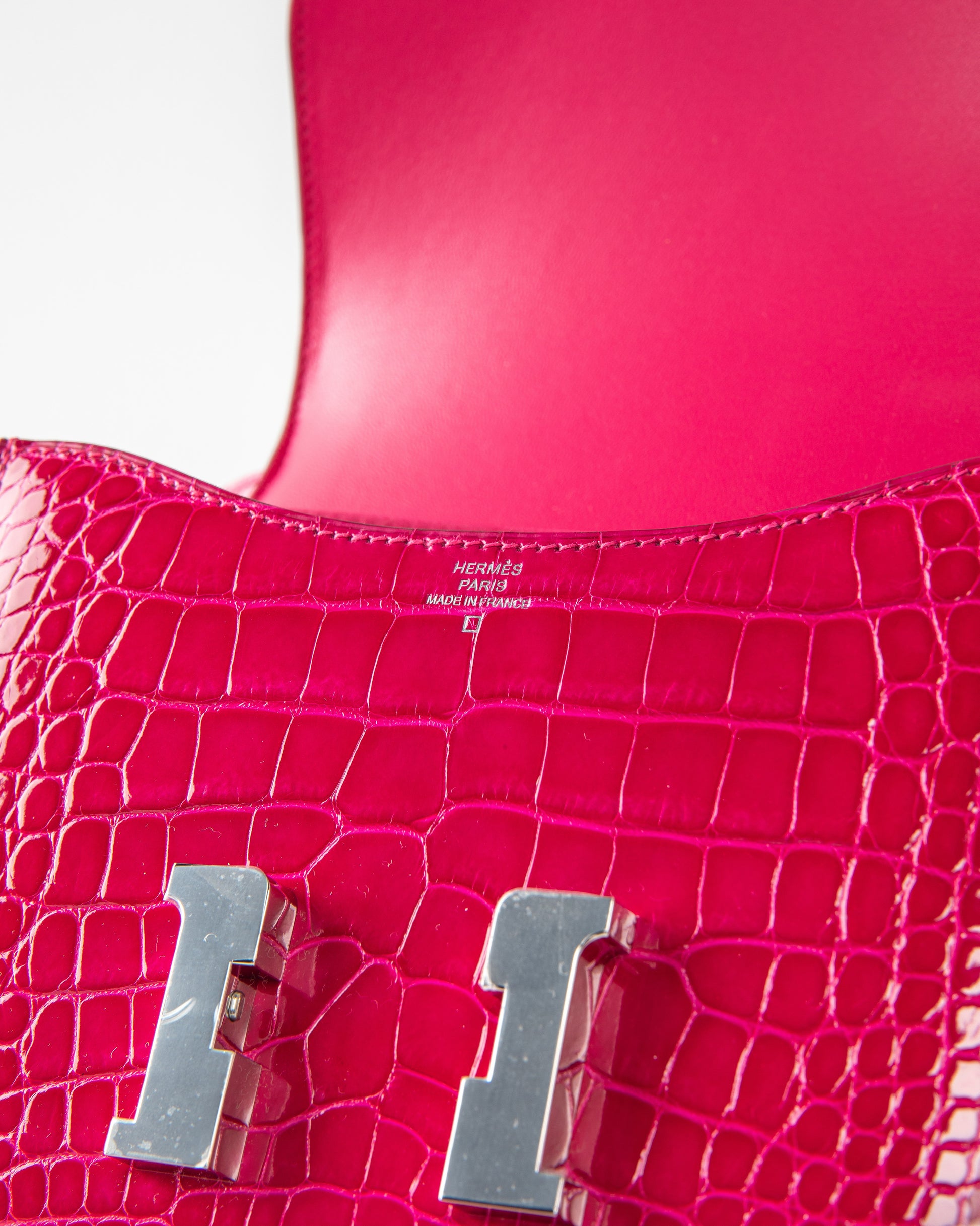 Initially released during the F/W 2020, Rose Mexico is a bright magenta pink. The beauty of this color is further accentuated through handcrafted shiny Crocodile leather. This Constance is crafted with bright Rose Mexico shiny Crocodile leather and accented with palladium hardware.