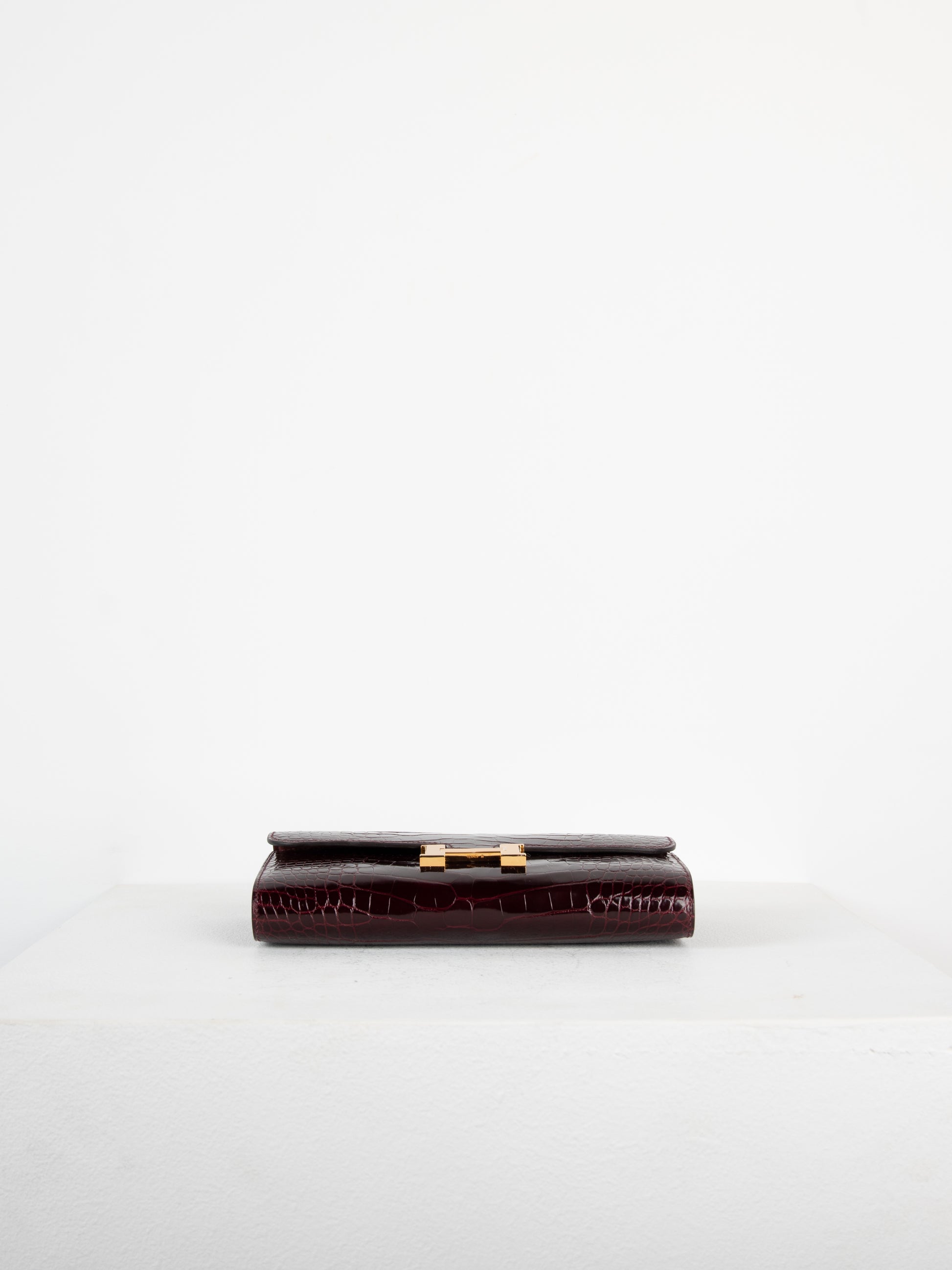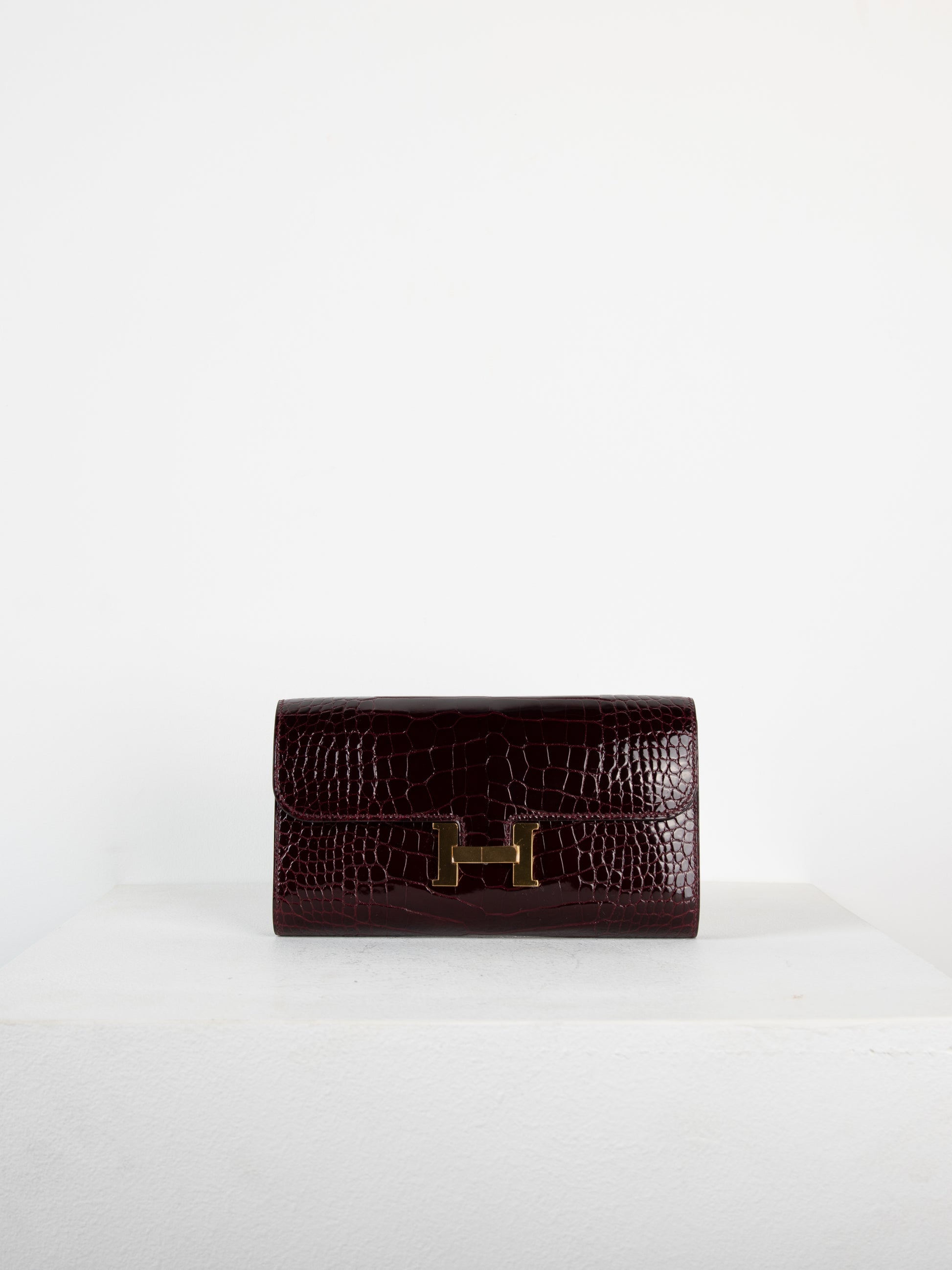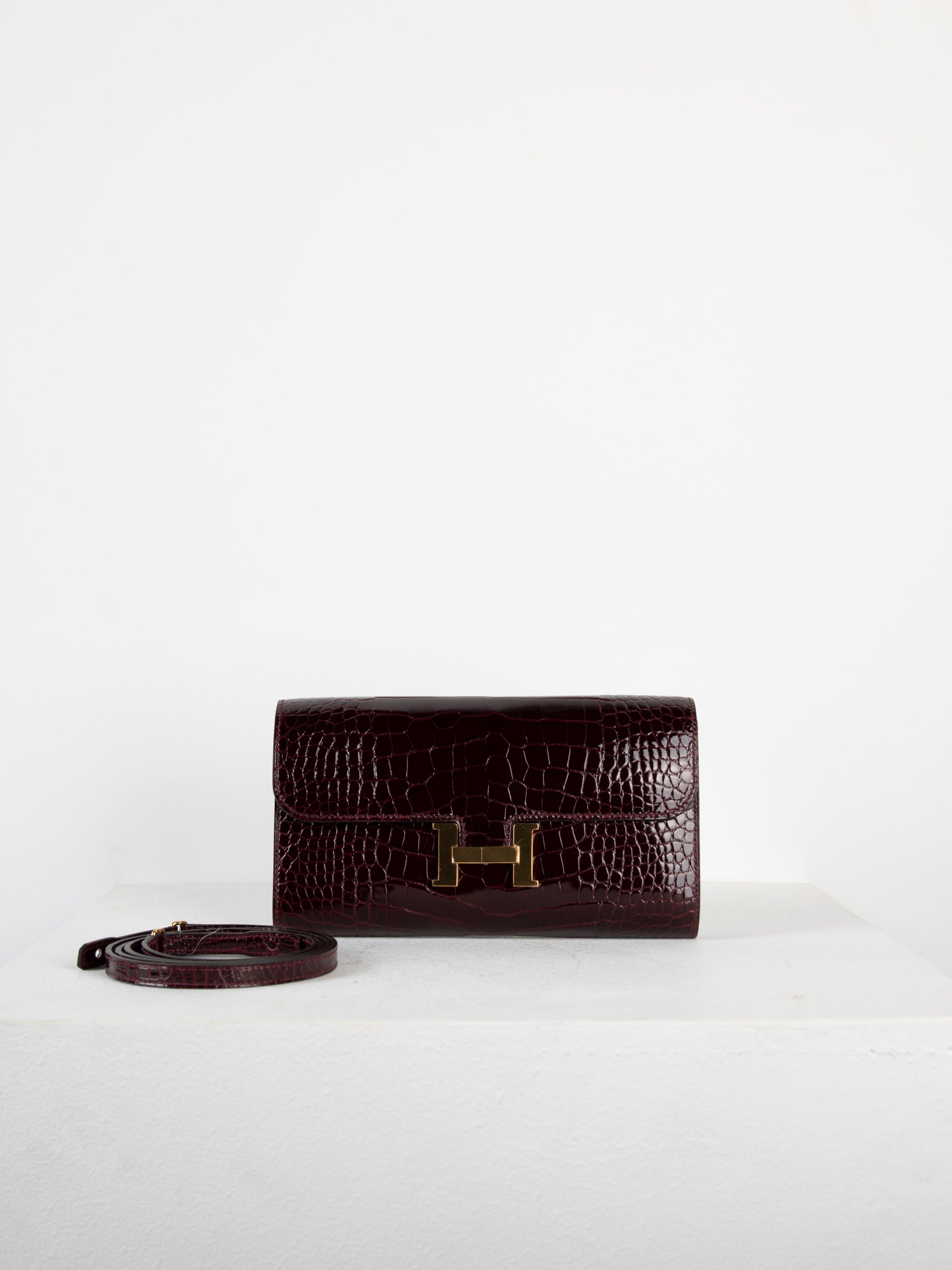 This stunning Constance To Go is in Bordeaux Shiny Alligator with Gold Hardware.