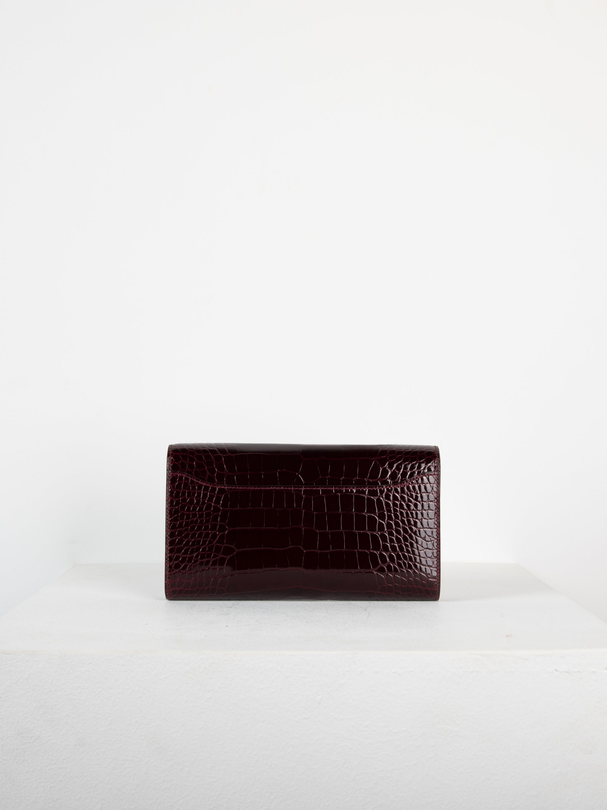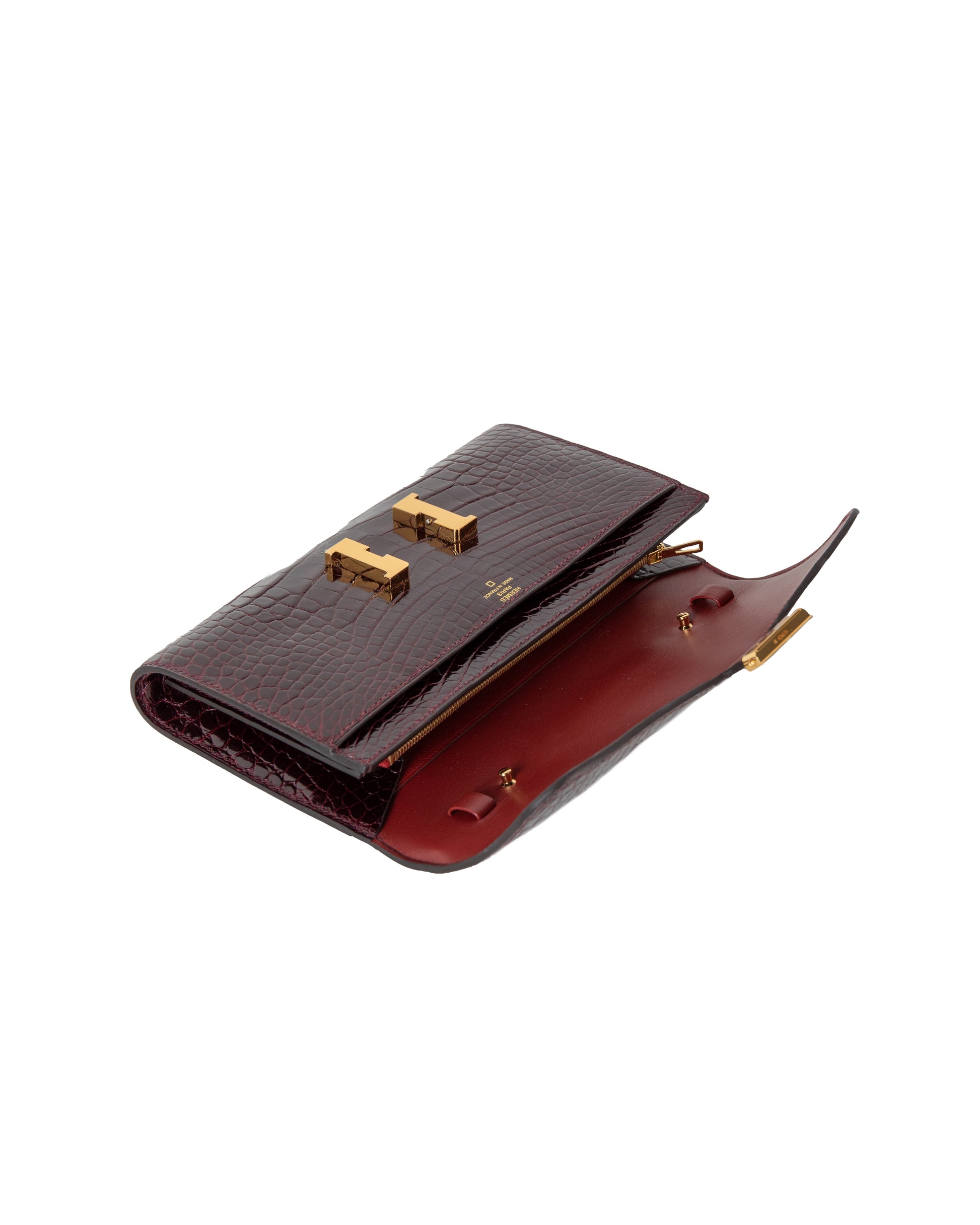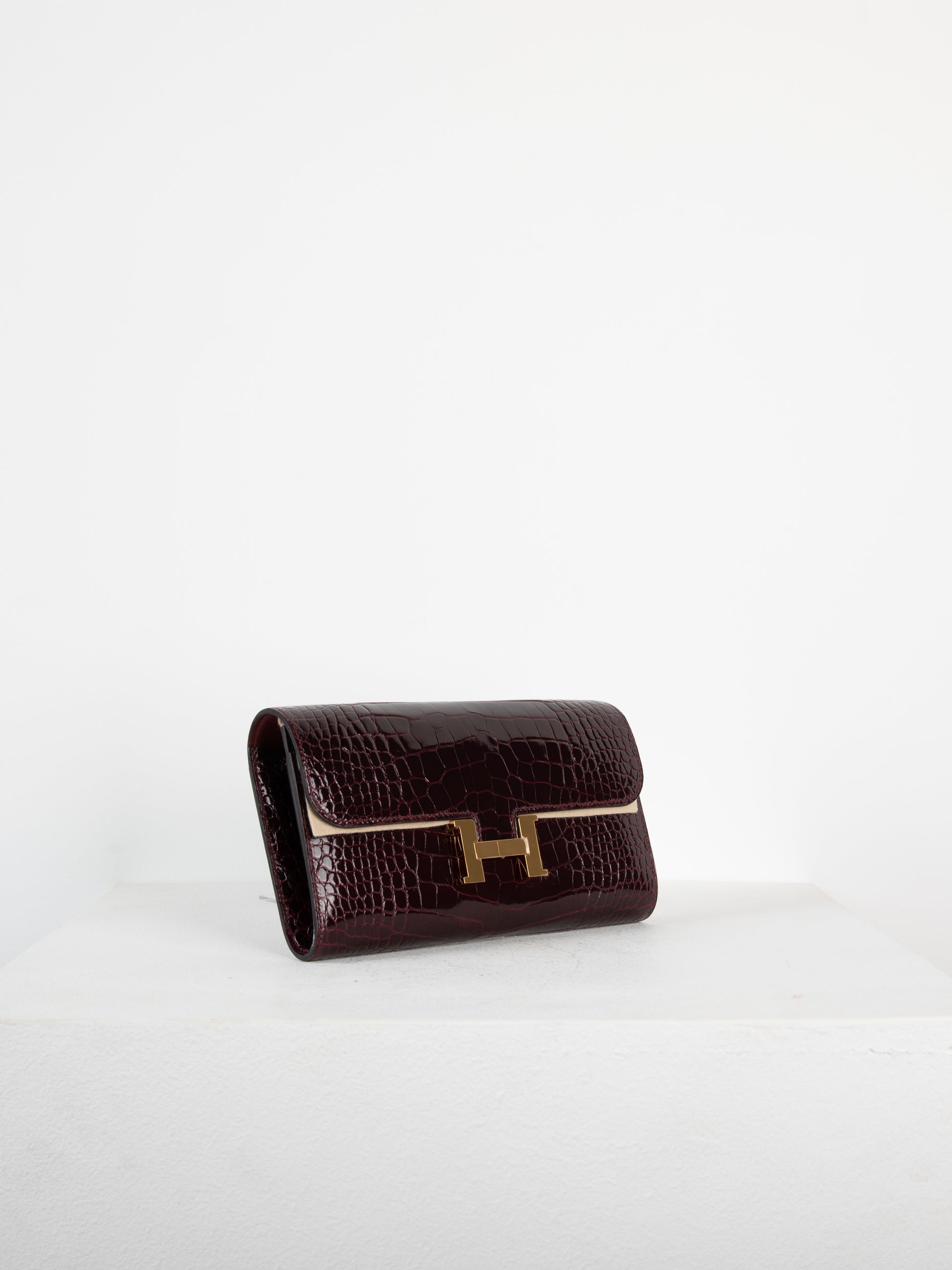 This stunning Constance To Go is in Bordeaux Shiny Alligator with Gold Hardware.