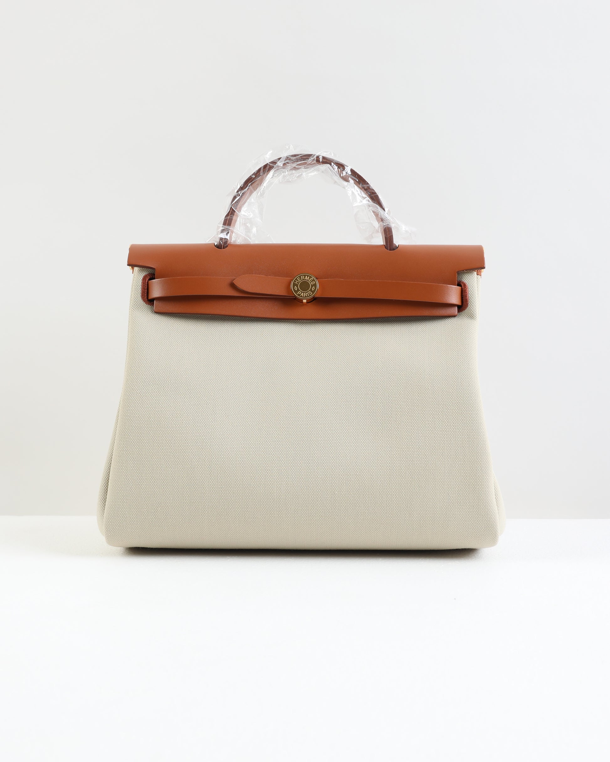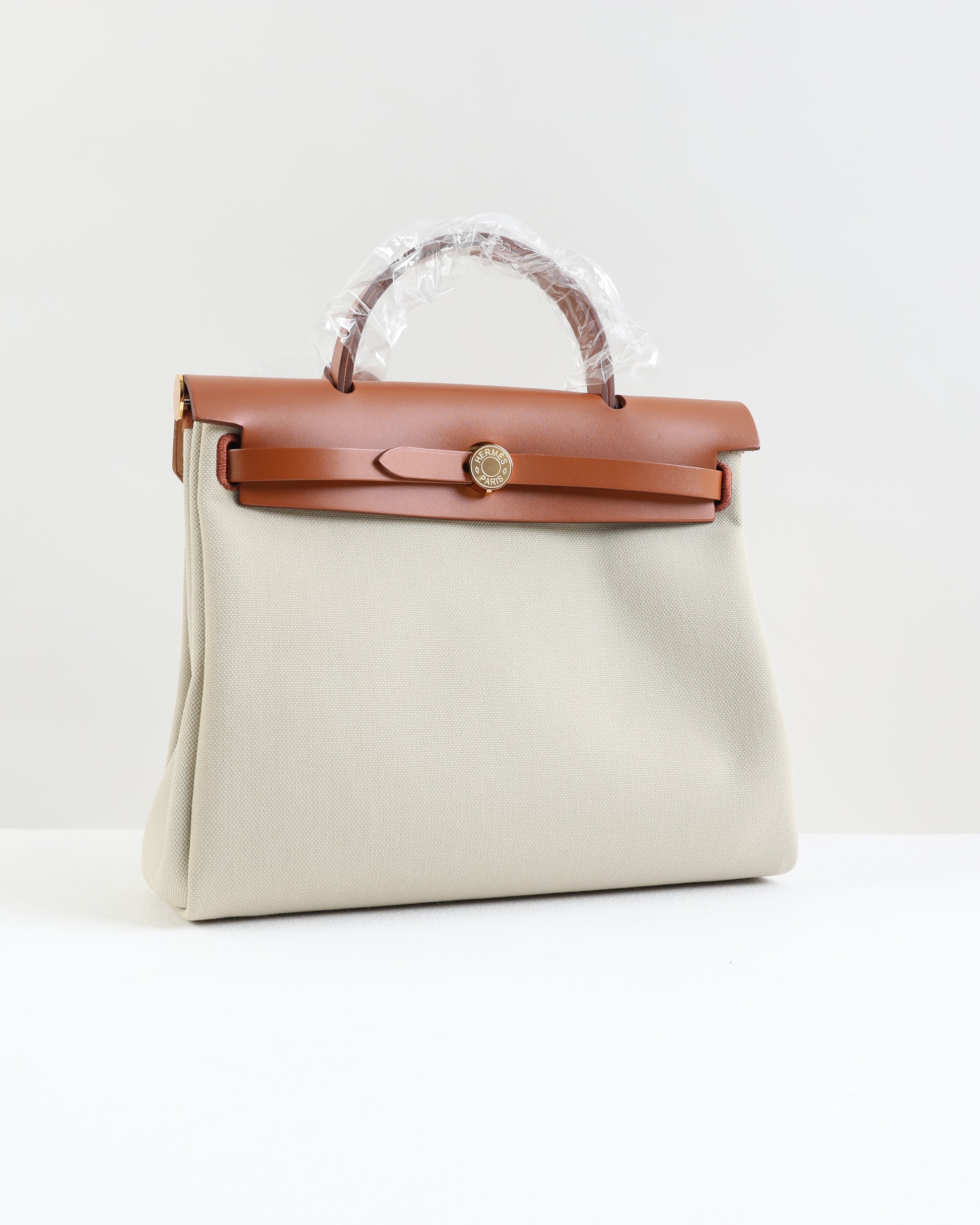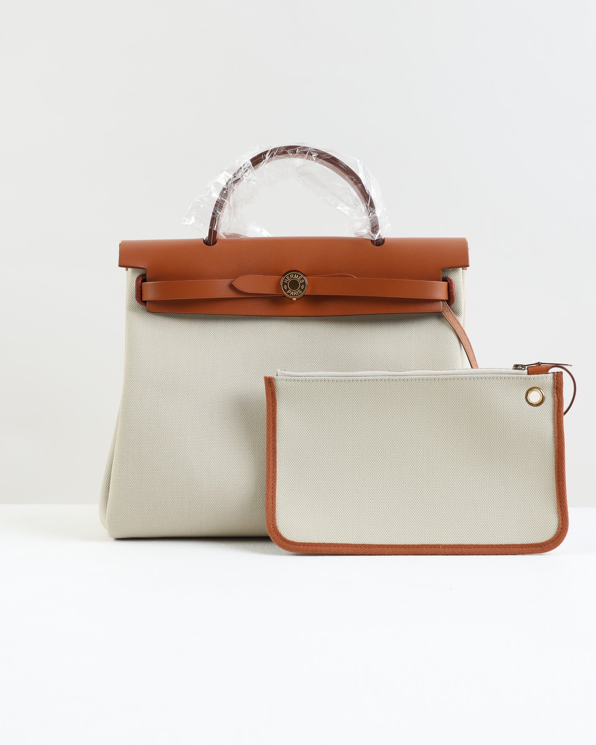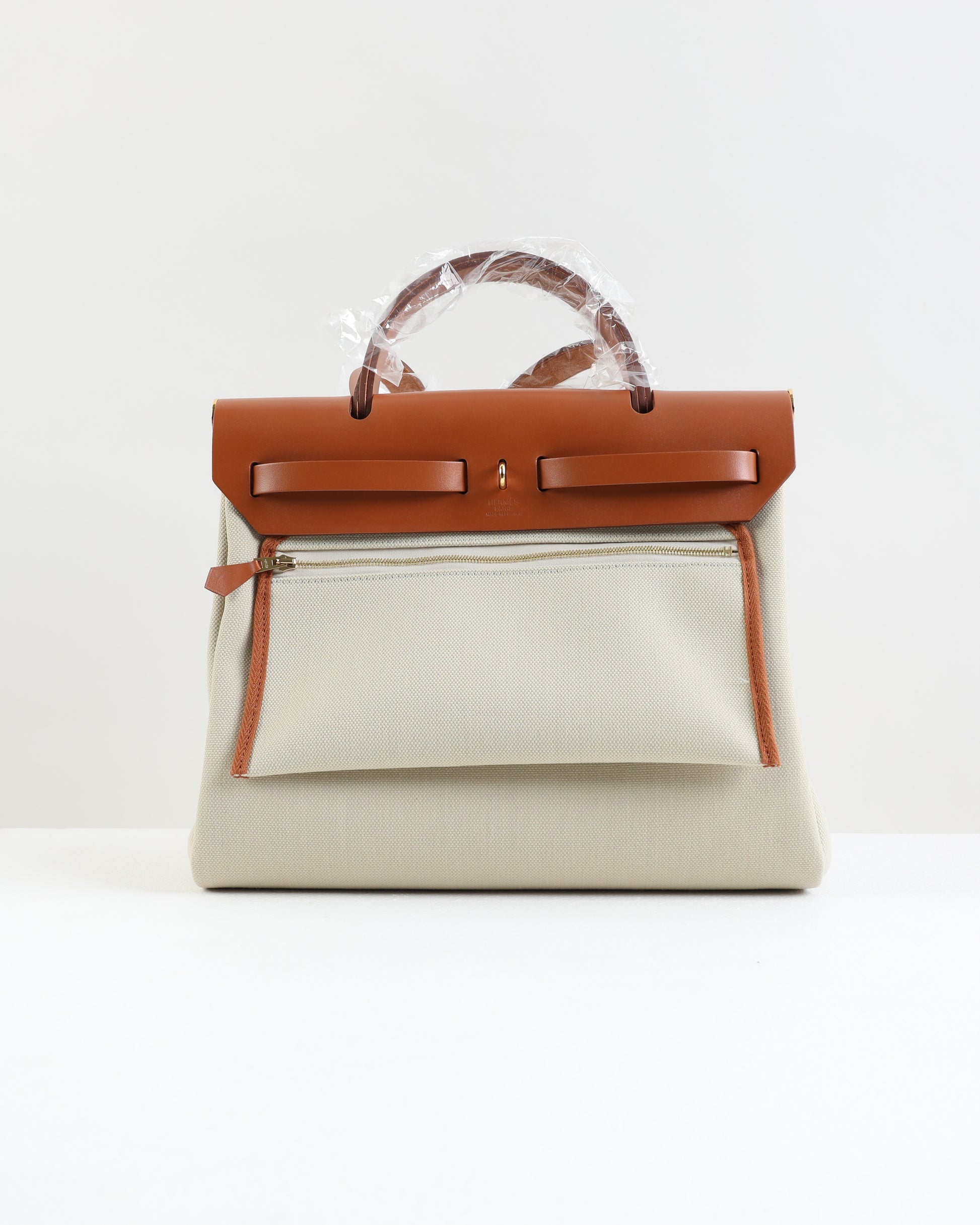 Herbag Zip 31 in Tan Vache Hunter and Beton Toile with Gold Hardware