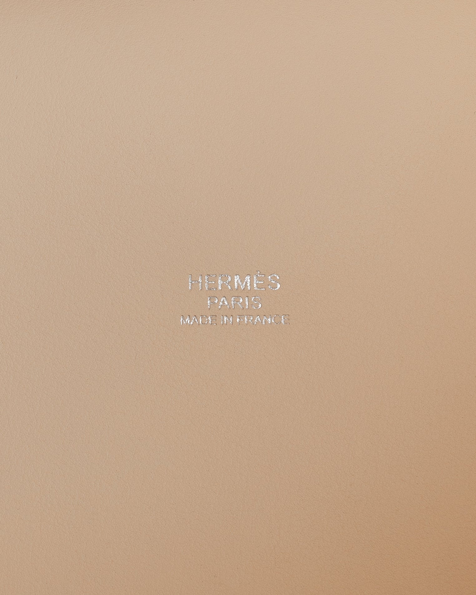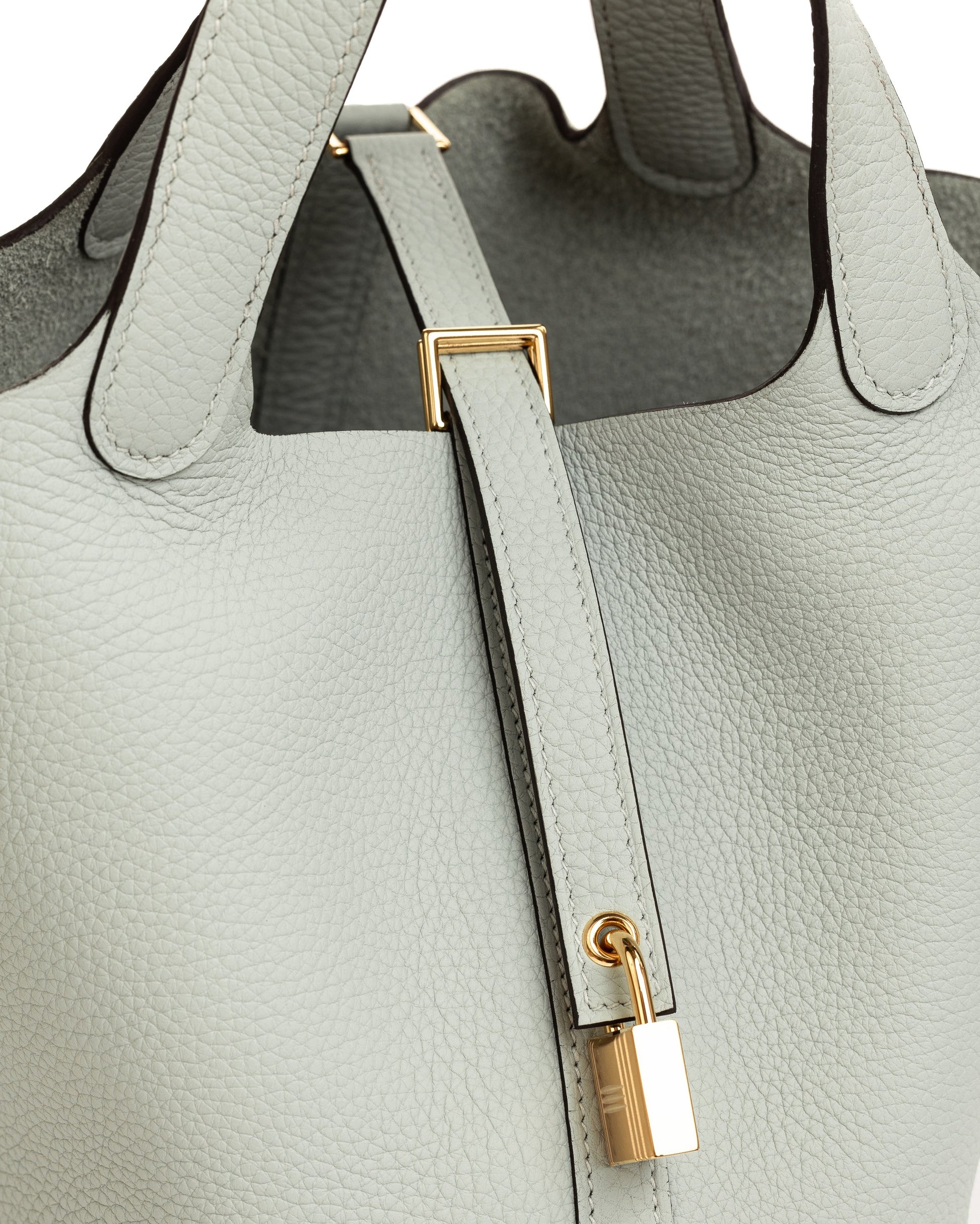 This Picotin 18 is crafted with Gris Neve Clemence leather. Can be closed with a leather strap held by a gold-plated silver padlock.