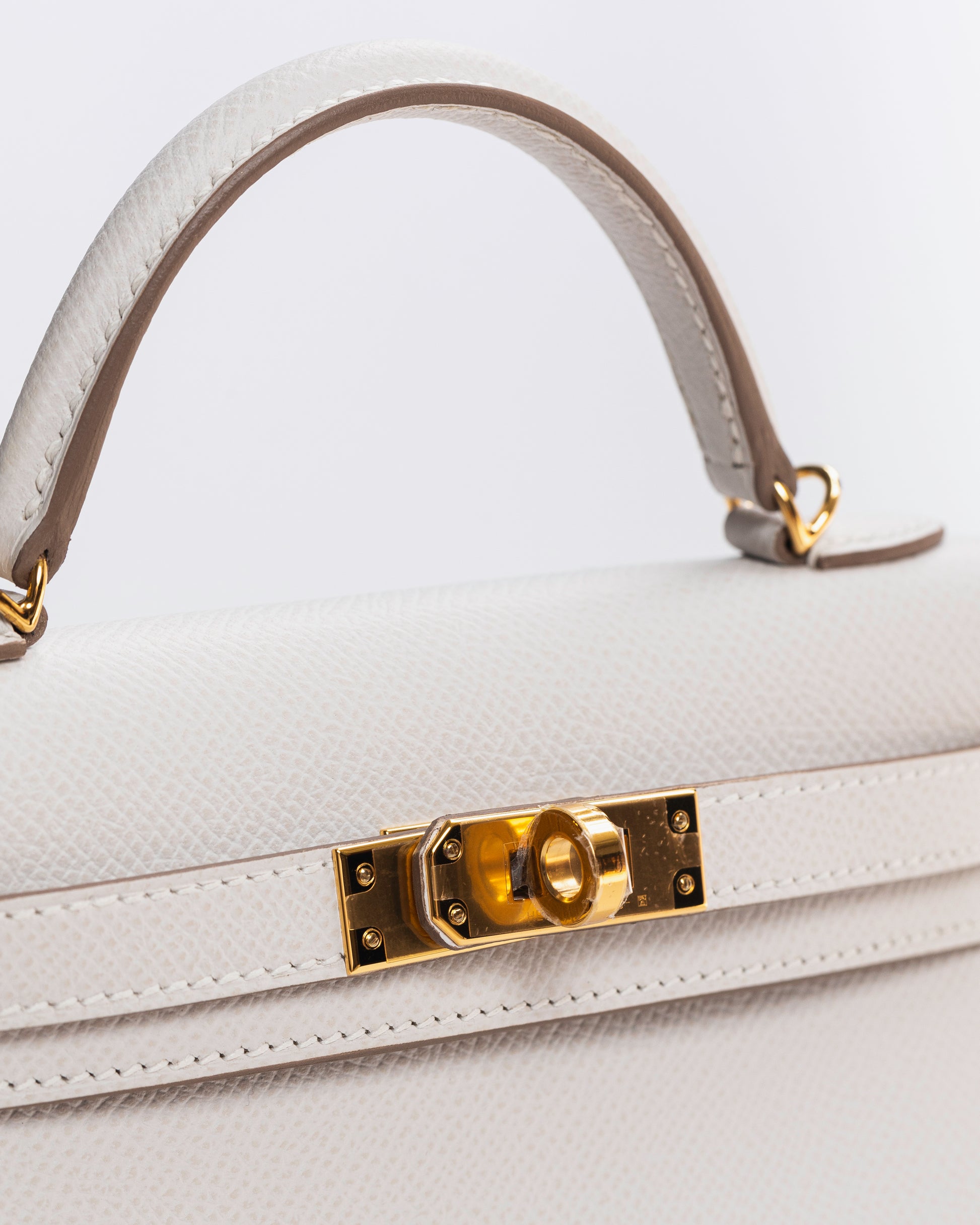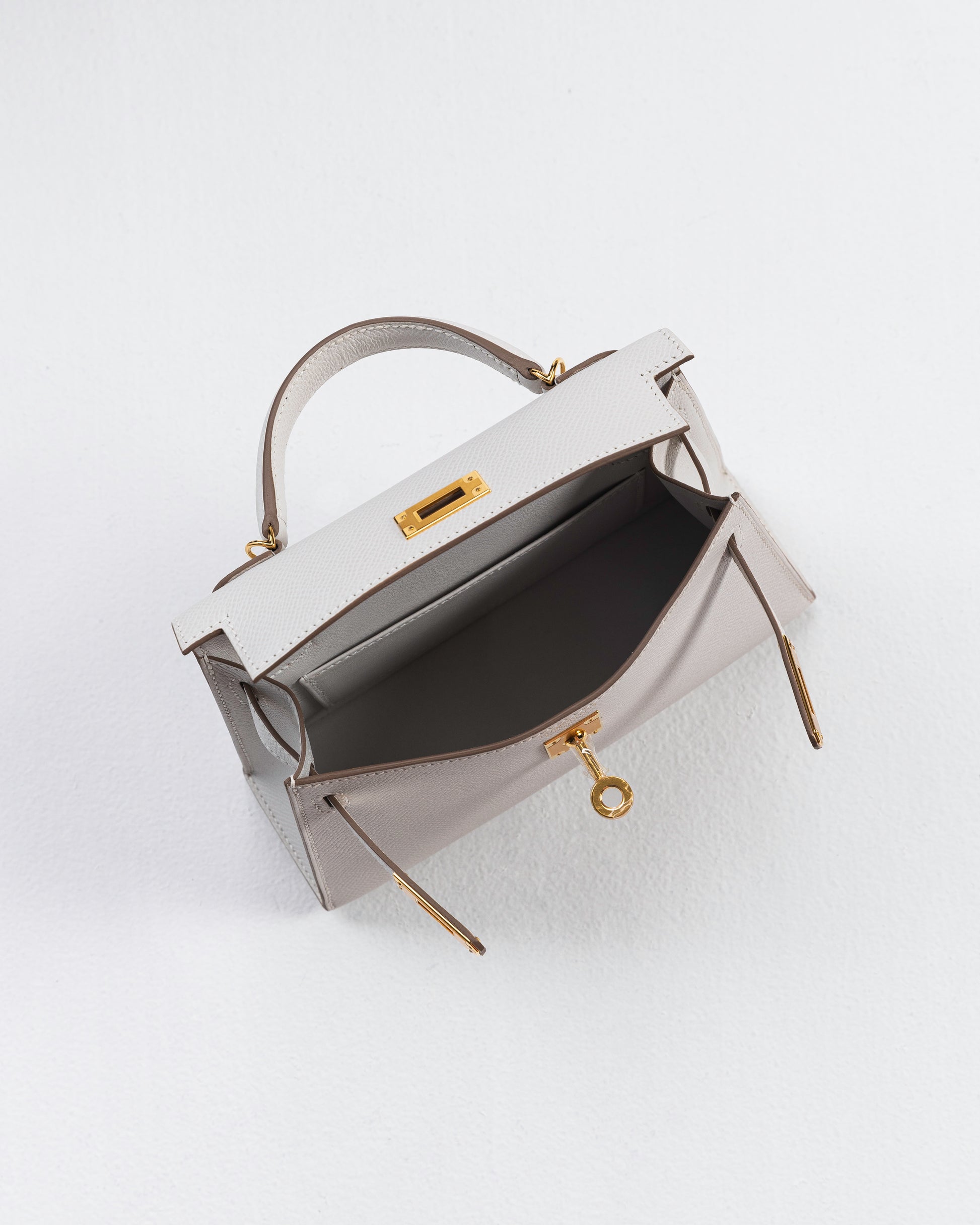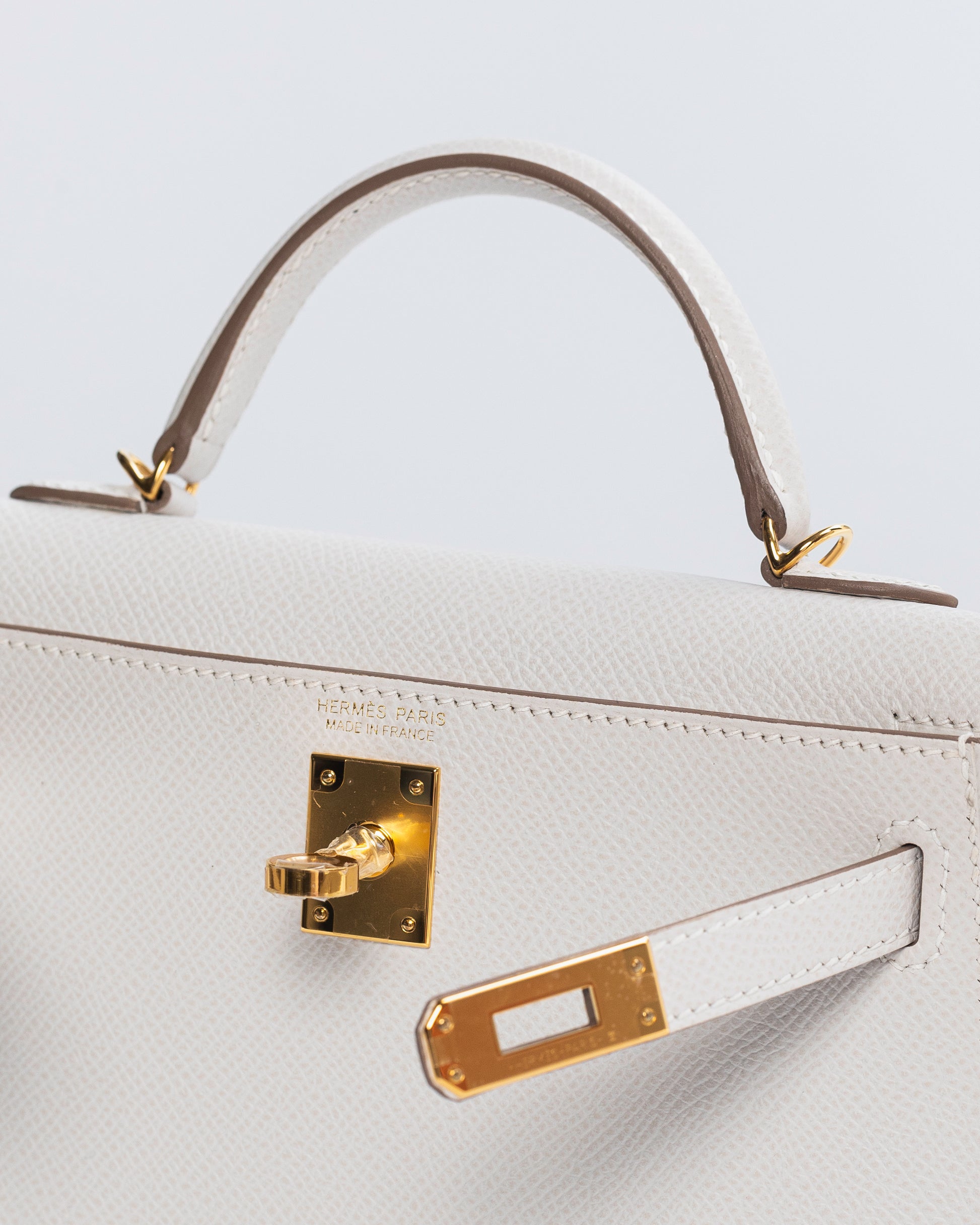 Introducing the Kelly 20 in Gris Pale, crafted from luxurious Epsom leather with gold hardware. This sophisticated shade, part of Hermès' 2023 SS collection, embodies the theme of "Astonishing Hermès." Gris Pale seamlessly blends pearl grey and mellow white, offering a harmonious beauty that radiates serene elegance. With a subtle greyish hue, it exudes a subdued charm compared to the clean white "New White" and achieves a more modern feel than "Mushroom." Elevate your style with this neutral and balanced accessory that effortlessly complements any color palette.