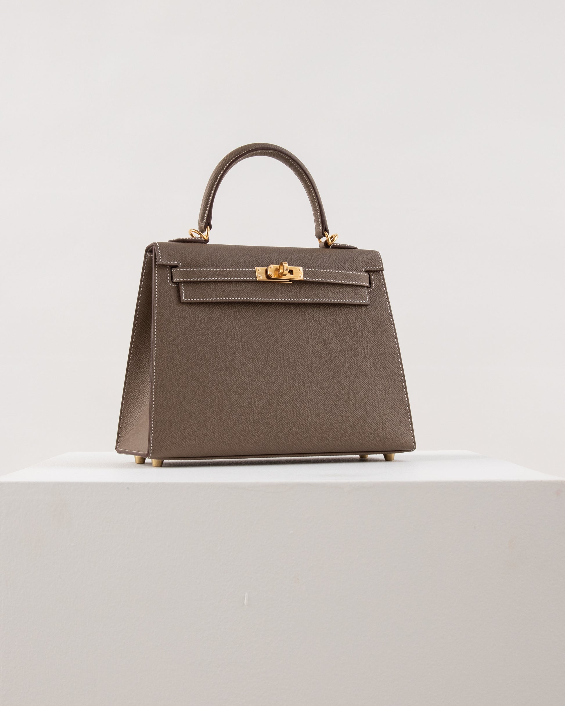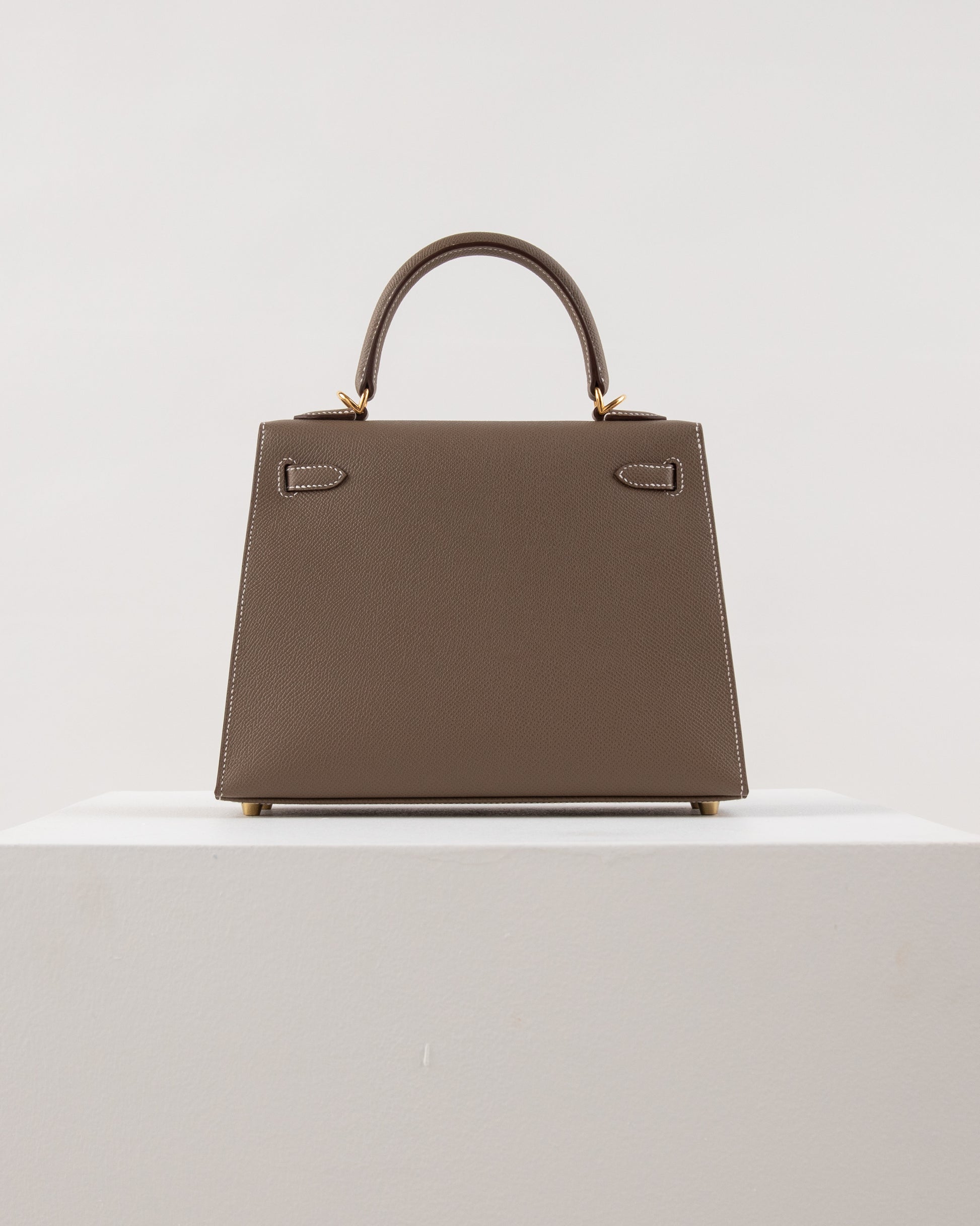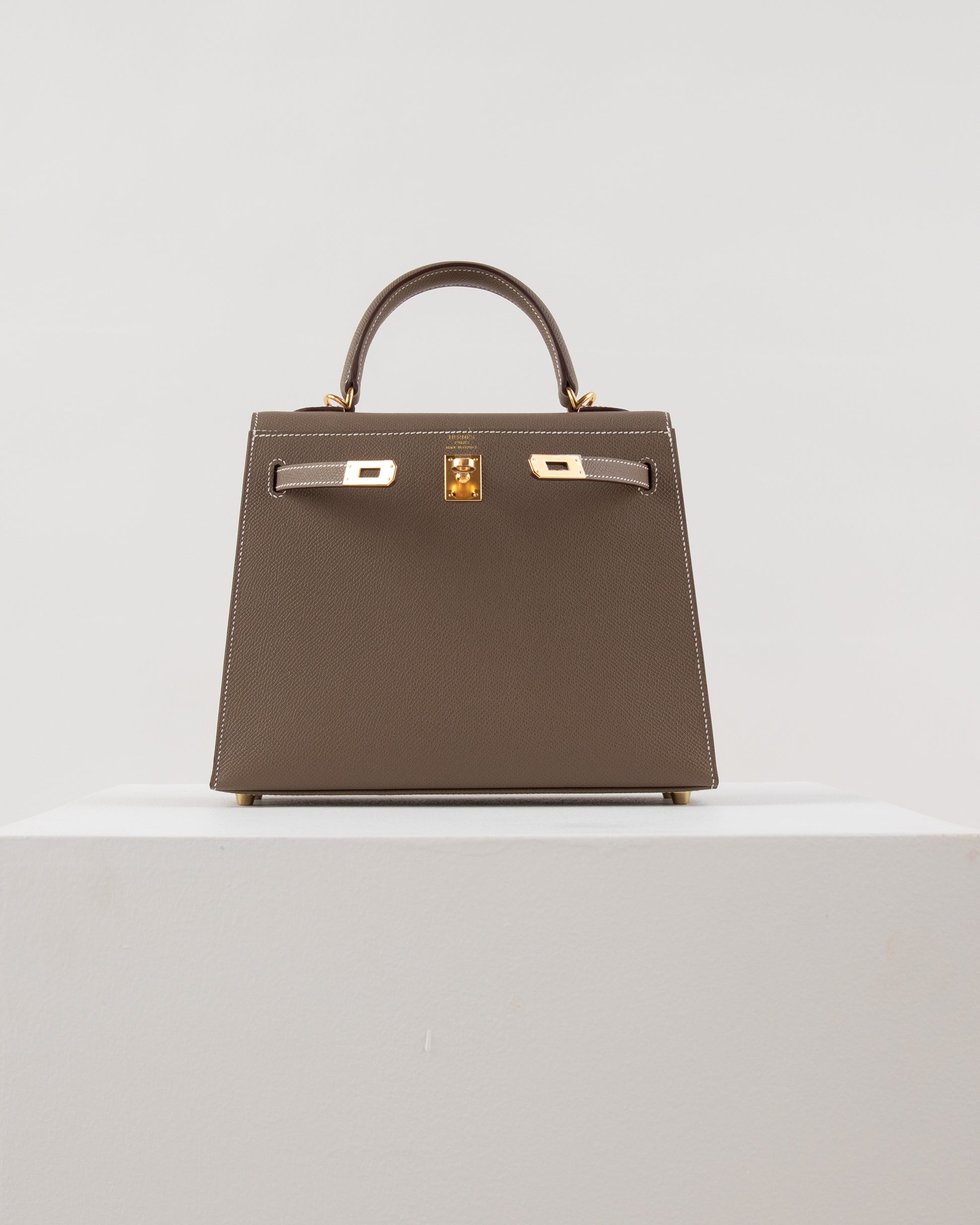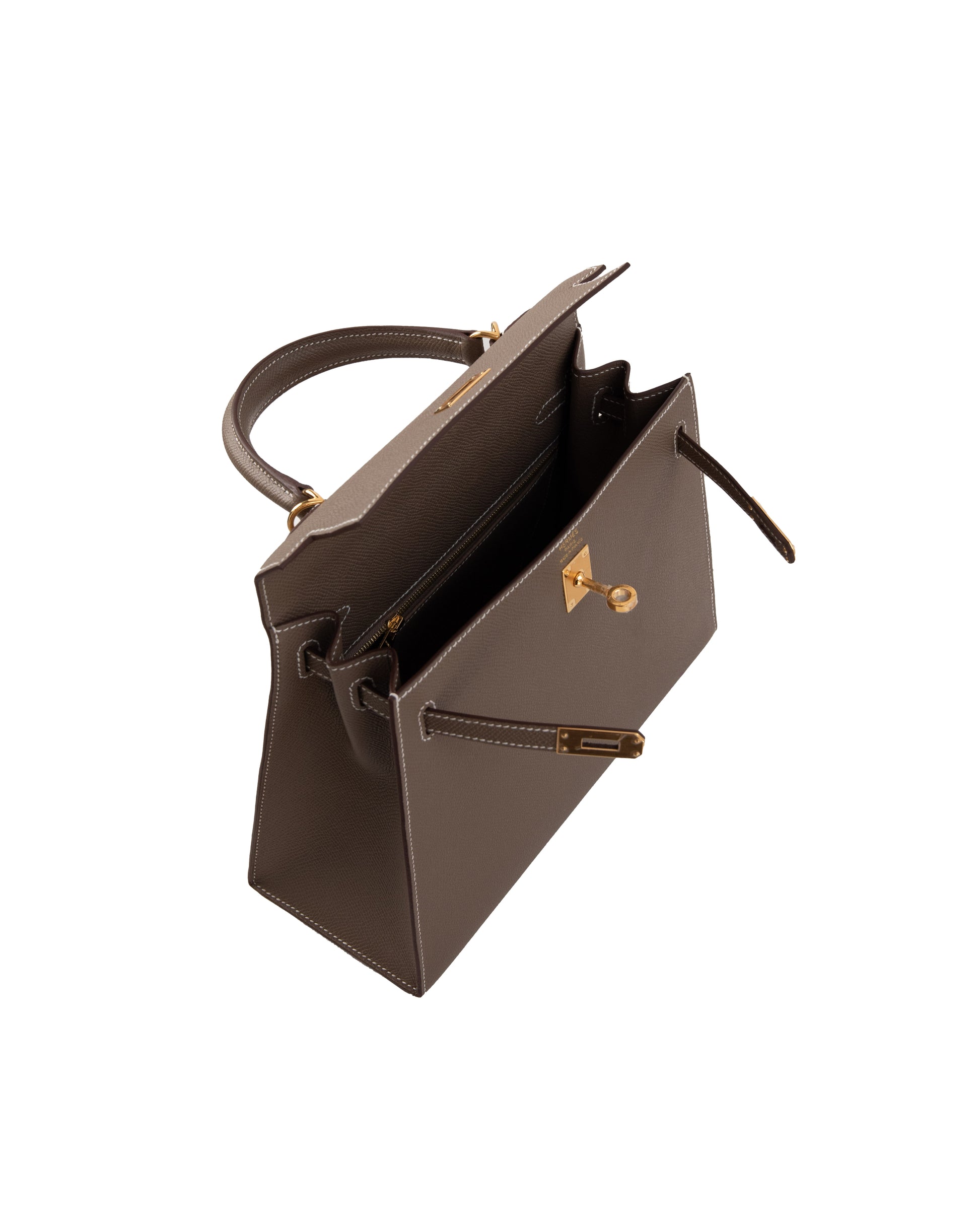 Our Kelly 25 in Etoupe is crafted with classic Epsom leather and finished with gold hardware details. Features tonal stitching, front flap, two straps with center toggle closure, a single rolled handle, and removable shoulder strap. The interior is lined with Etoupe and has one zip pocket with an Hermès engraved zipper pull.