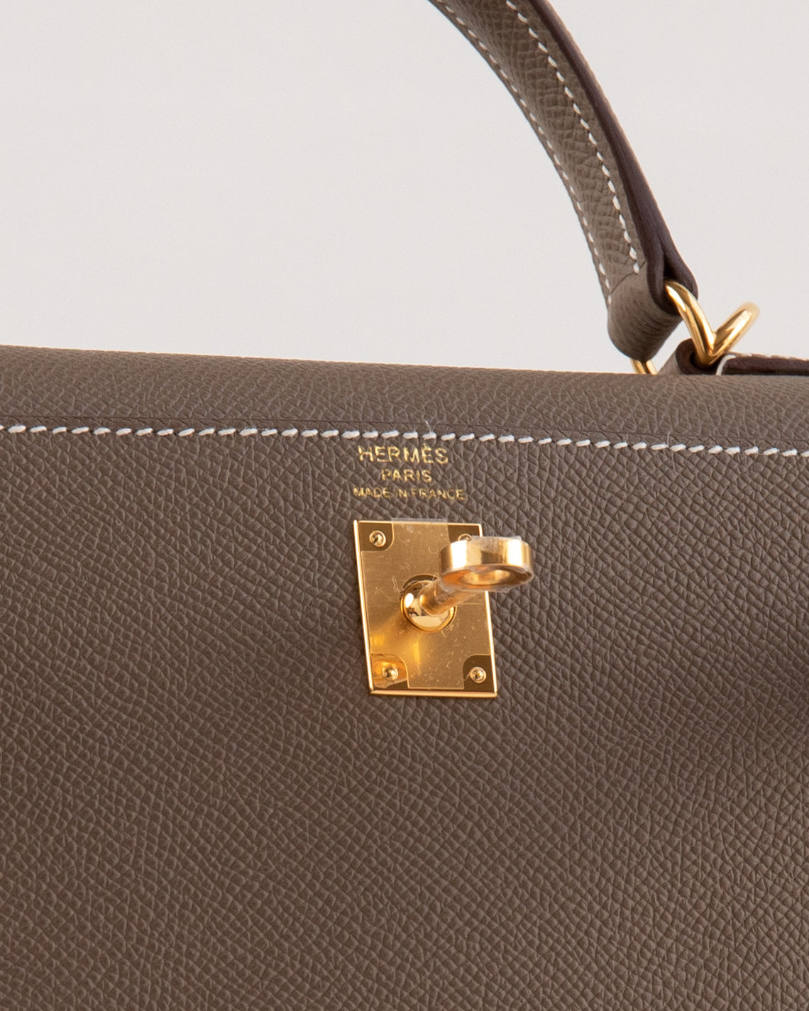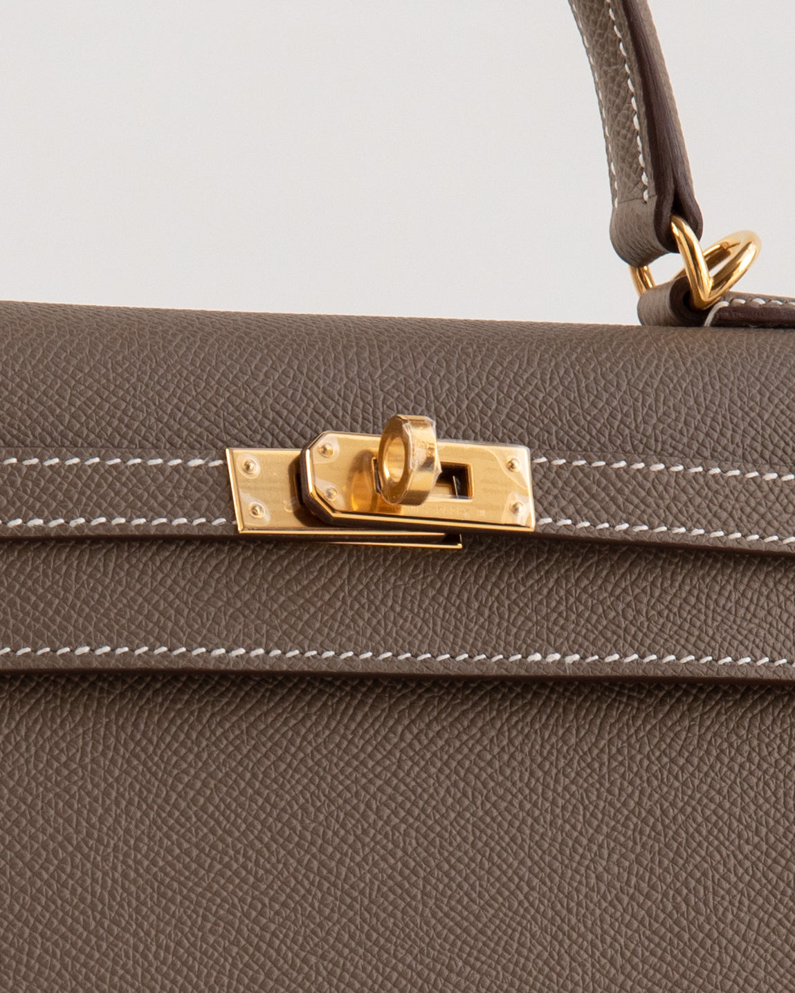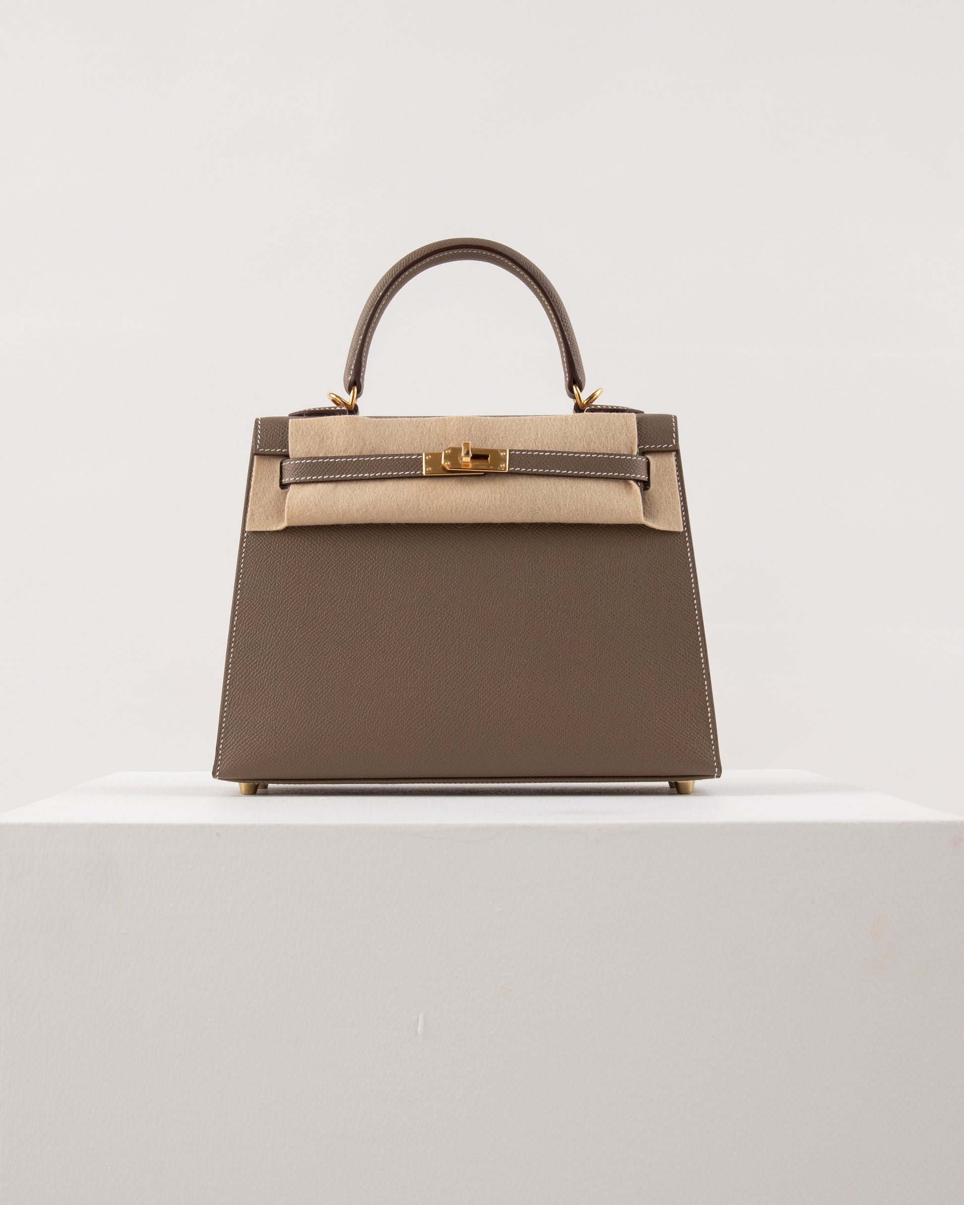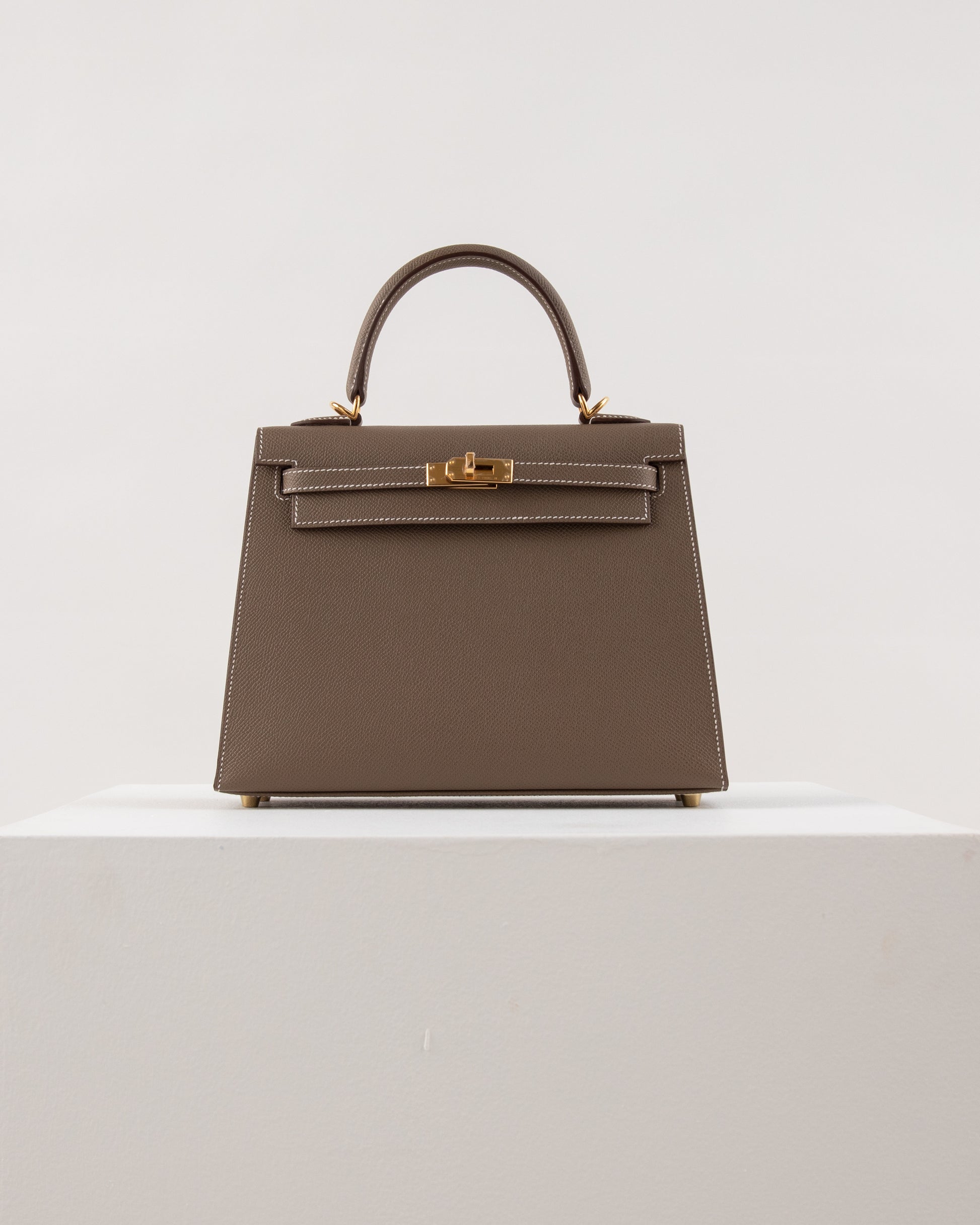 Our Kelly 25 in Etoupe is crafted with classic Epsom leather and finished with gold hardware details. Features tonal stitching, front flap, two straps with center toggle closure, a single rolled handle, and removable shoulder strap. The interior is lined with Etoupe and has one zip pocket with an Hermès engraved zipper pull.