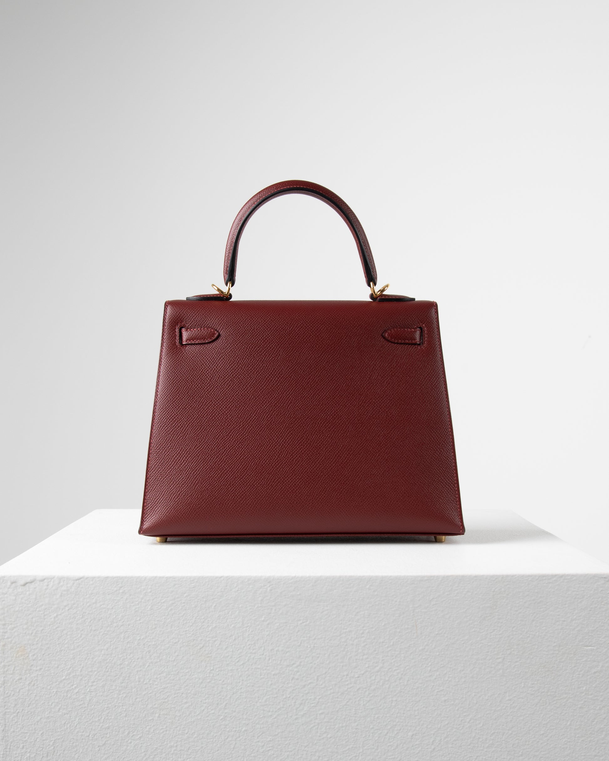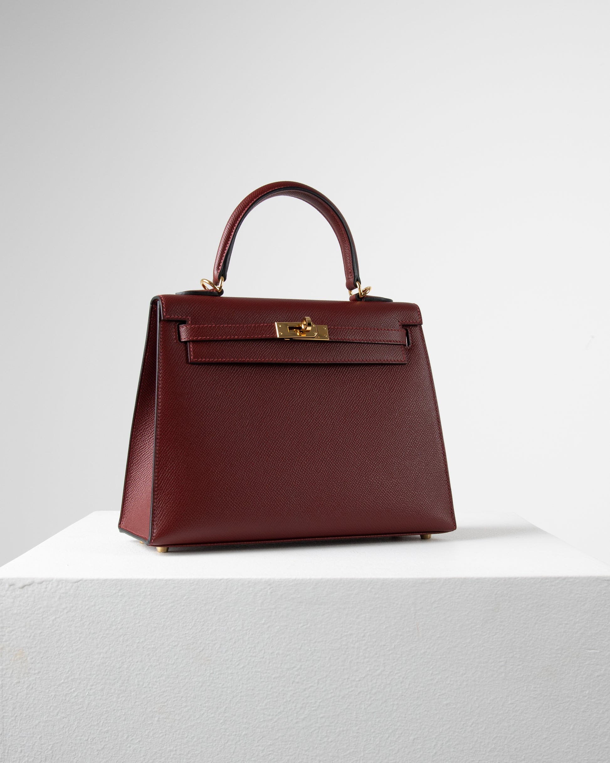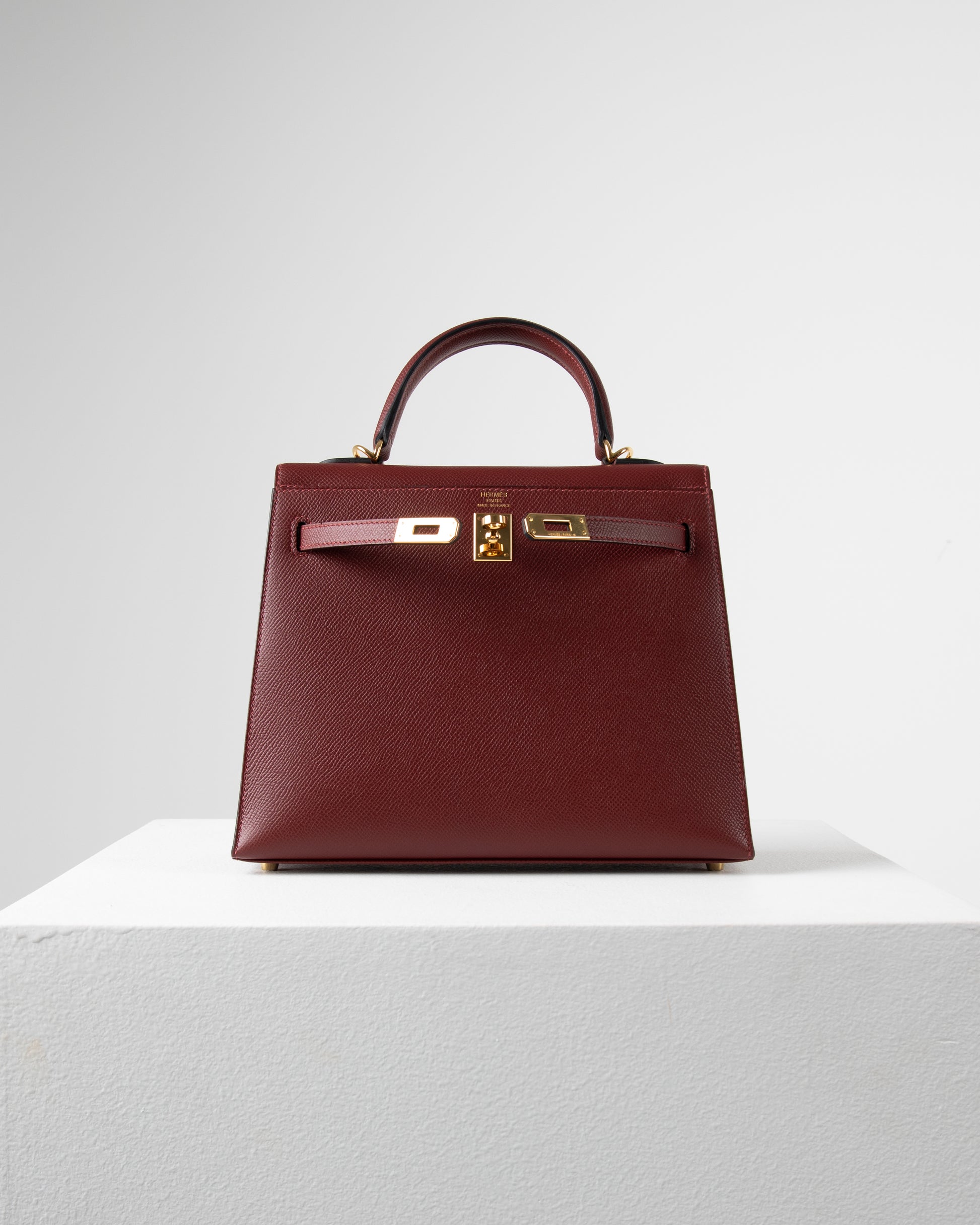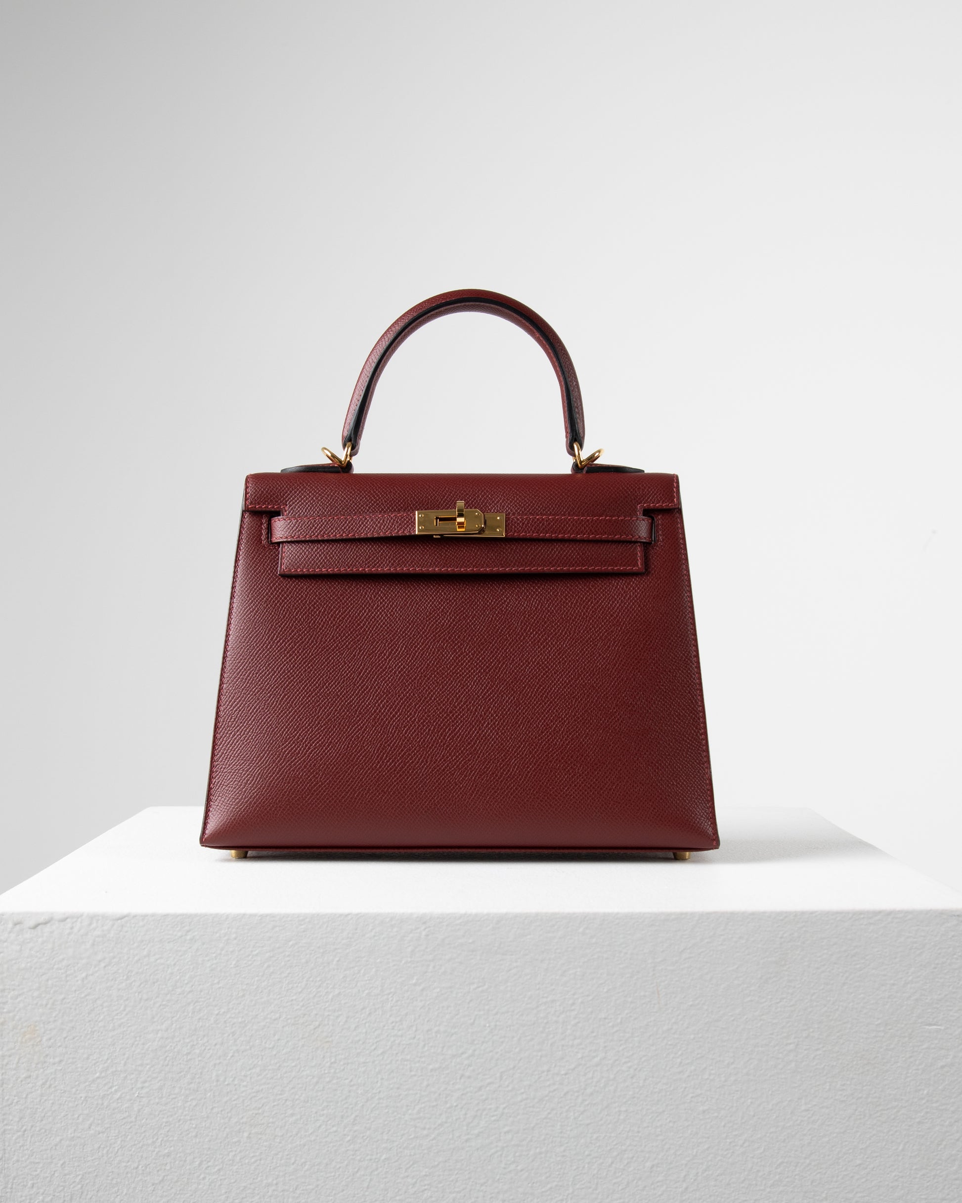Our rich rouge Sellier Kelly 25 is crafted with Epsom leather, and its features are complemented with Gold hardware. This Kelly 25 has tonal stitching, a front flap, two straps with center toggle closure, a clochette with lock and two keys, and single rolled handles.