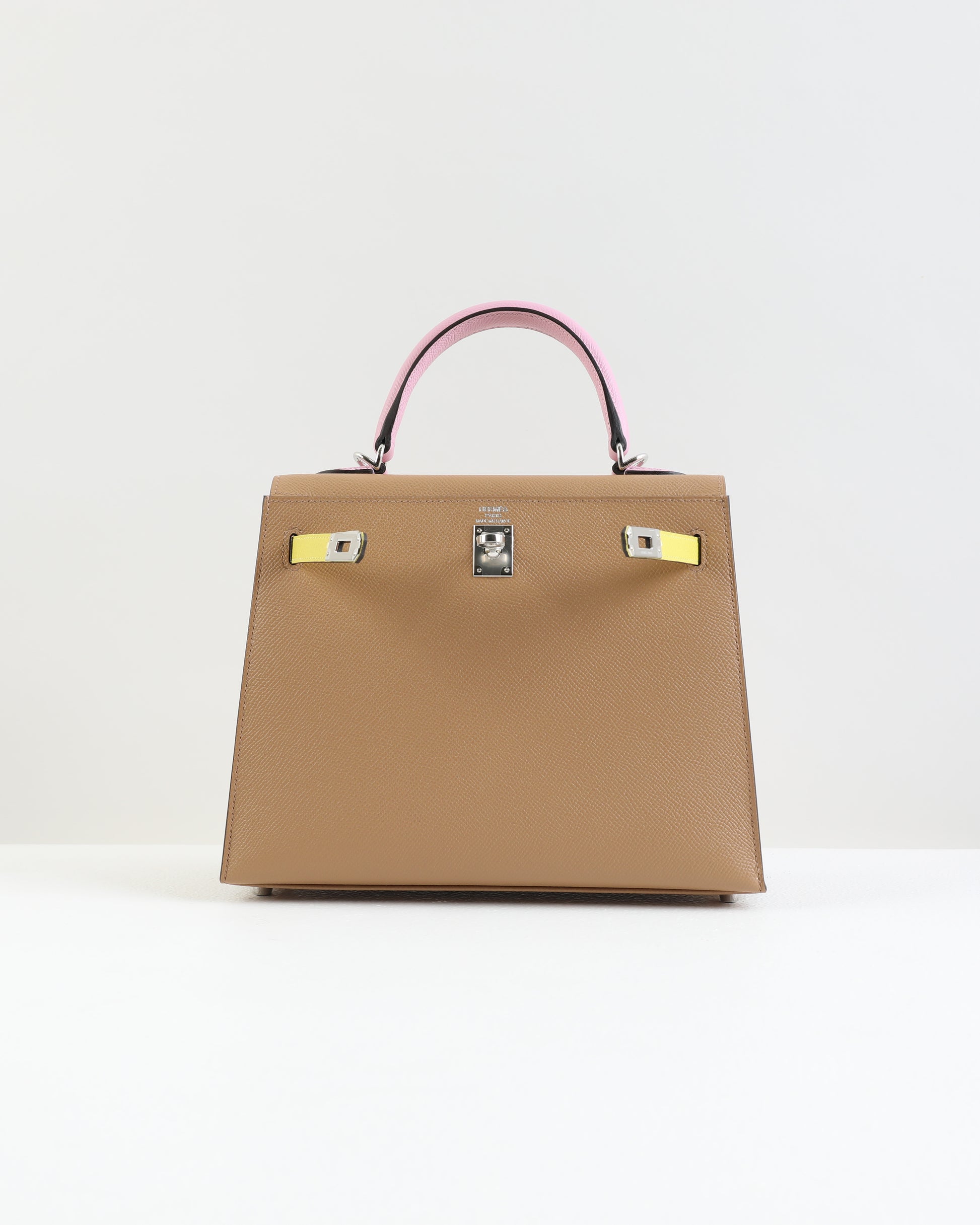 Kelly 25 Tri color in Lime, Chai, and Mauve Sylvestre in Epsom Leather with Palladium Hardware