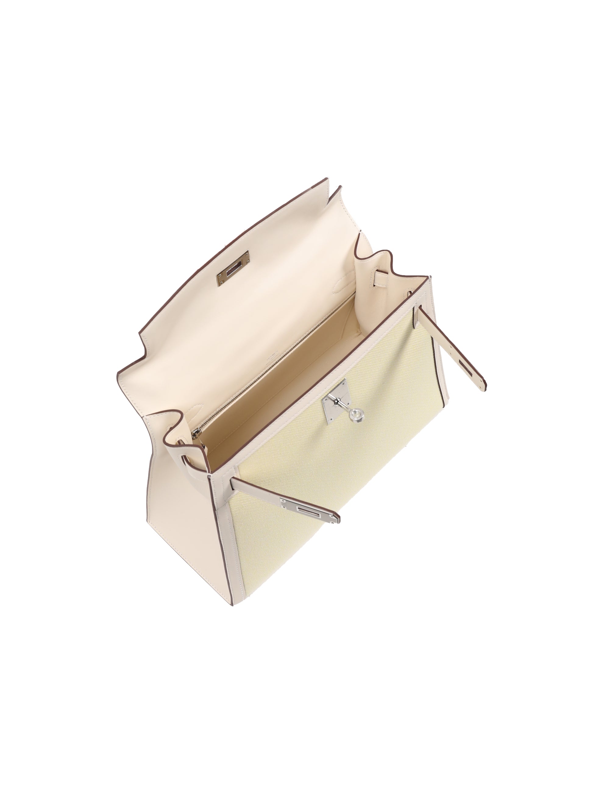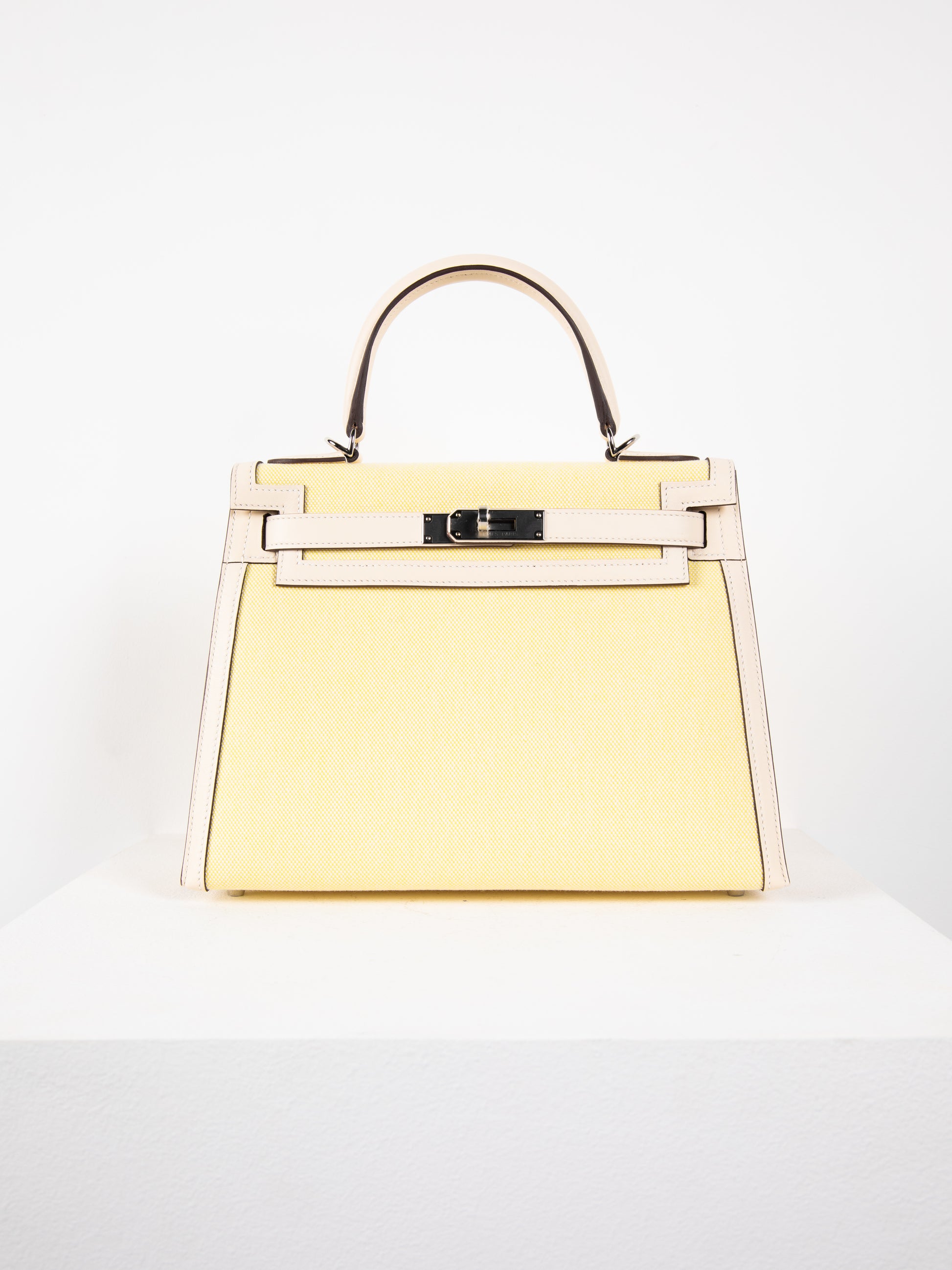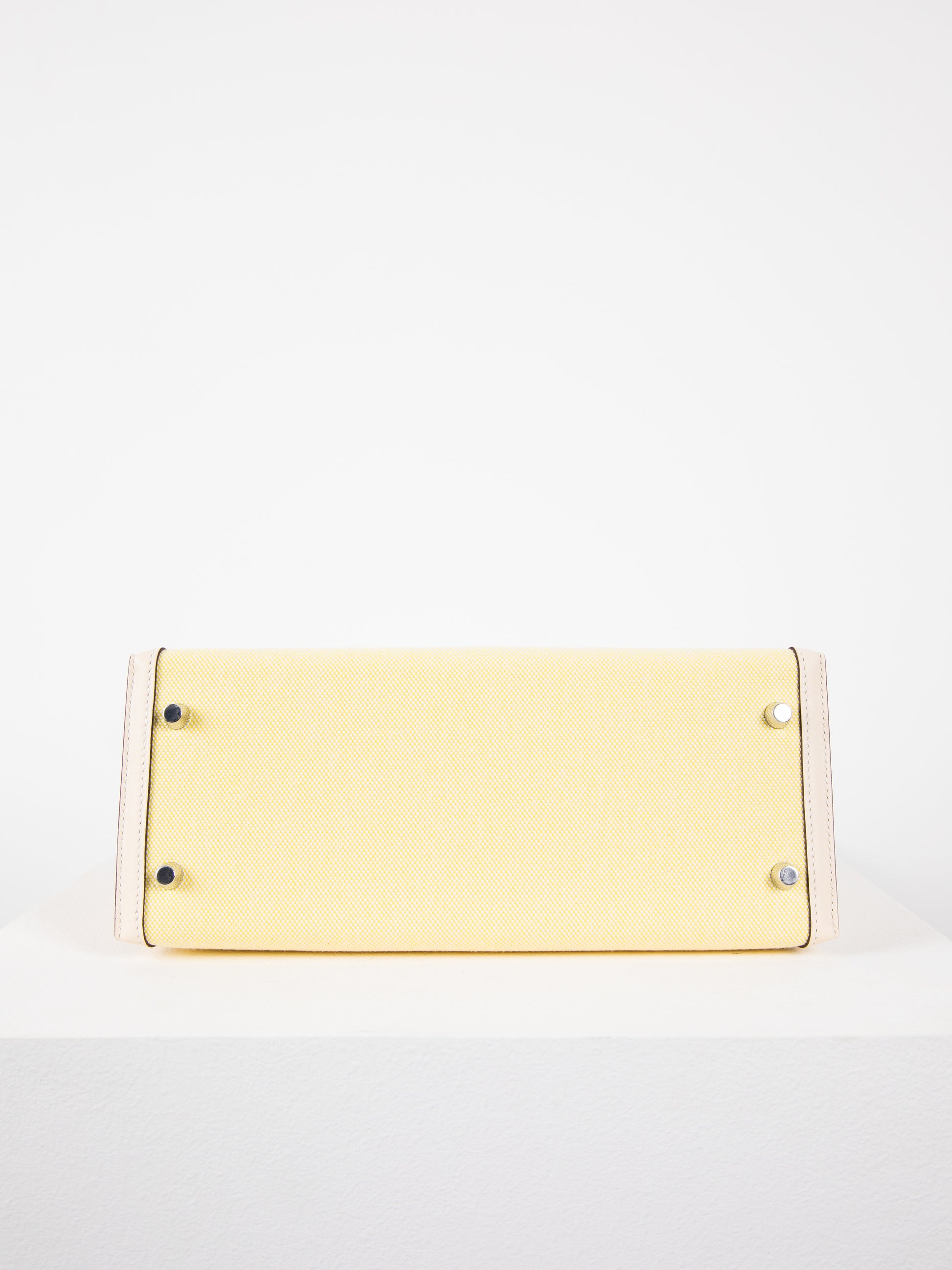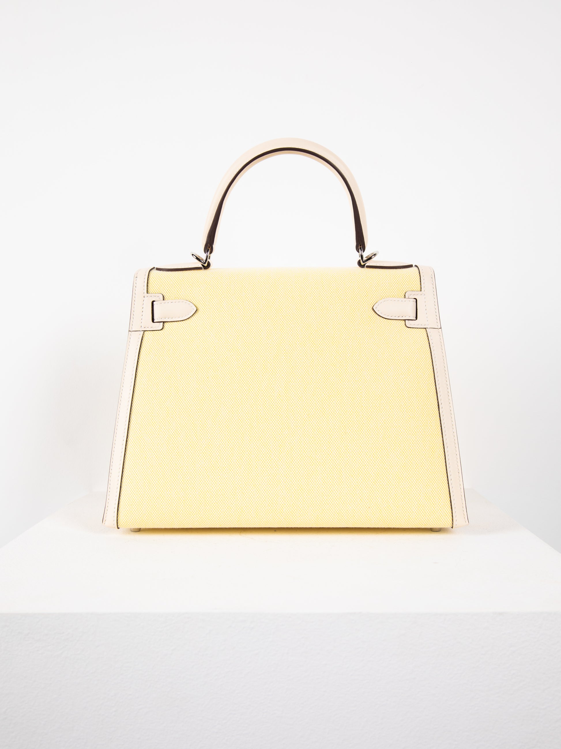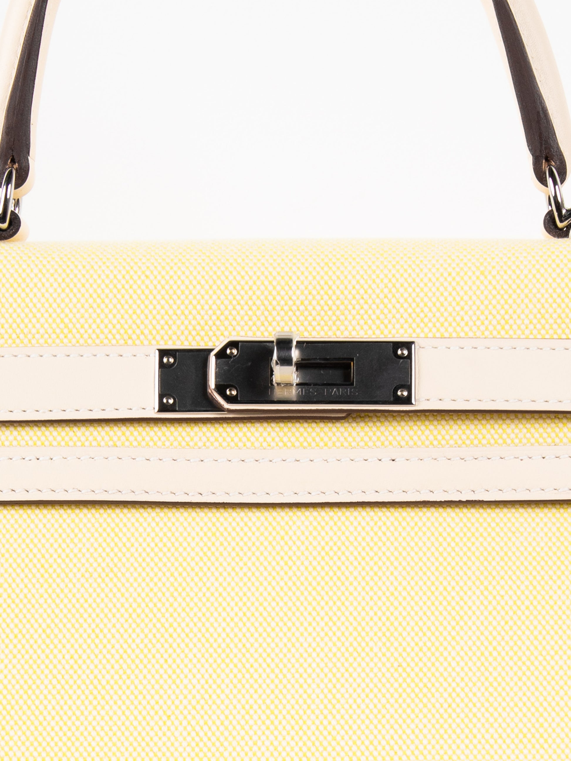 Kelly 28 in Toile H/Veau Swift Ecru-Jaune Citron/Nata with Palladium Hardware