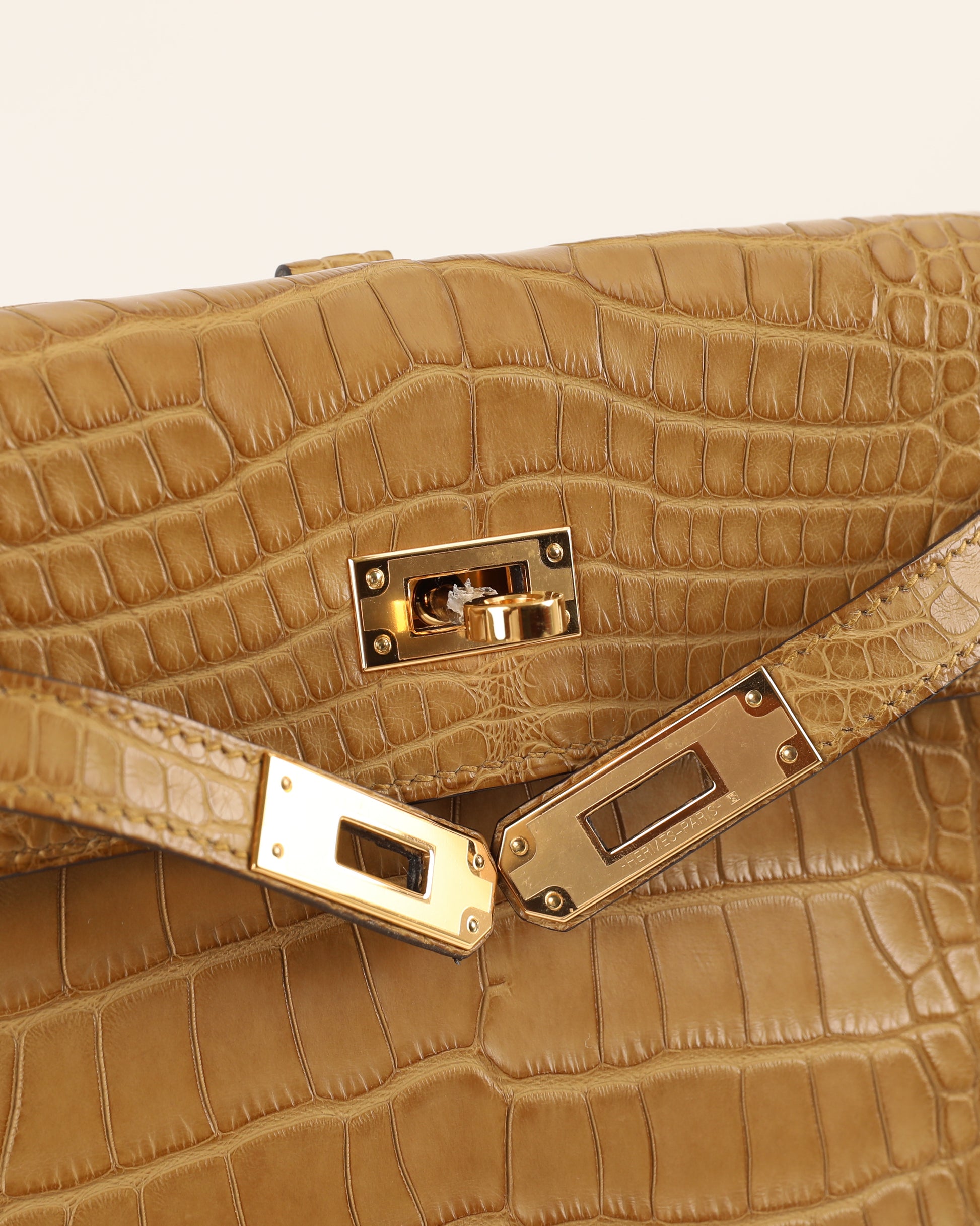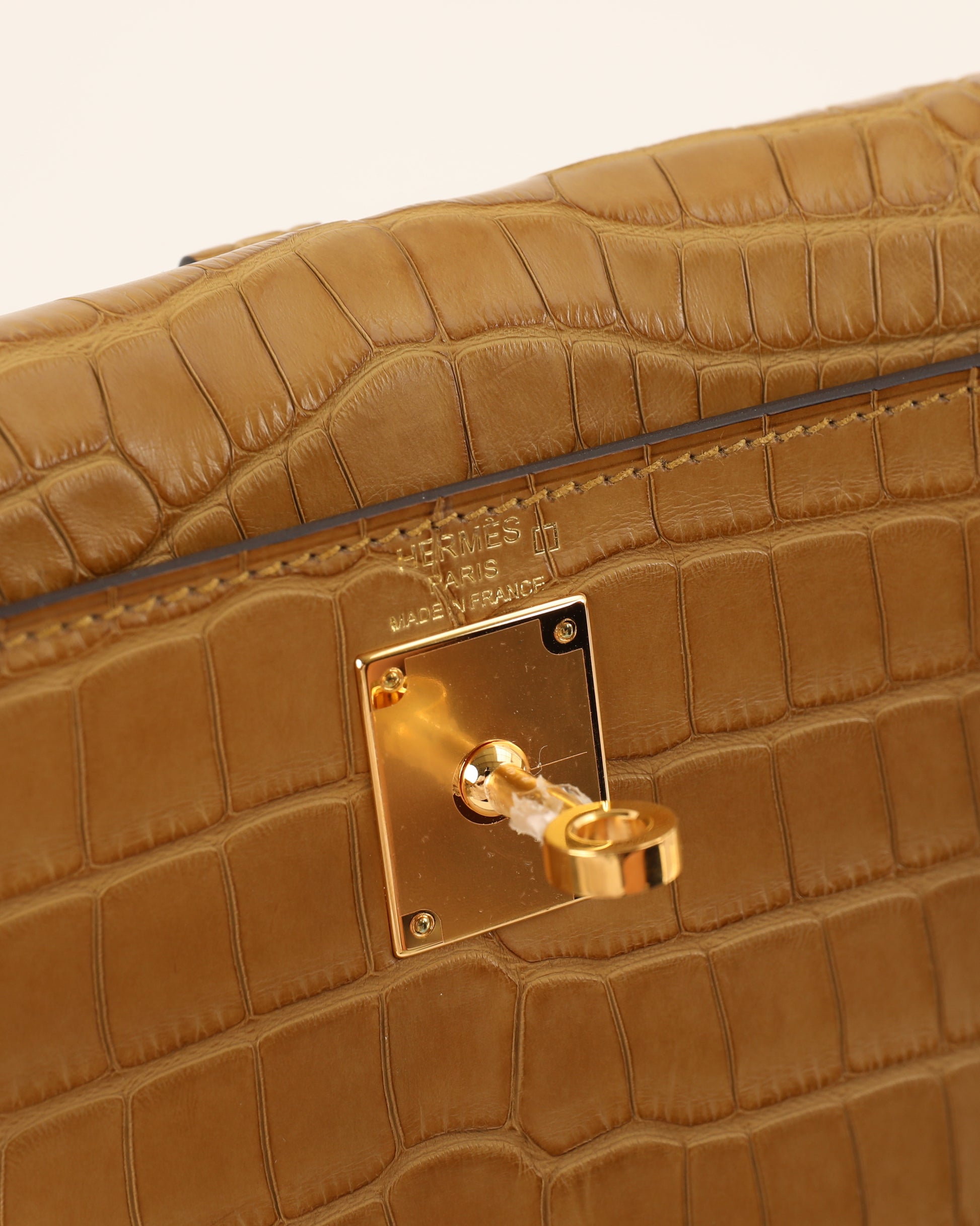 Crafted from premium leather, the Kelly Ado II is available in various colors. However, the most extraordinary and sought-after versions are the exotic editions made with Matte Alligator. Among these, the Matte Kraft Alligator stands out as an exceptionally rare and prized find. While Hermès has long utilized the shade of Karft in their production, it is only recently that it has been crafted into an exotic material.