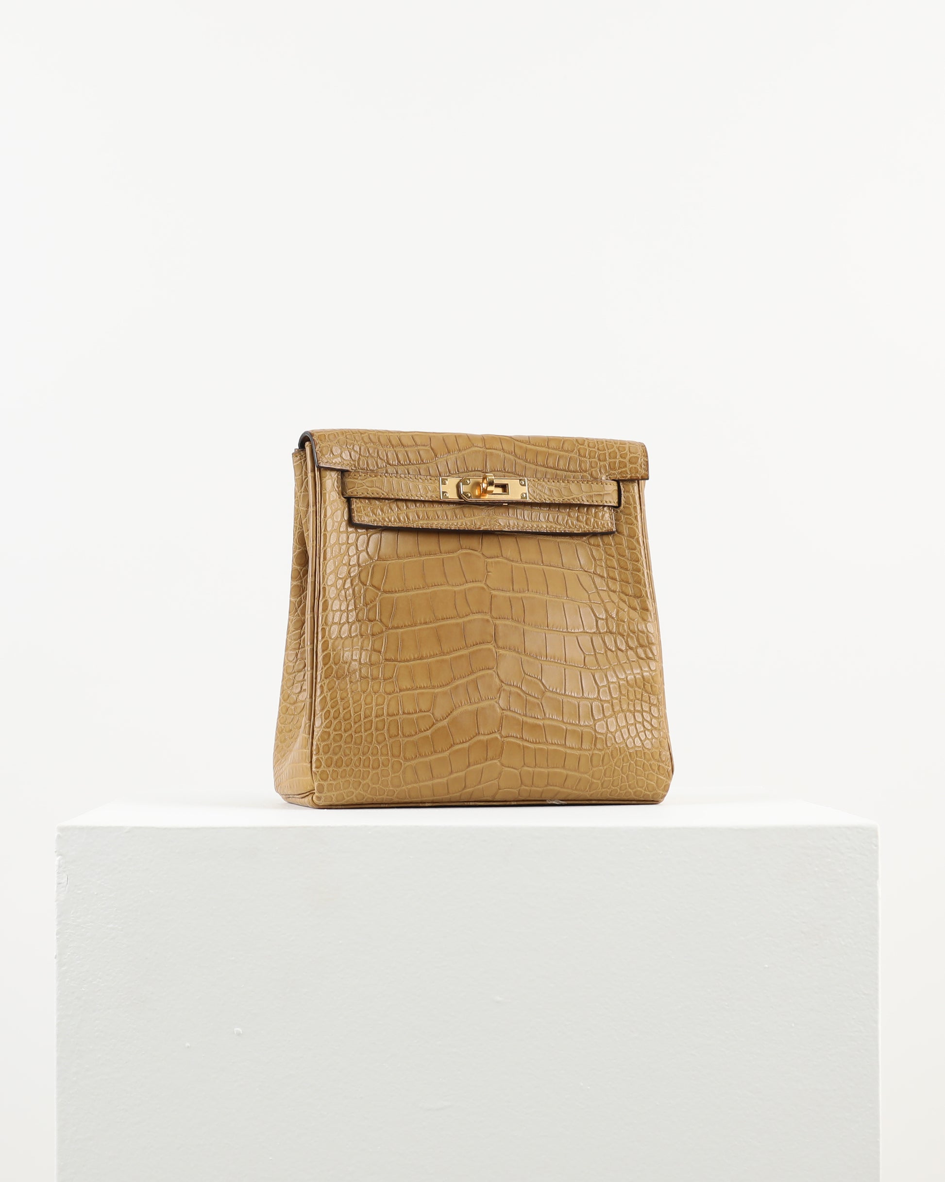 The Matte Kraft Alligator Kelly Ado II is a true gem for Hermès collectors, representing the pinnacle of luxury. Its exquisite rarity is further accentuated by the gleaming Gold hardware that adorns the backpack. Our Kelly Ado is in mint condition, and this backpack exemplifies the epitome of style and sophistication, making it the ultimate accessory for those in search of a truly exceptional backpack. Due to its exclusivity, finding this particular Matte Kraft Alligator Kelly Ado II on the secondary market is exceptionally challenging, making it a highly coveted item among connoisseurs.