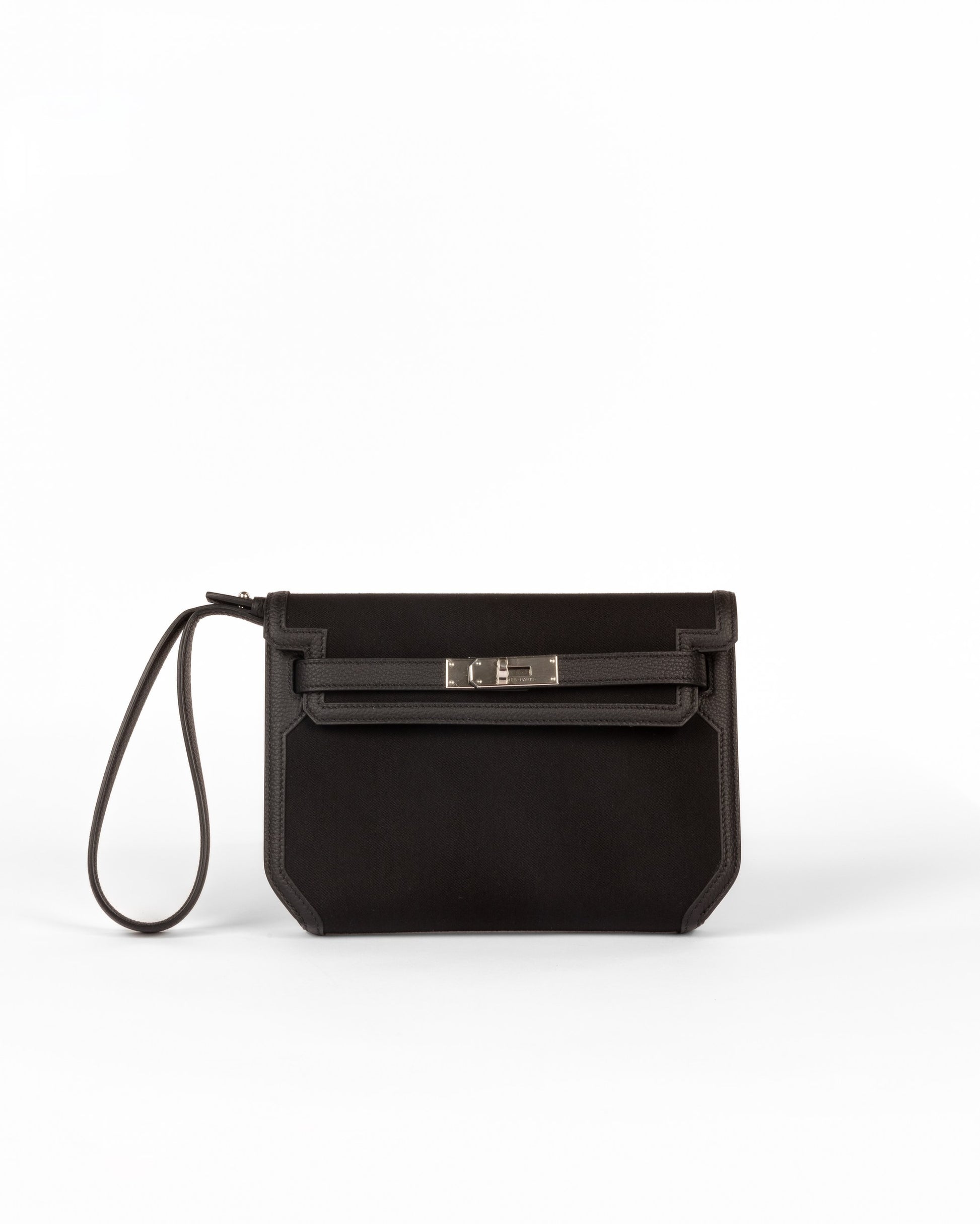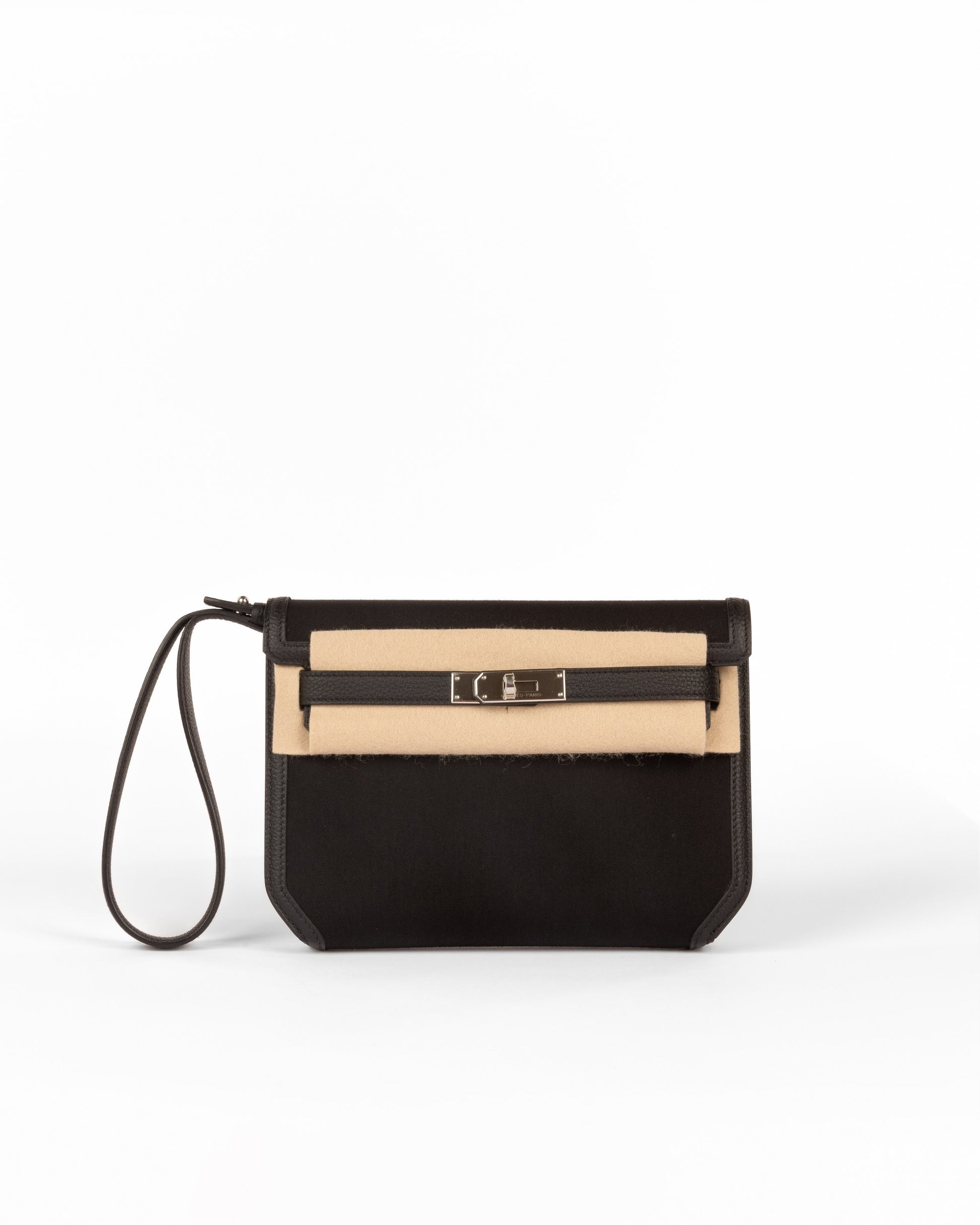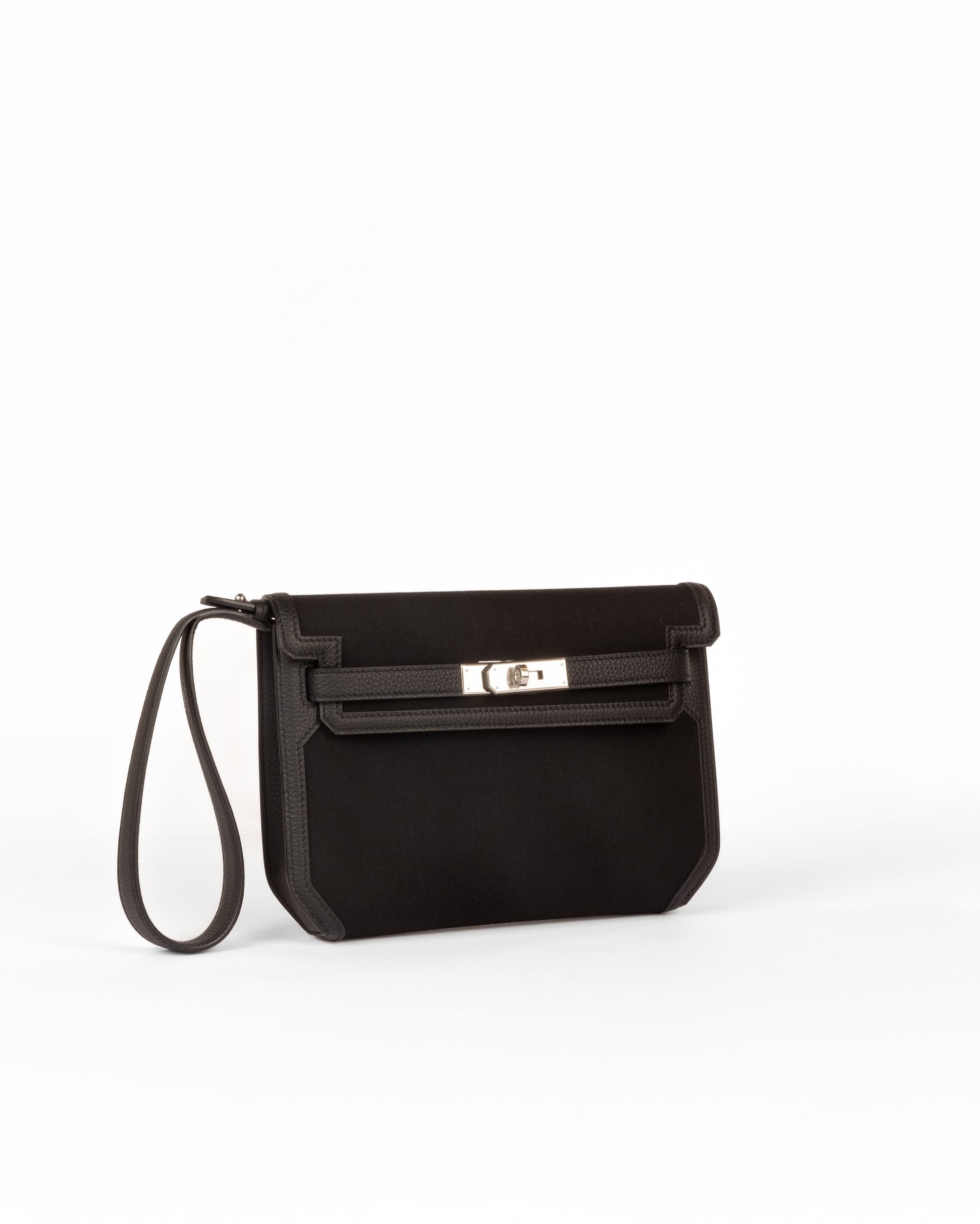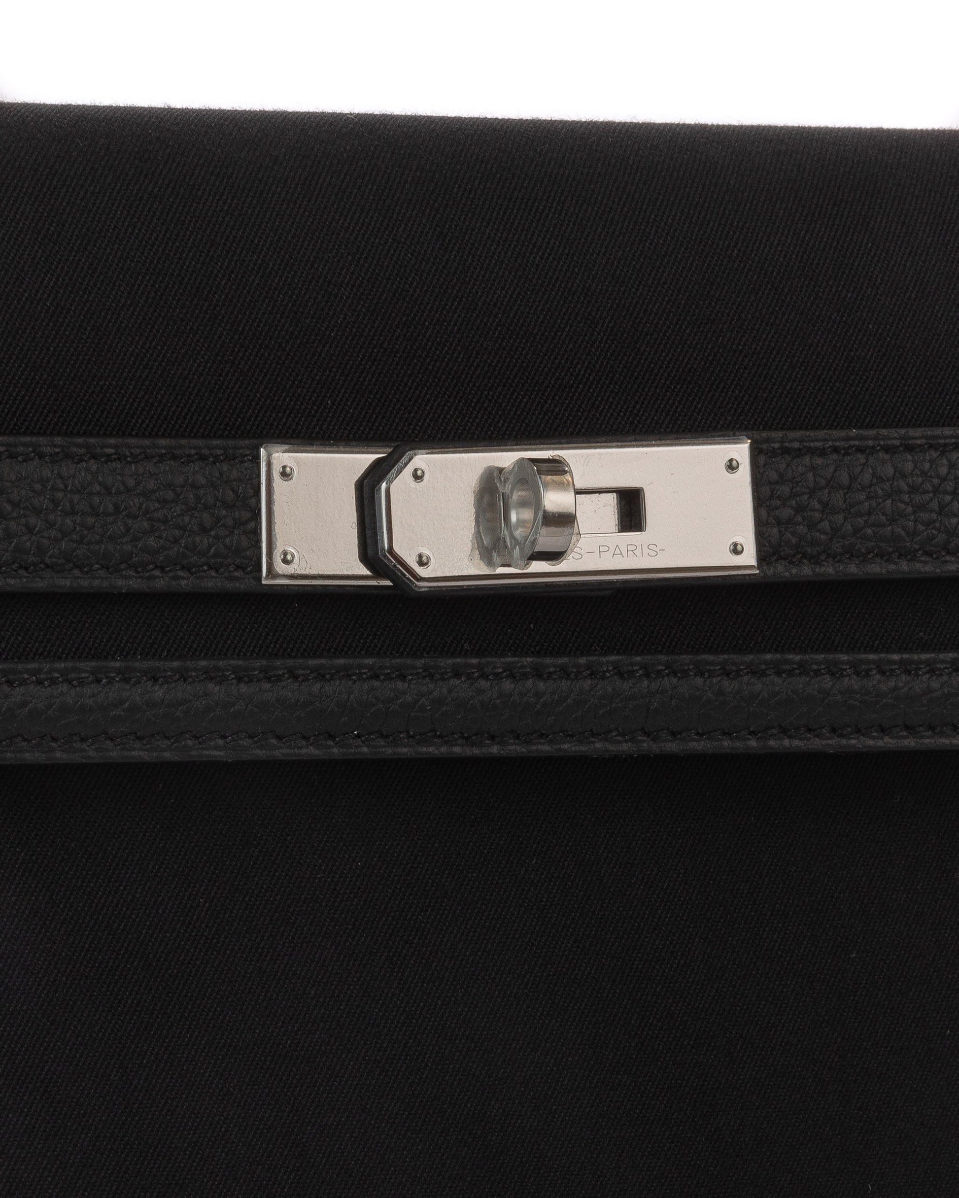 The Hermès Kelly Depeches 25 Black in Toile Canvas and Togo Leather with Palladium Hardware is a sophisticated and stylish accessory that combines timeless elegance with modern practicality. This chic pouch features the iconic Kelly design, crafted from durable black Toile Canvas and luxurious Togo Leather, creating a refined and versatile look.