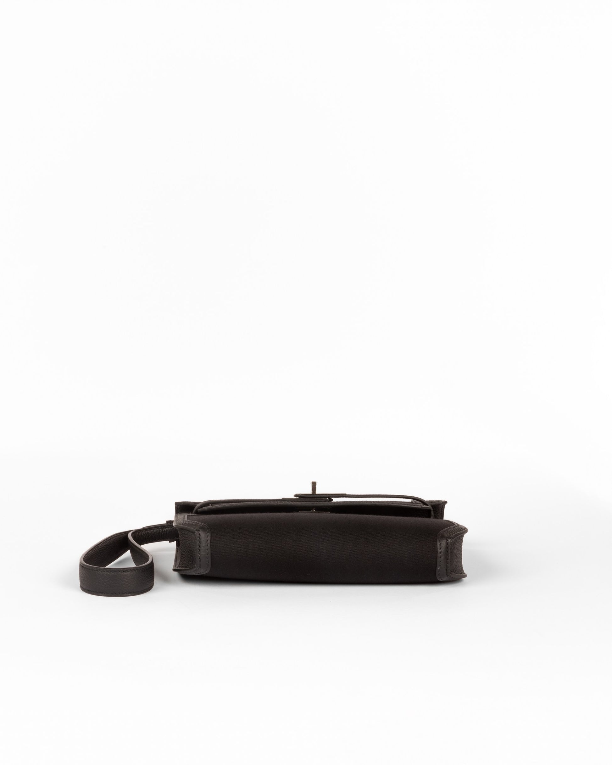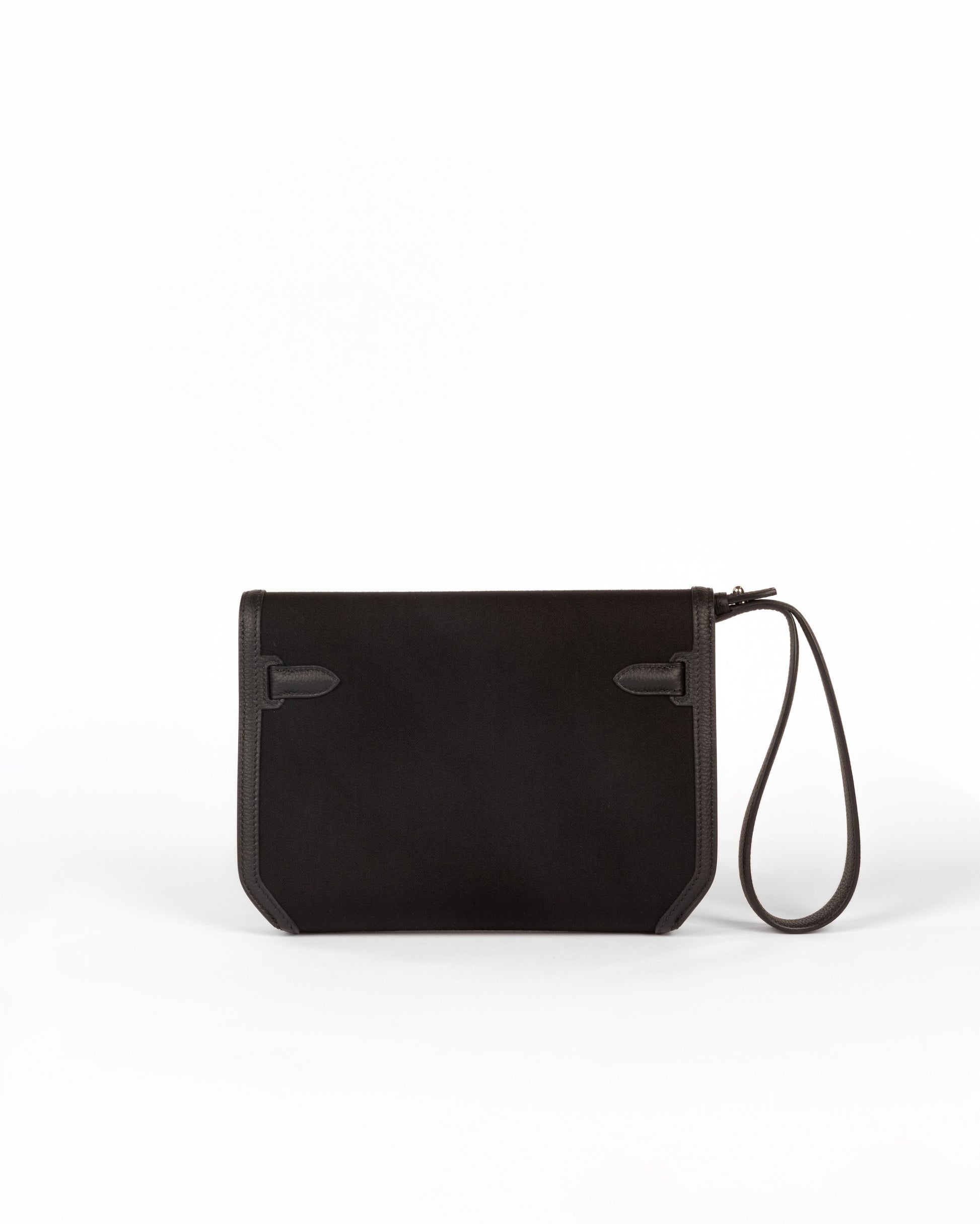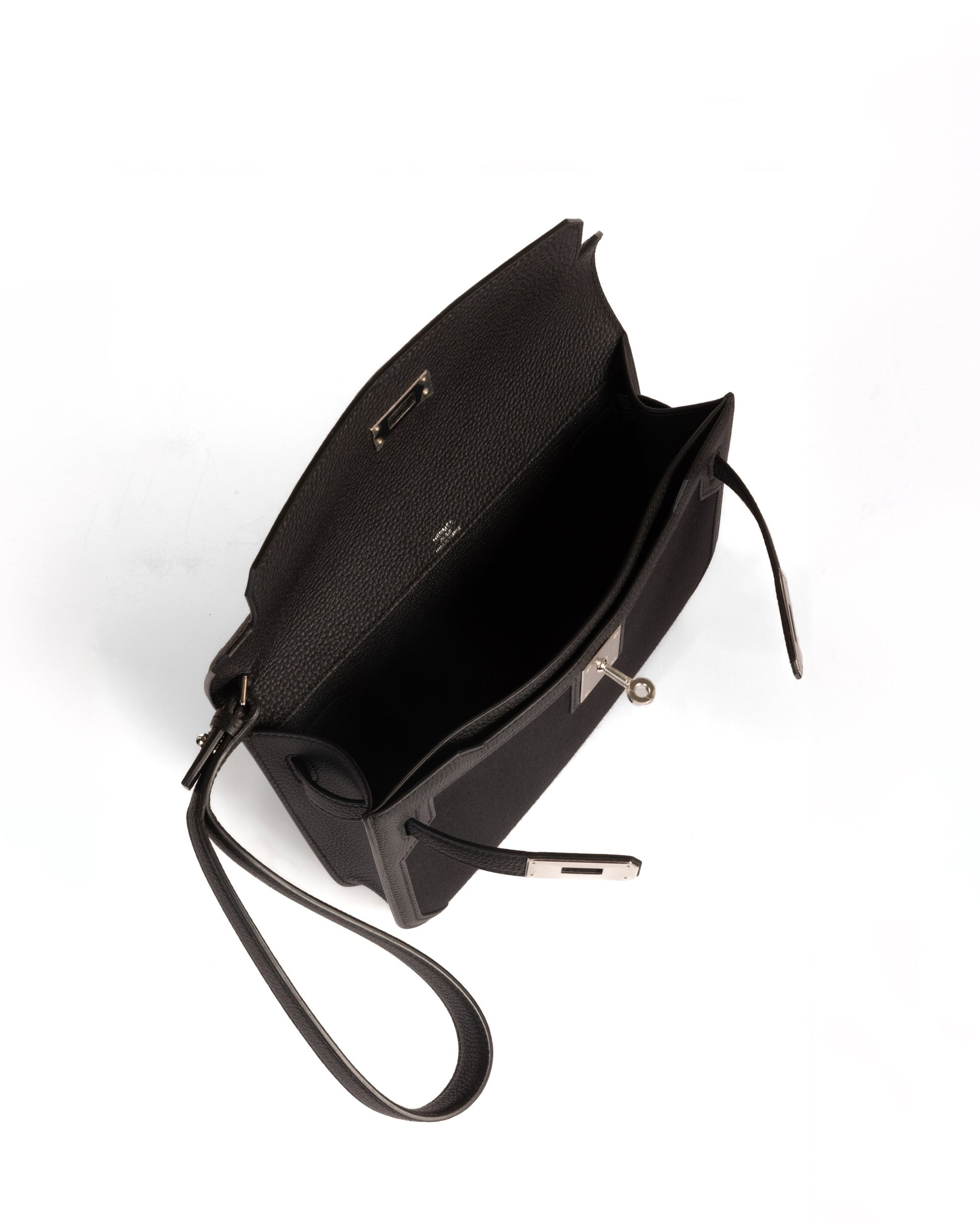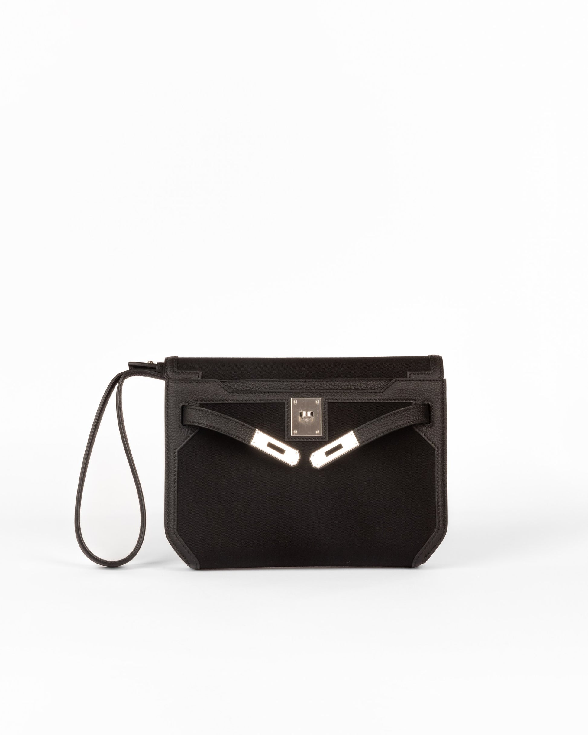 The Hermès Kelly Depeches 25 Black in Toile Canvas and Togo Leather with Palladium Hardware is a sophisticated and stylish accessory that combines timeless elegance with modern practicality. This chic pouch features the iconic Kelly design, crafted from durable black Toile Canvas and luxurious Togo Leather, creating a refined and versatile look.