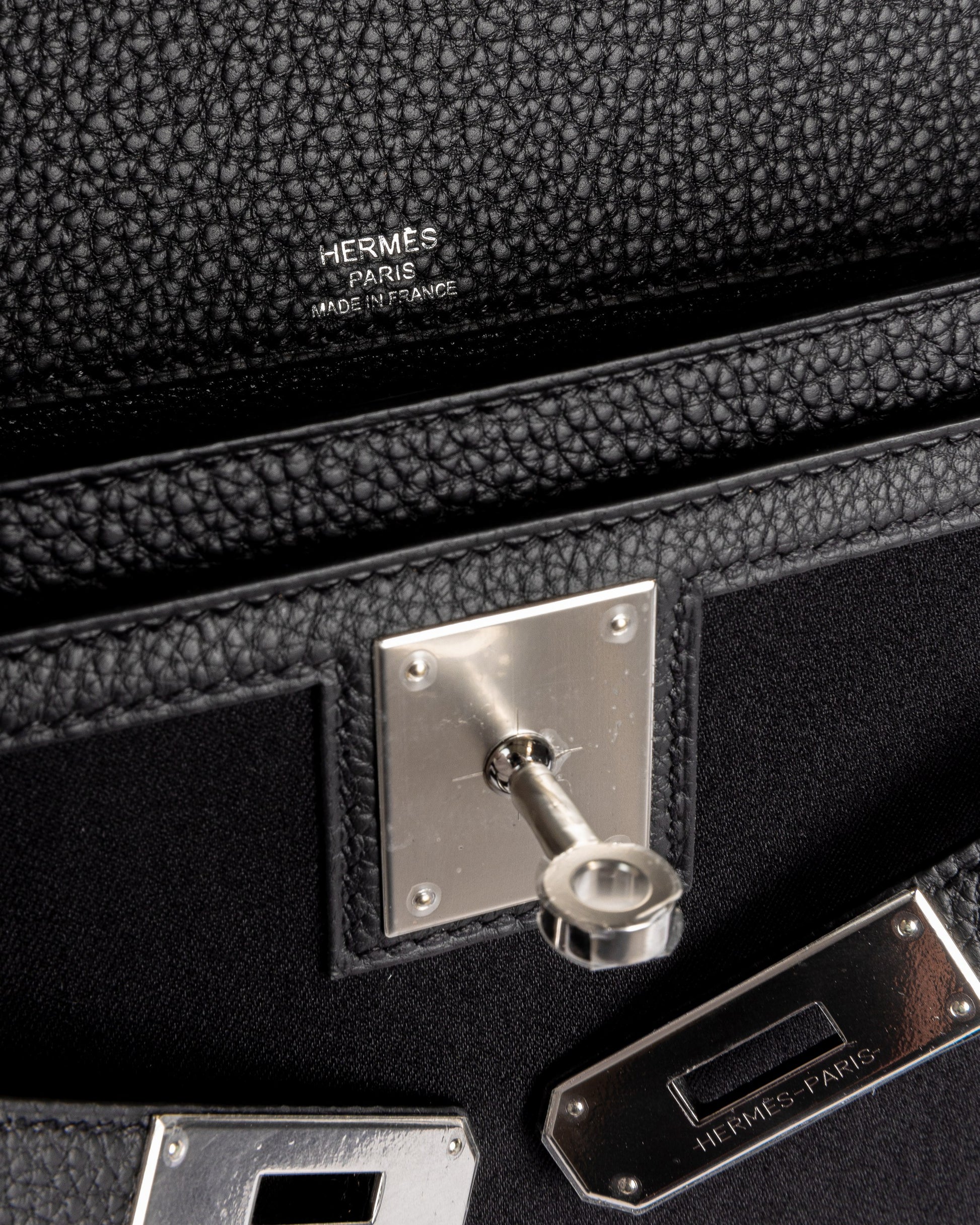 Kelly Depeches 25 Black in Toile Canvas and Togo Leather with Palladium Hardware