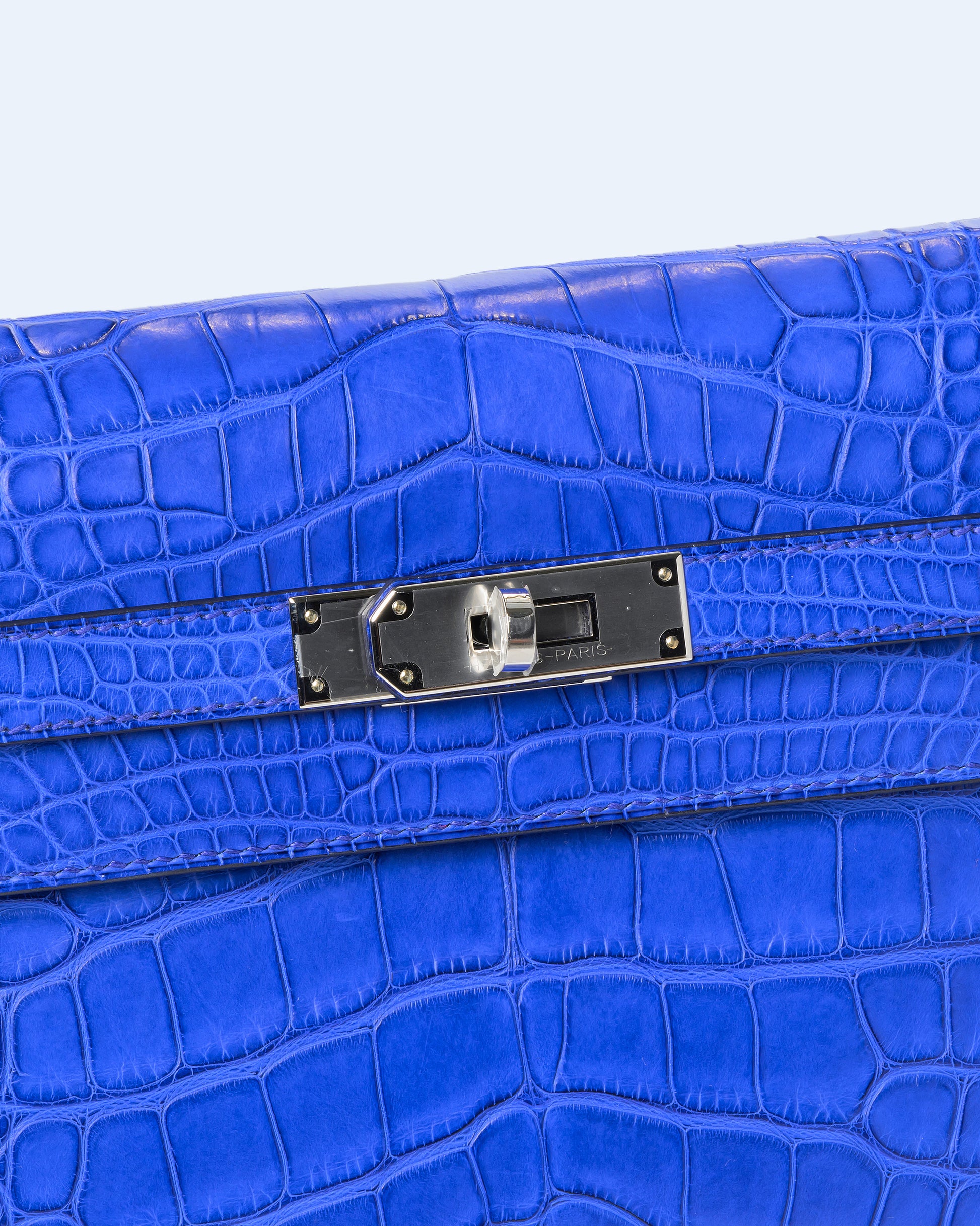 Kelly Depeches 25 Bleu Royal in Matte Alligator with Palladium Hardware