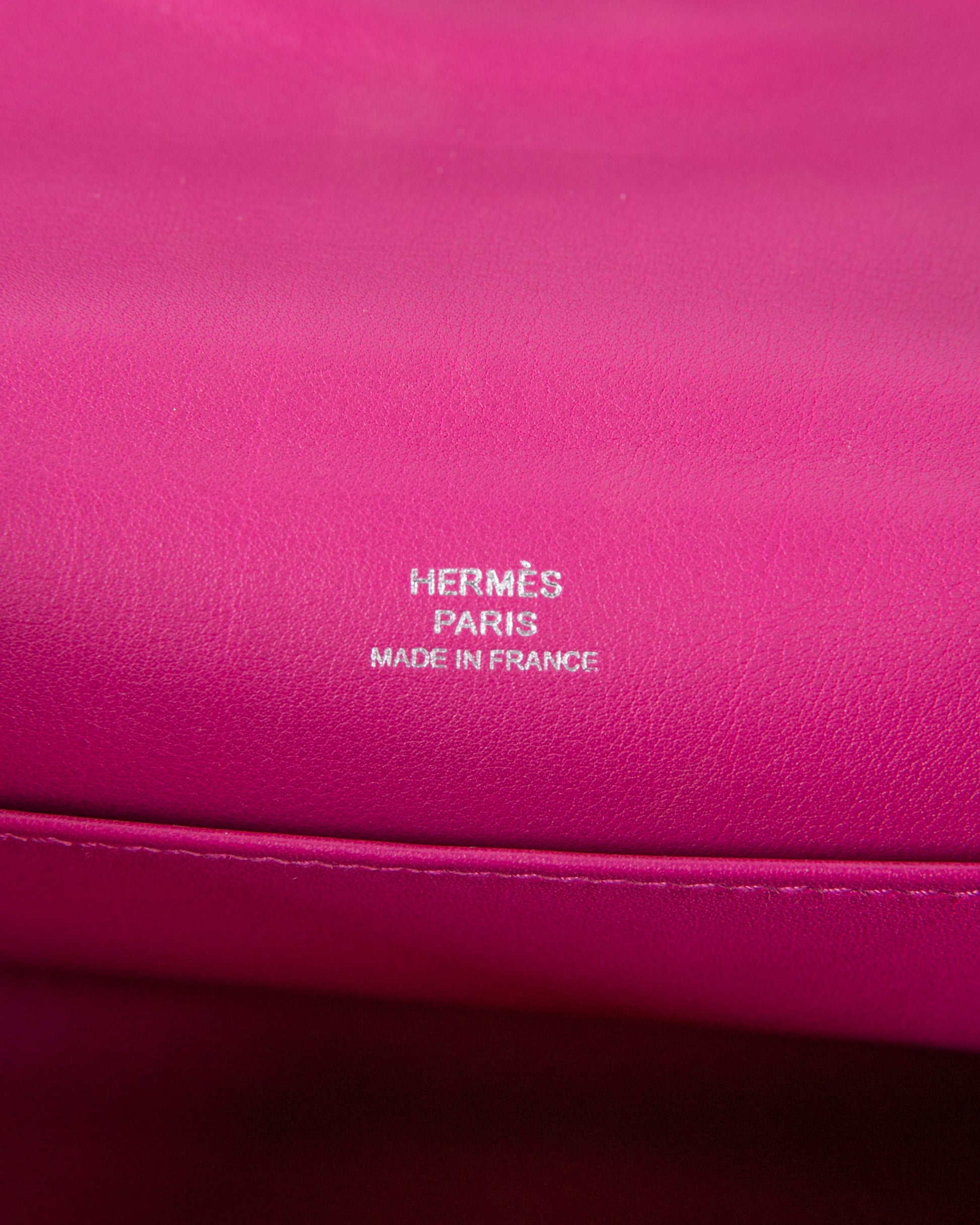 The exterior of this Kelly cut is crafted in beautiful Rose Rose Pourpre in Swift Leather. Rose Pourpre is a saturated combination between pink and purple. The bag features a single flat top handle, two horizontal interlocking straps, and a signature turn lock in Palladium hardware. This clutch is a perfect choice for an elegant evening look.
