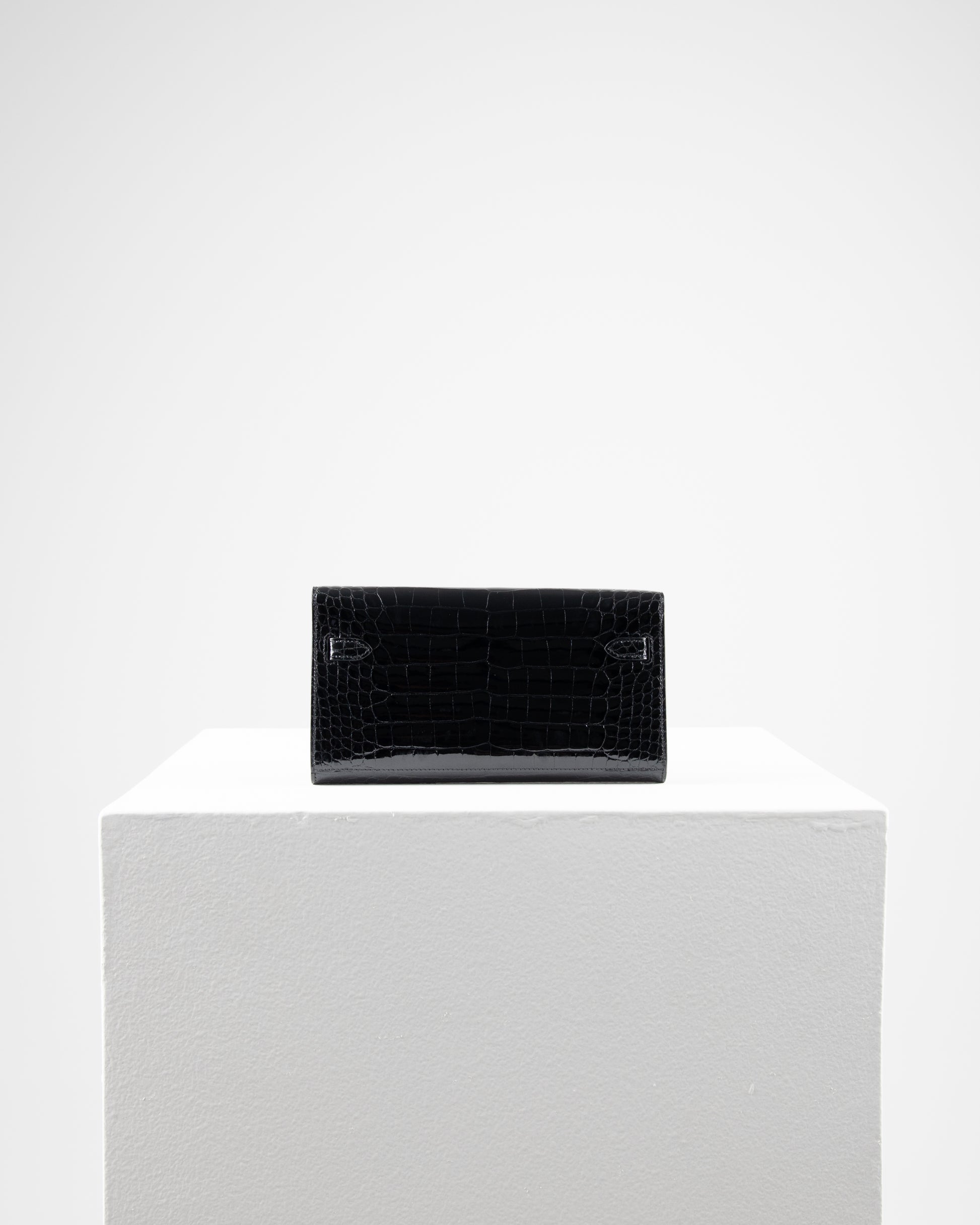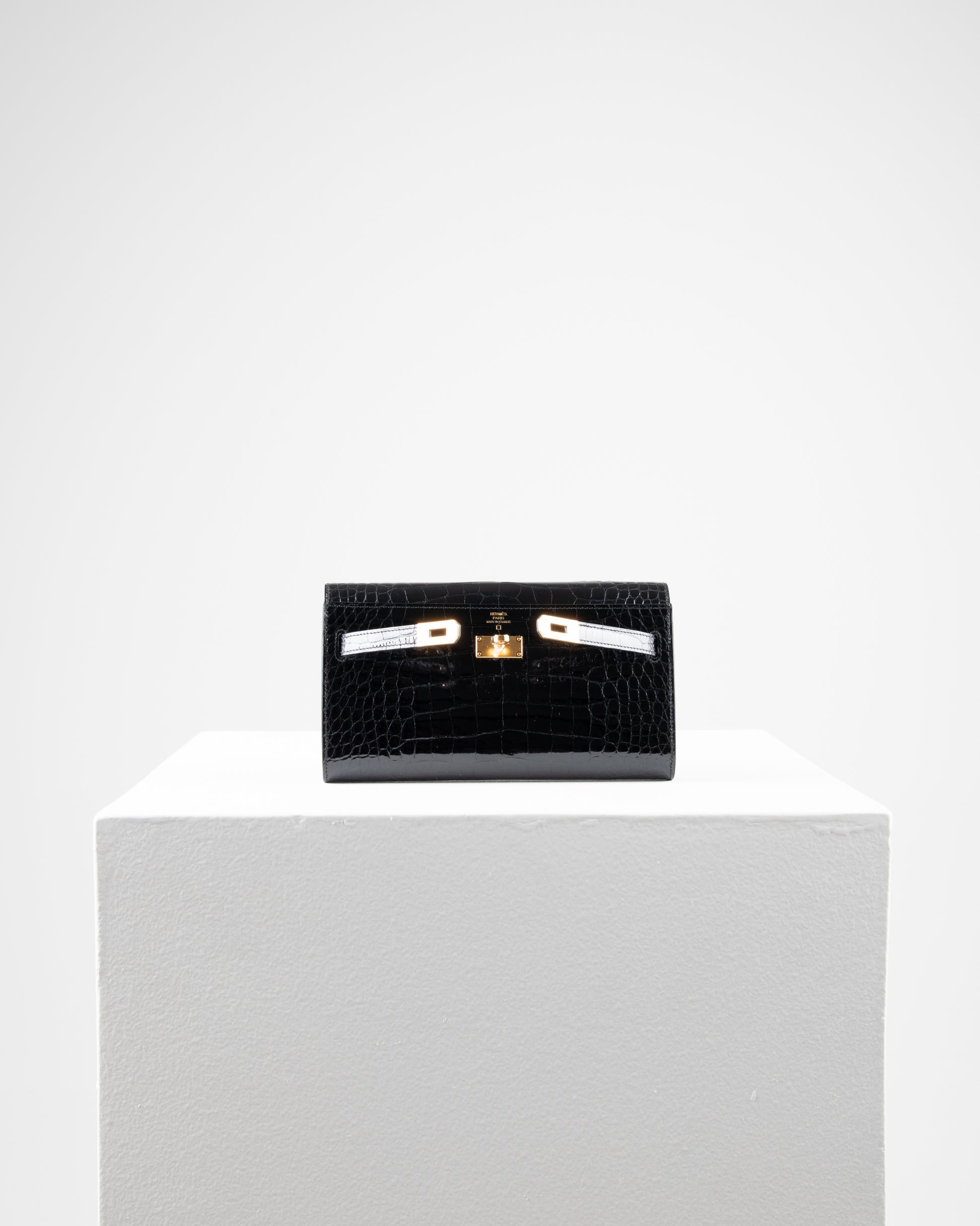 The Hermes Kelly Wallet-to-Go in Noir alligator leather is a timeless piece that showcases the iconic elegance and craftsmanship that Hermes is renowned for. It's a sophisticated accessory that effortlessly elevates any ensemble and is sure to make a lasting impression.