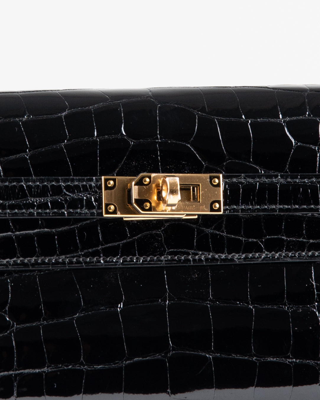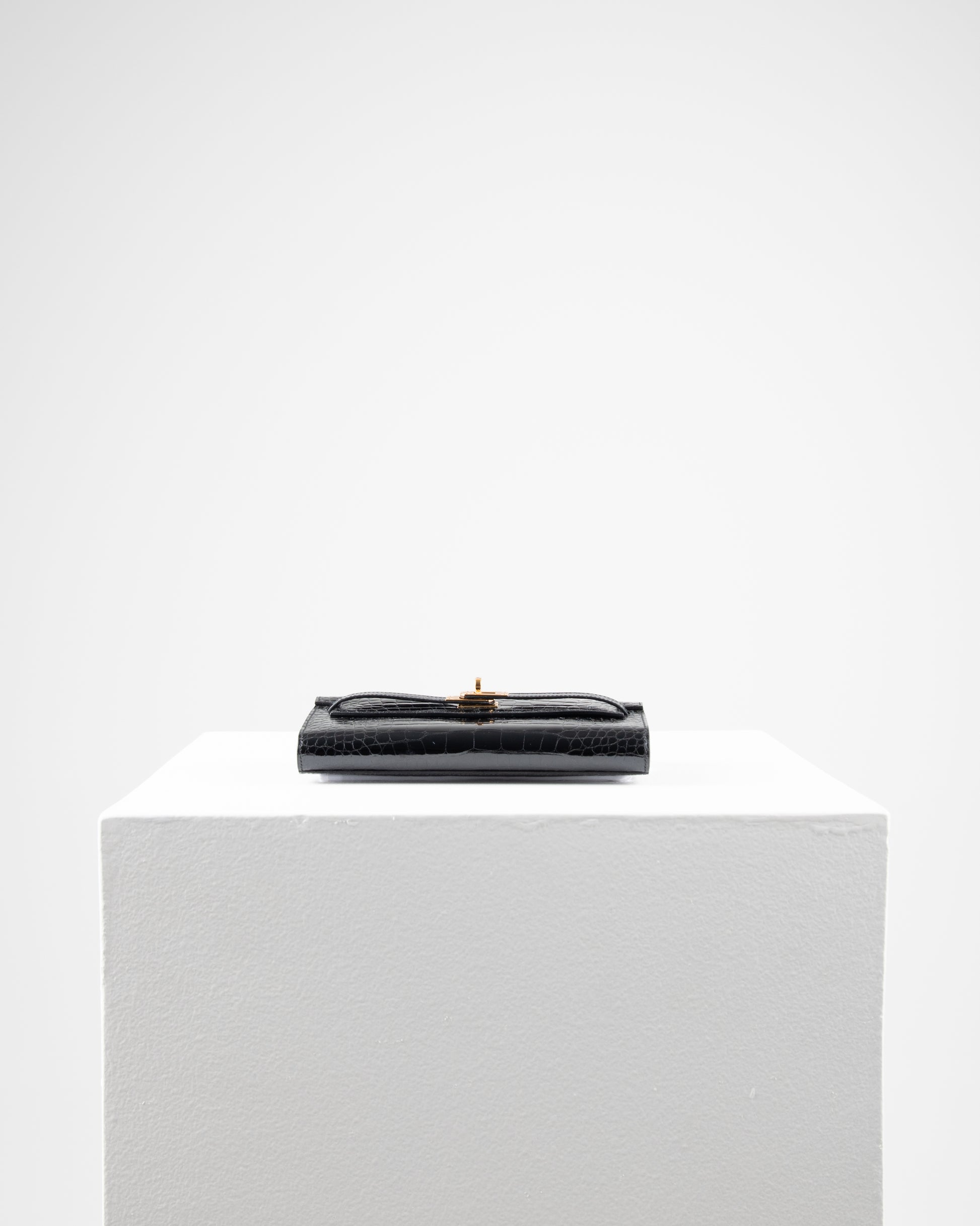Featuring a sleek and compact silhouette, this Kelly Wallet-to-Go is perfect for on-the-go elegance. The gold hardware complements the Noir alligator leather beautifully, adding a luxurious touch.