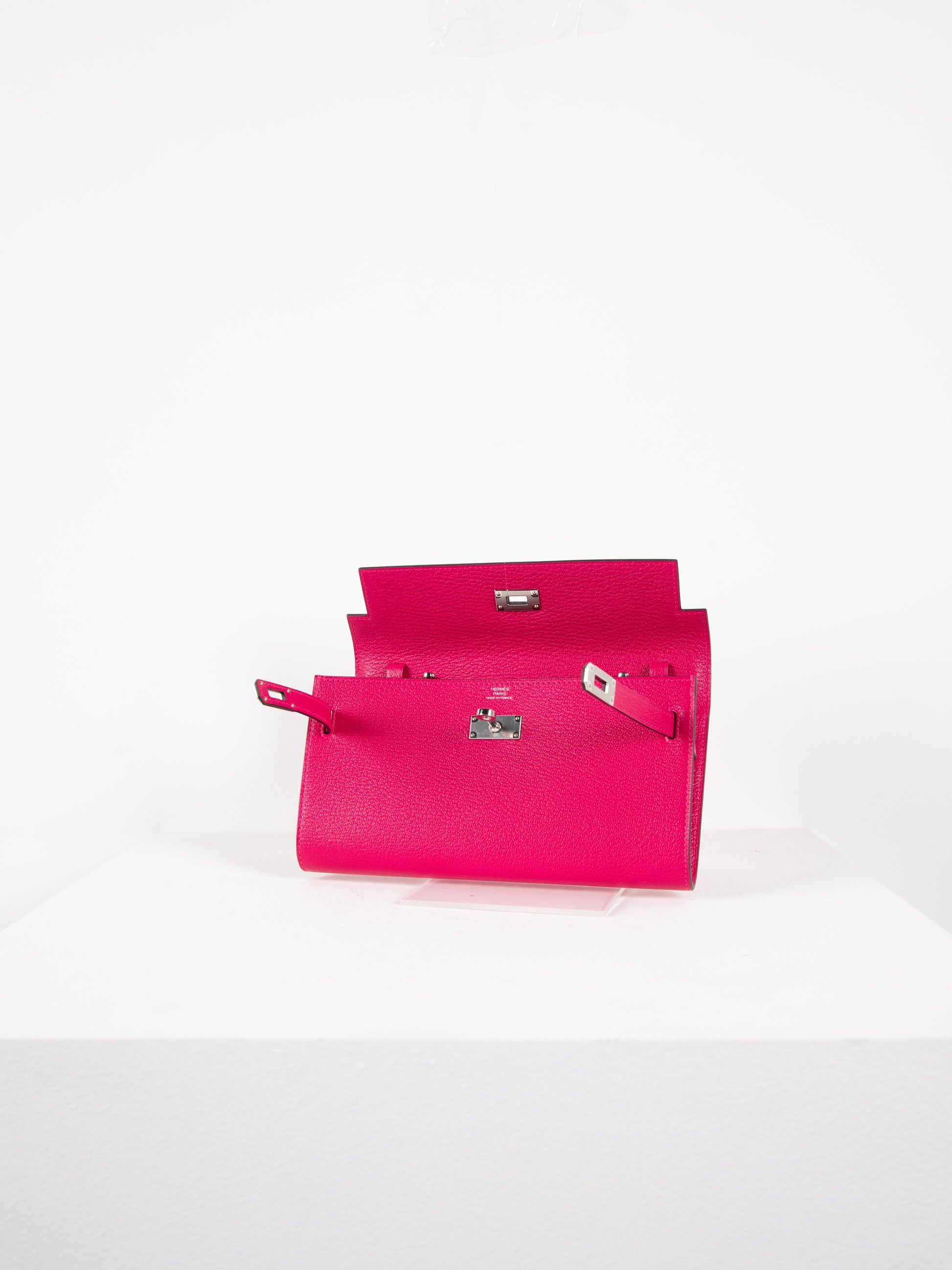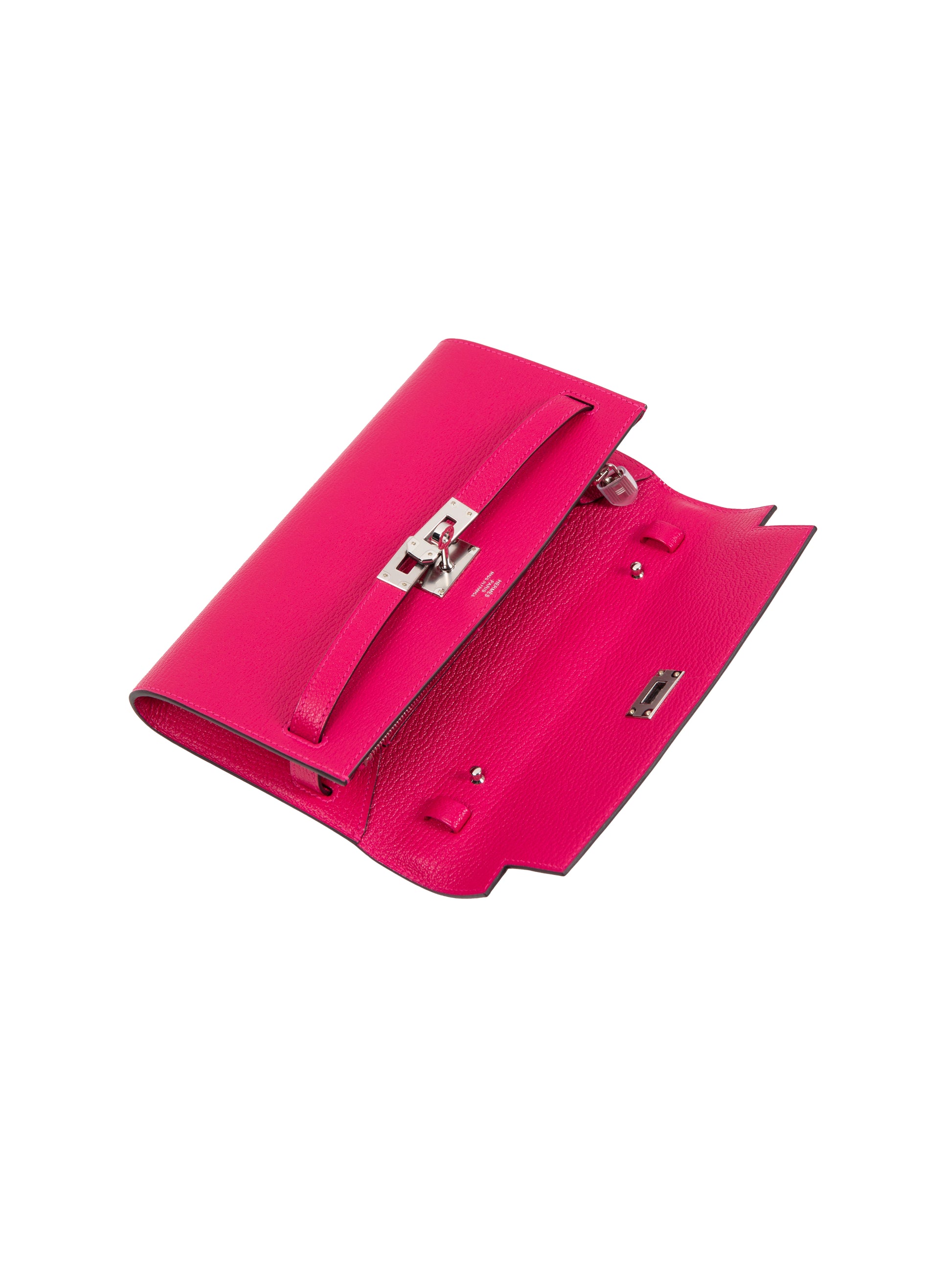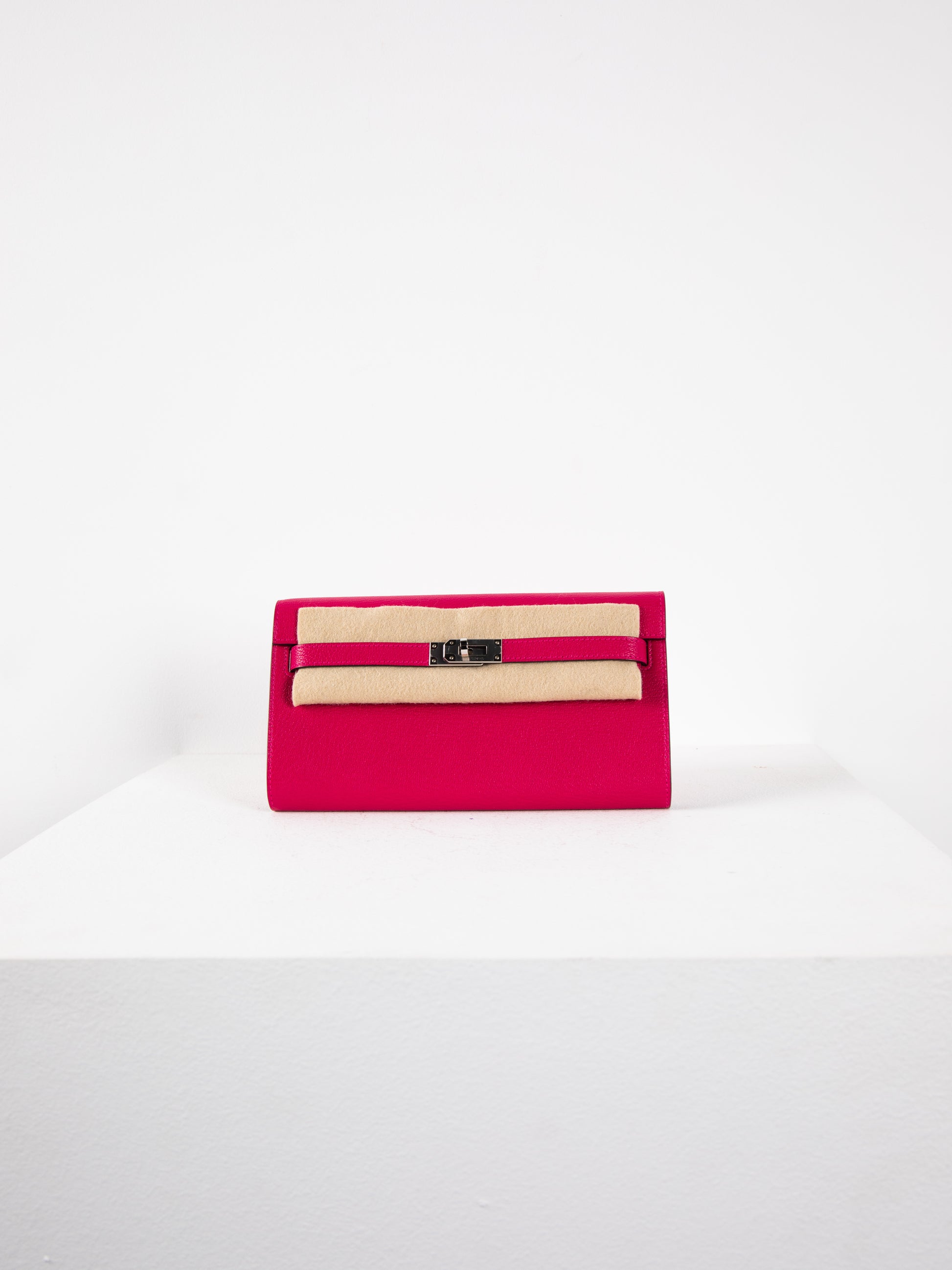 The exterior of this Kelly To Go is crafted with Chevre Mysore leather which is lightweight and scratch-resistant and is complemented with palladium hardware. The Kelly to-go wallets are very versatile and can be carried as a clutch, a crossbody, or around the shoulder.