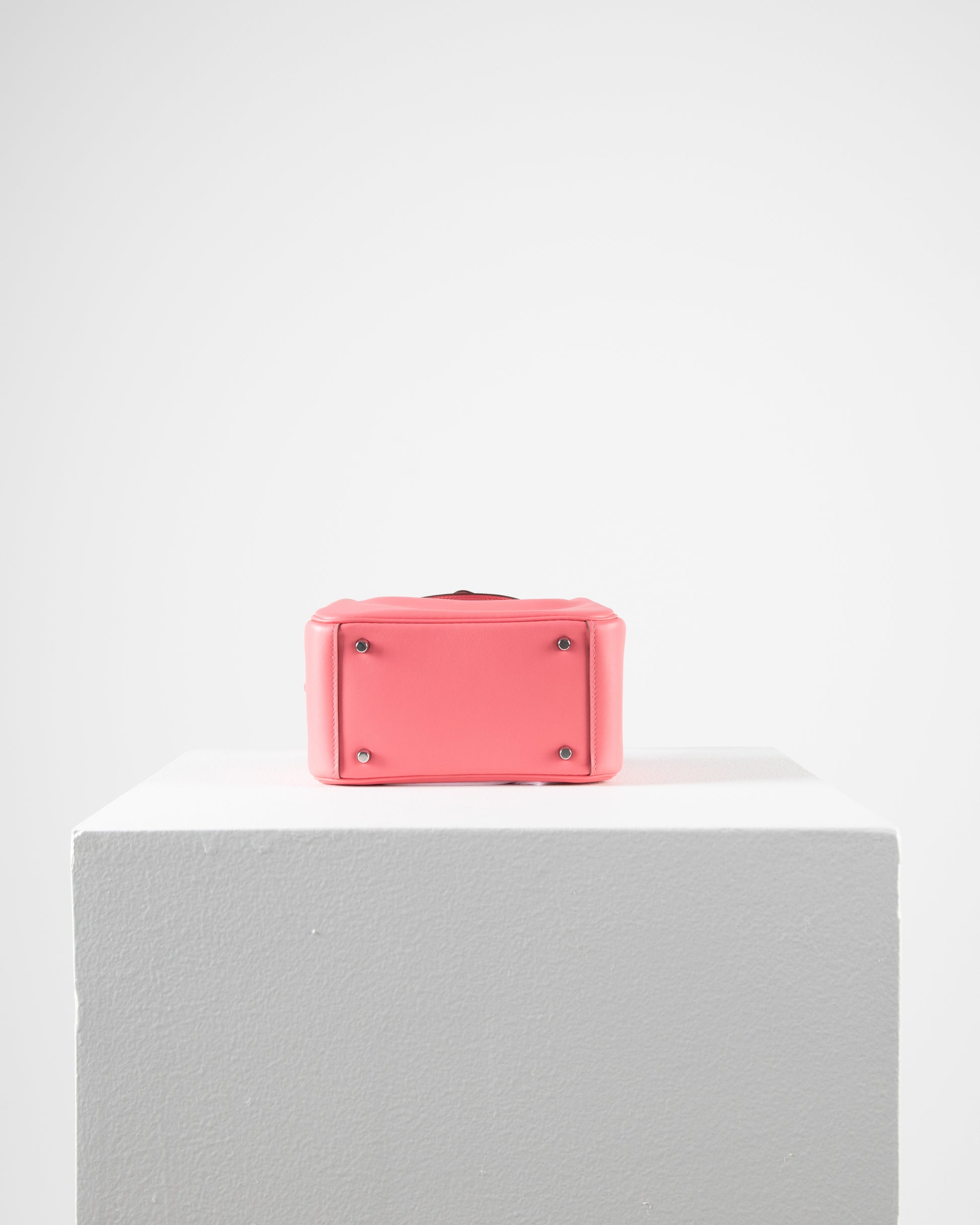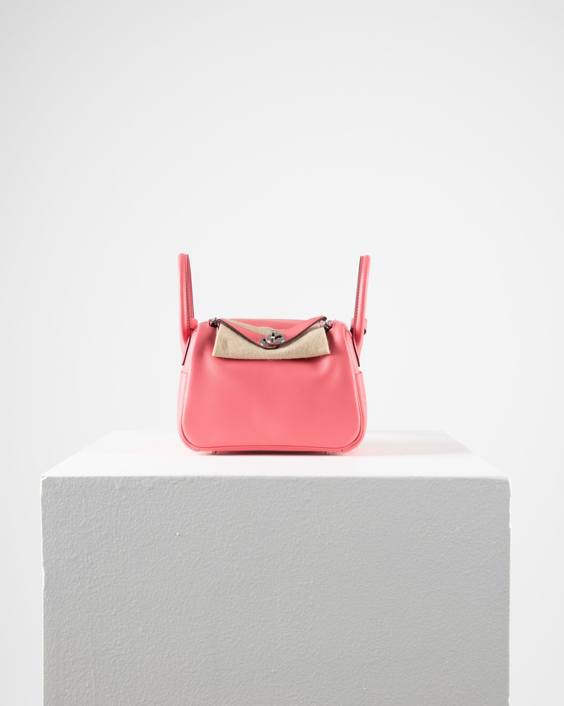 Our Mini Lindy is crafted with the finest Swift leather, renowned for its buttery feel and luxurious texture. It features a stunning shade of Rose Azalee with the perfect finishing touch in Palladium Hardware. The interior is lined in Chèvre leather in Rose Azalee and has one zip pocket with an Hermès engraved pull, along with two open pockets on the opposite side.
