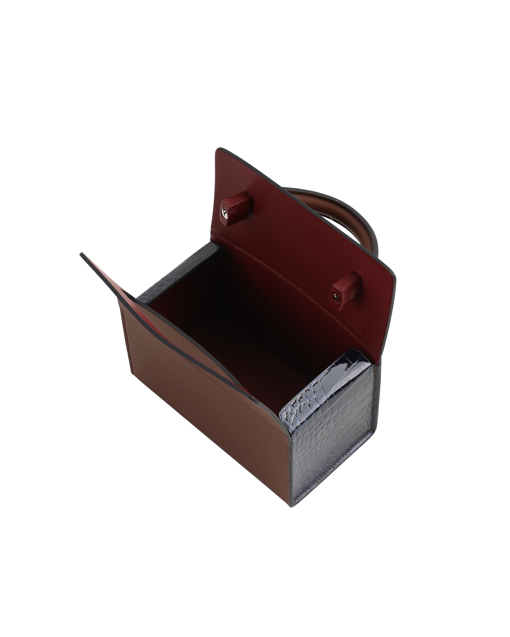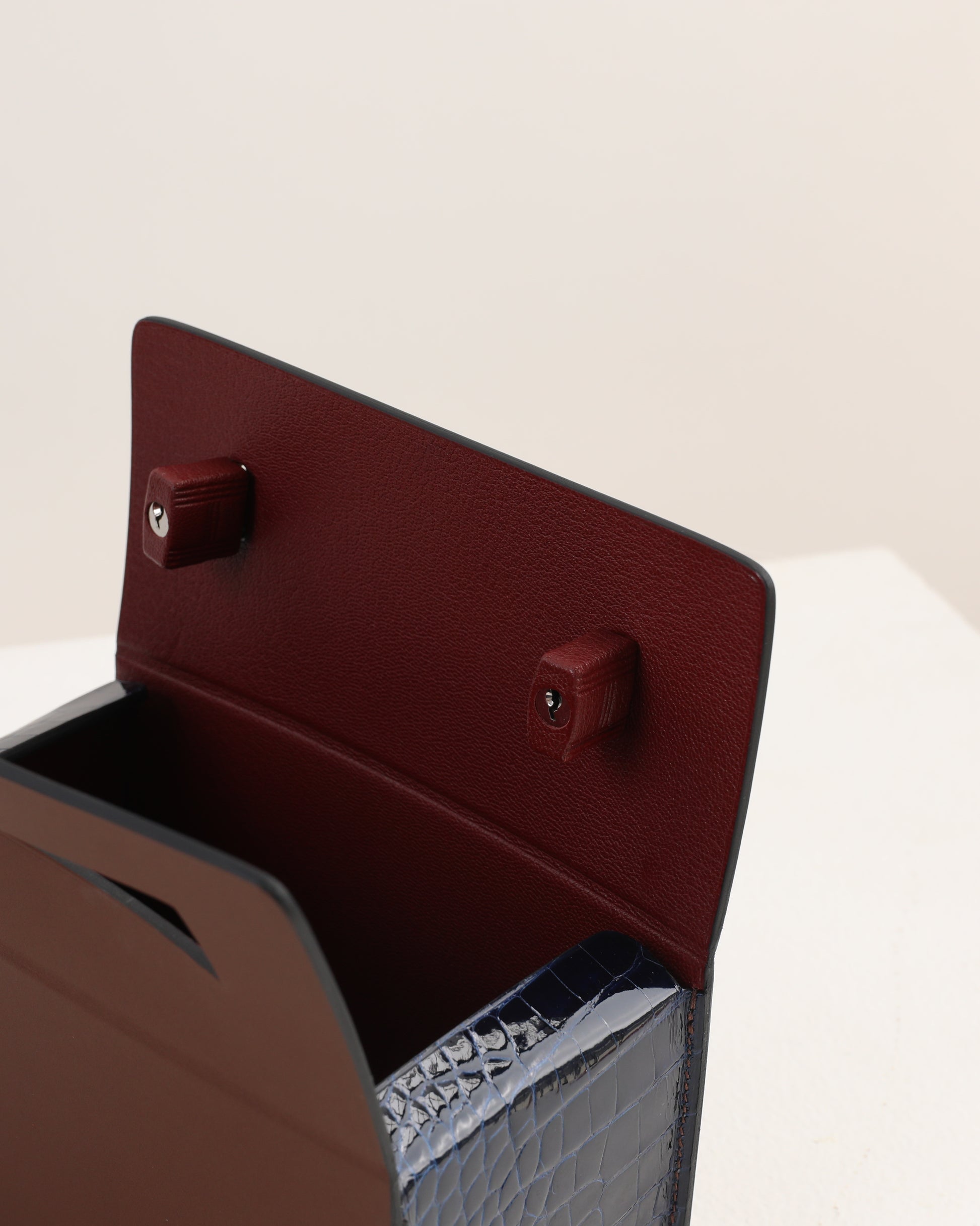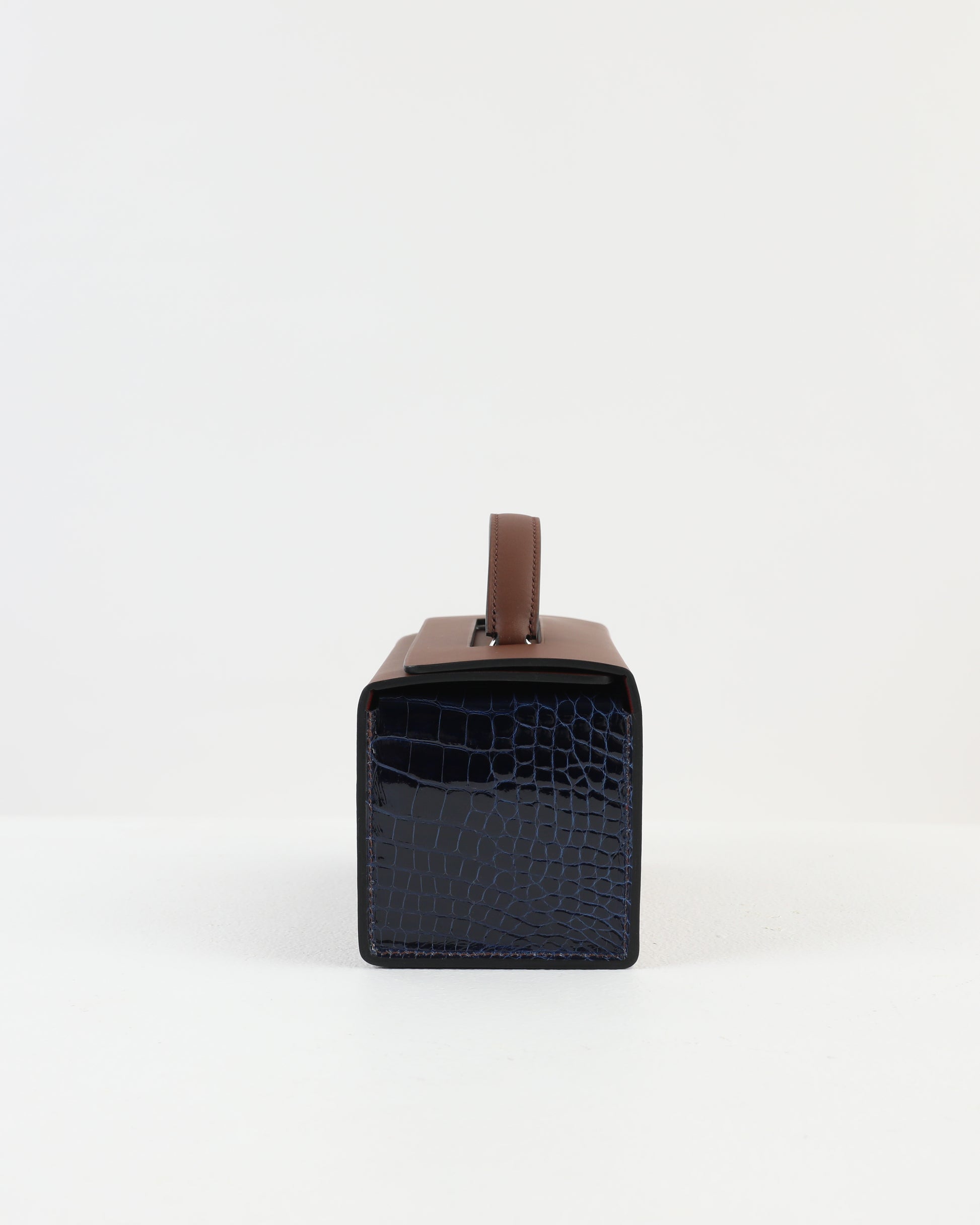 Petit H Boxbag in Hunter Cowhide & Bleu Saphir Shiny Alligator with Brass Hardware
