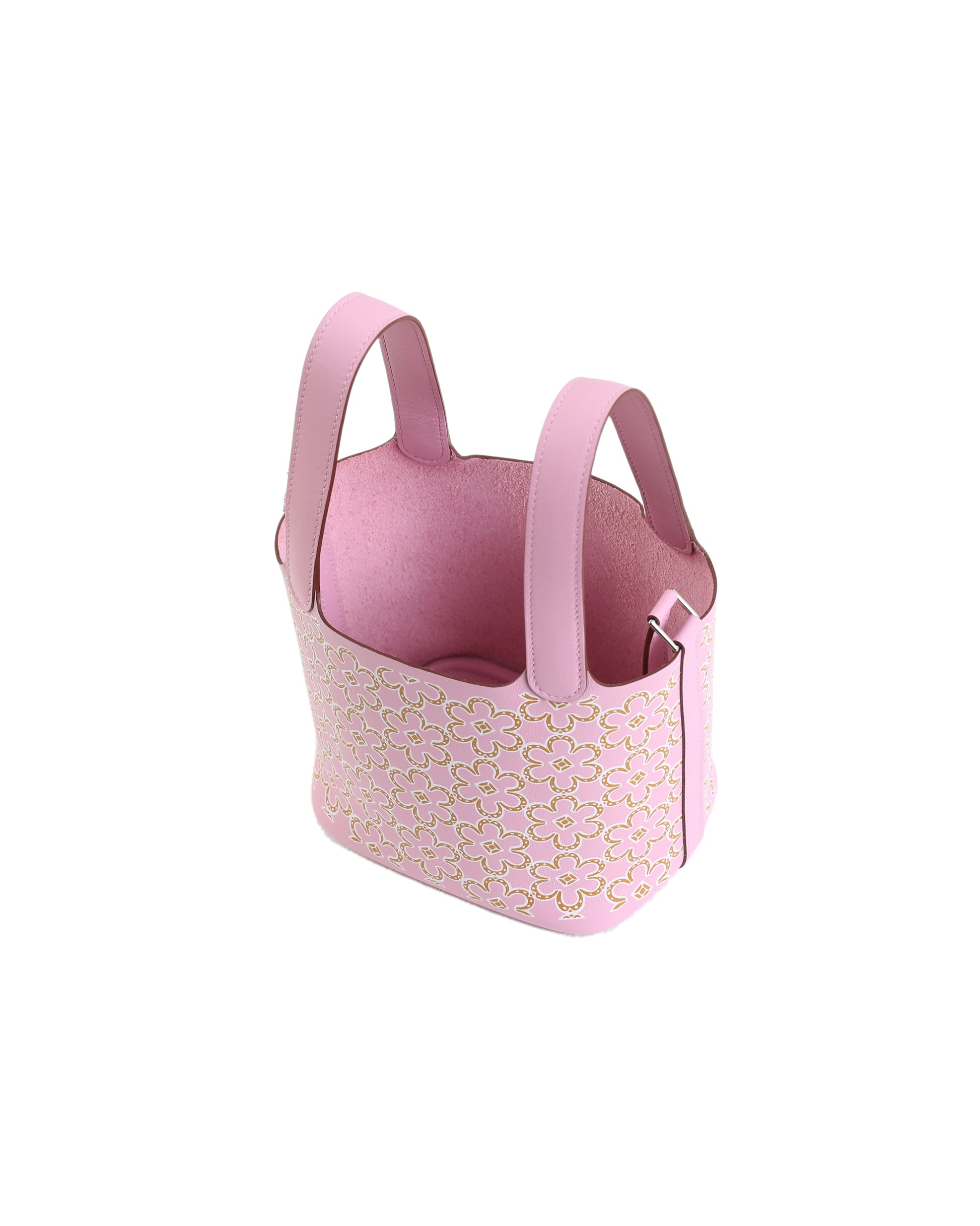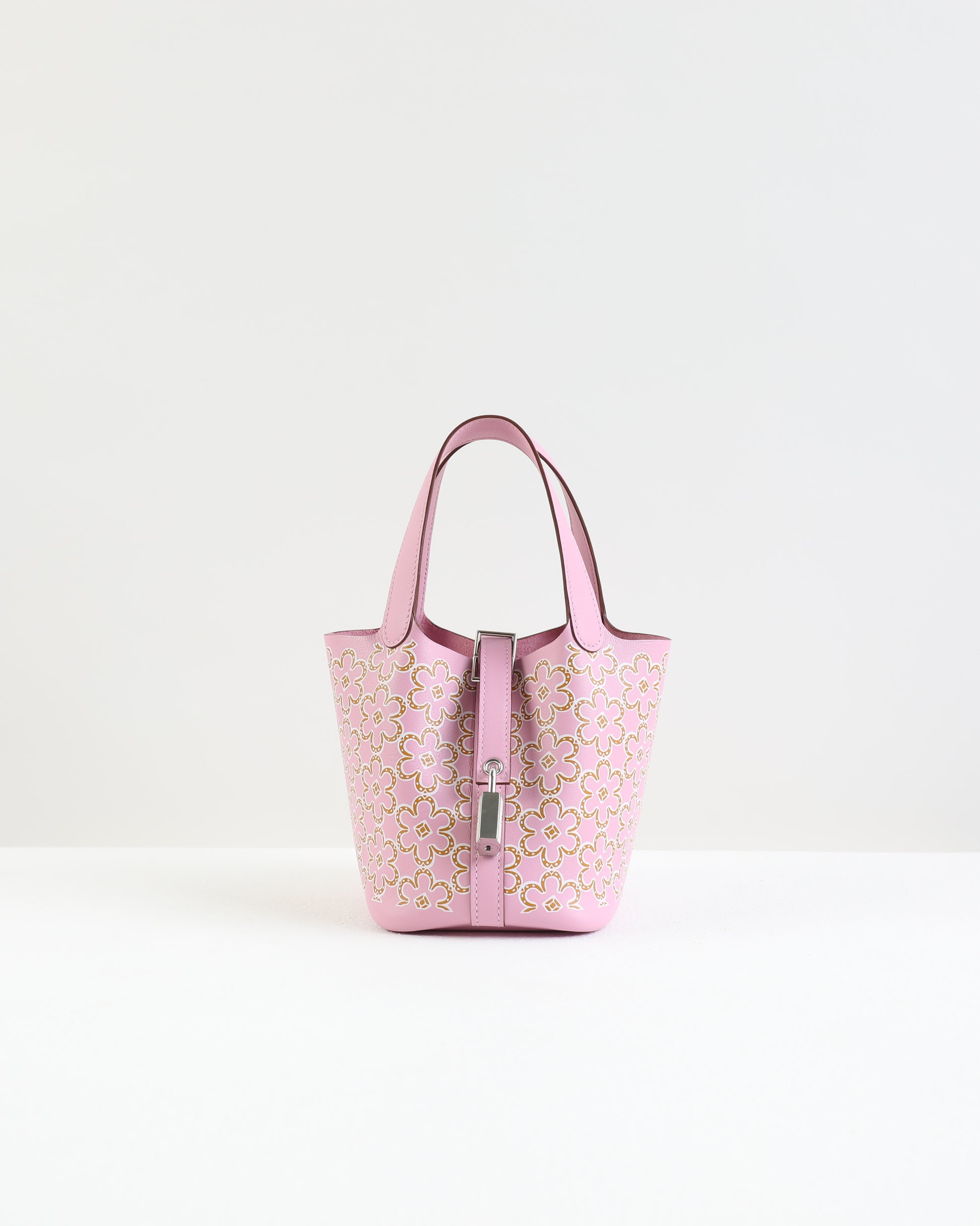 This Picotin 14 is crafted with Mauve Sylvestre Swift leather. The flower design features Nata and Mauve Sylvestre, which can be styled throughout all seasons. Can be closed with a leather strap held by a palladium-plated silver padlock.