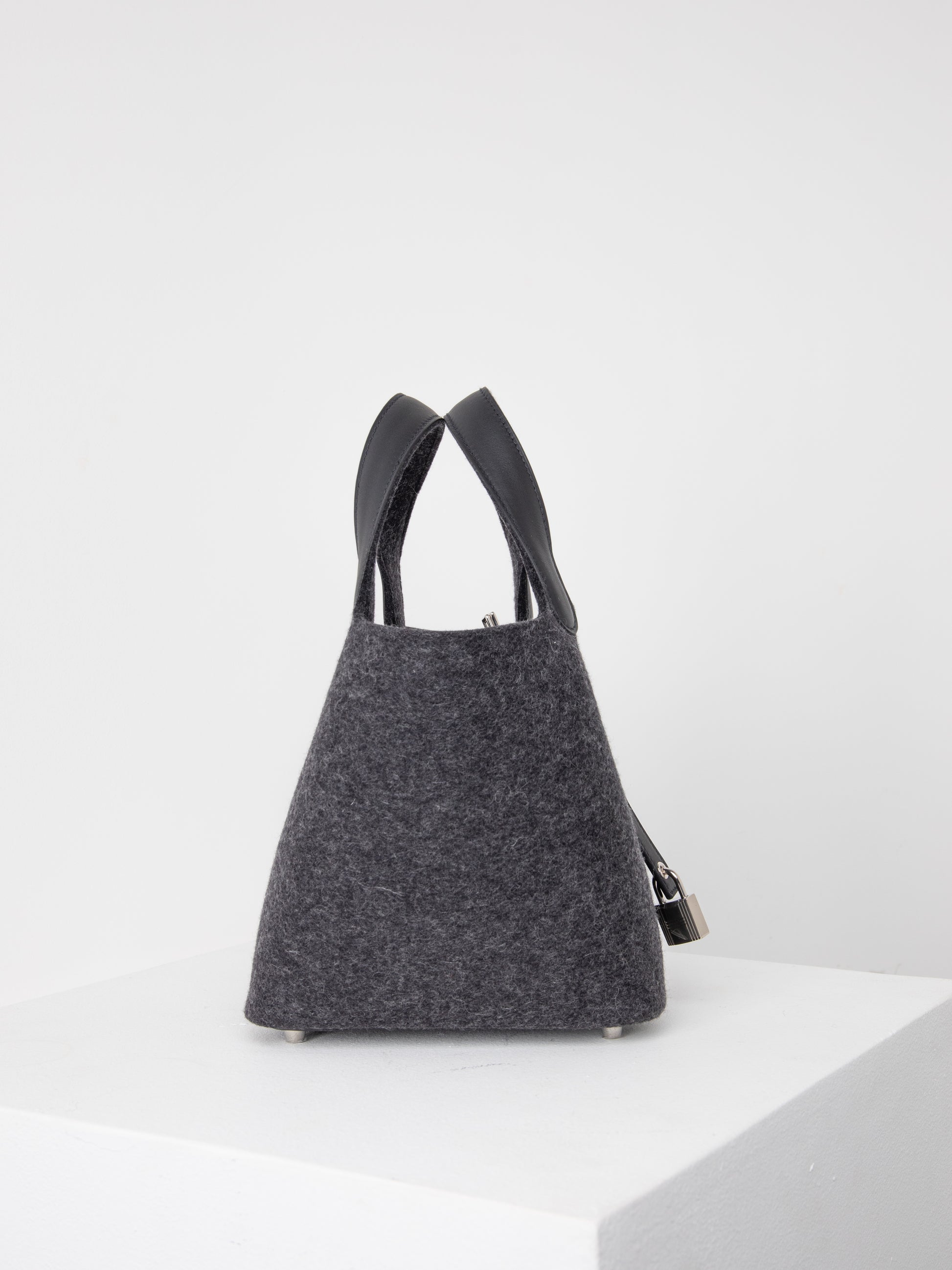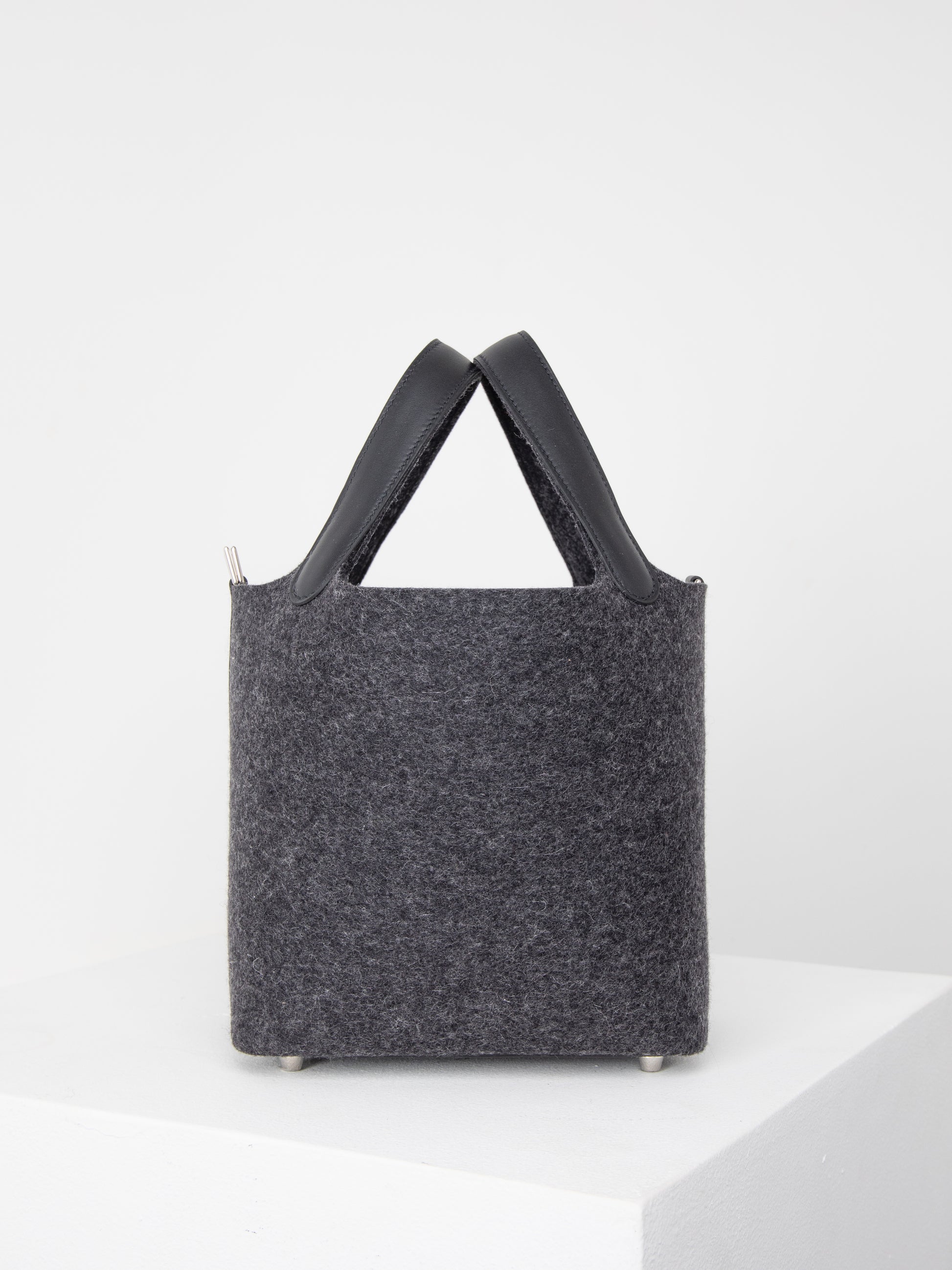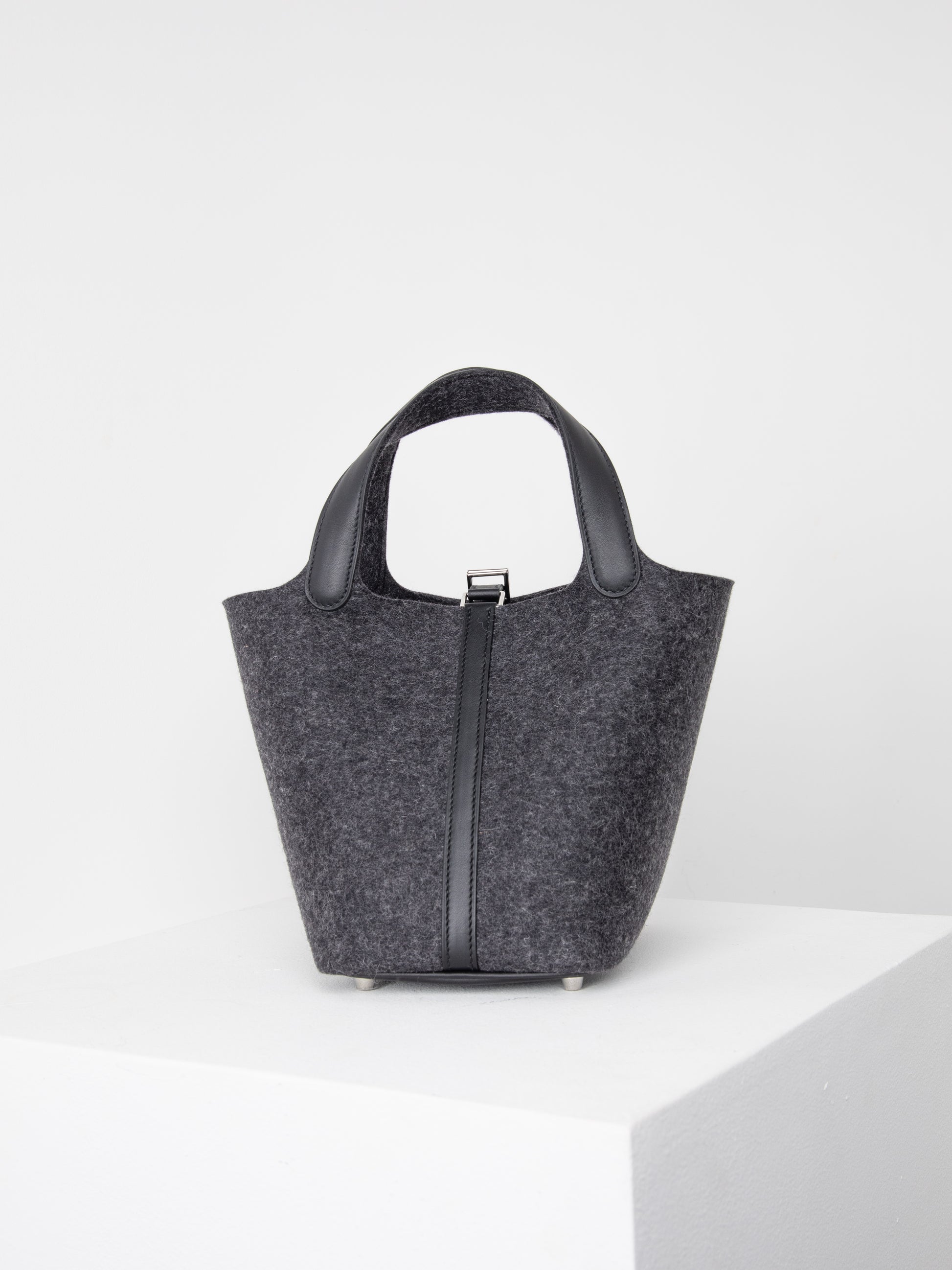 This Picotin 18 is crafted with two different materials; Granite Felt and Noir Swift leather. The Granite and Noir is a classic combination that can be styled throughout the winter season.