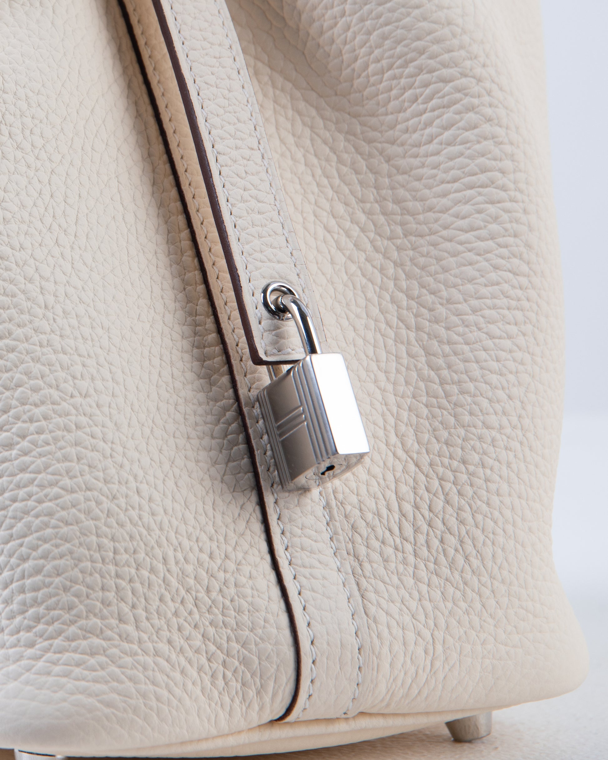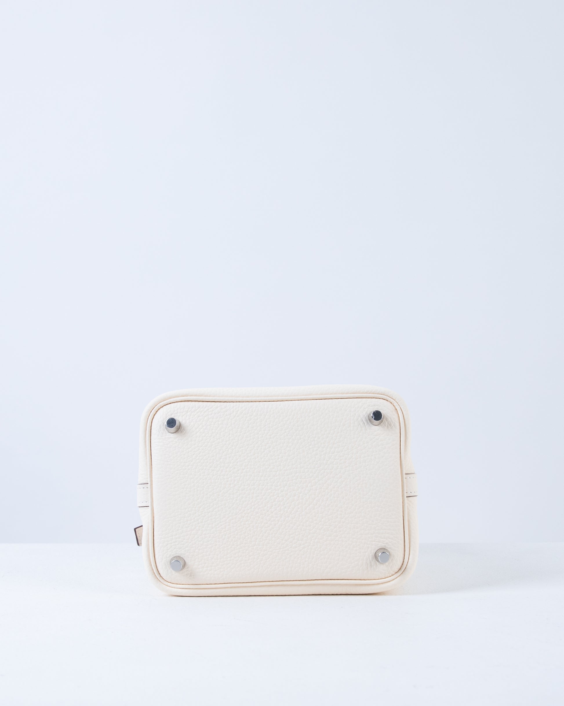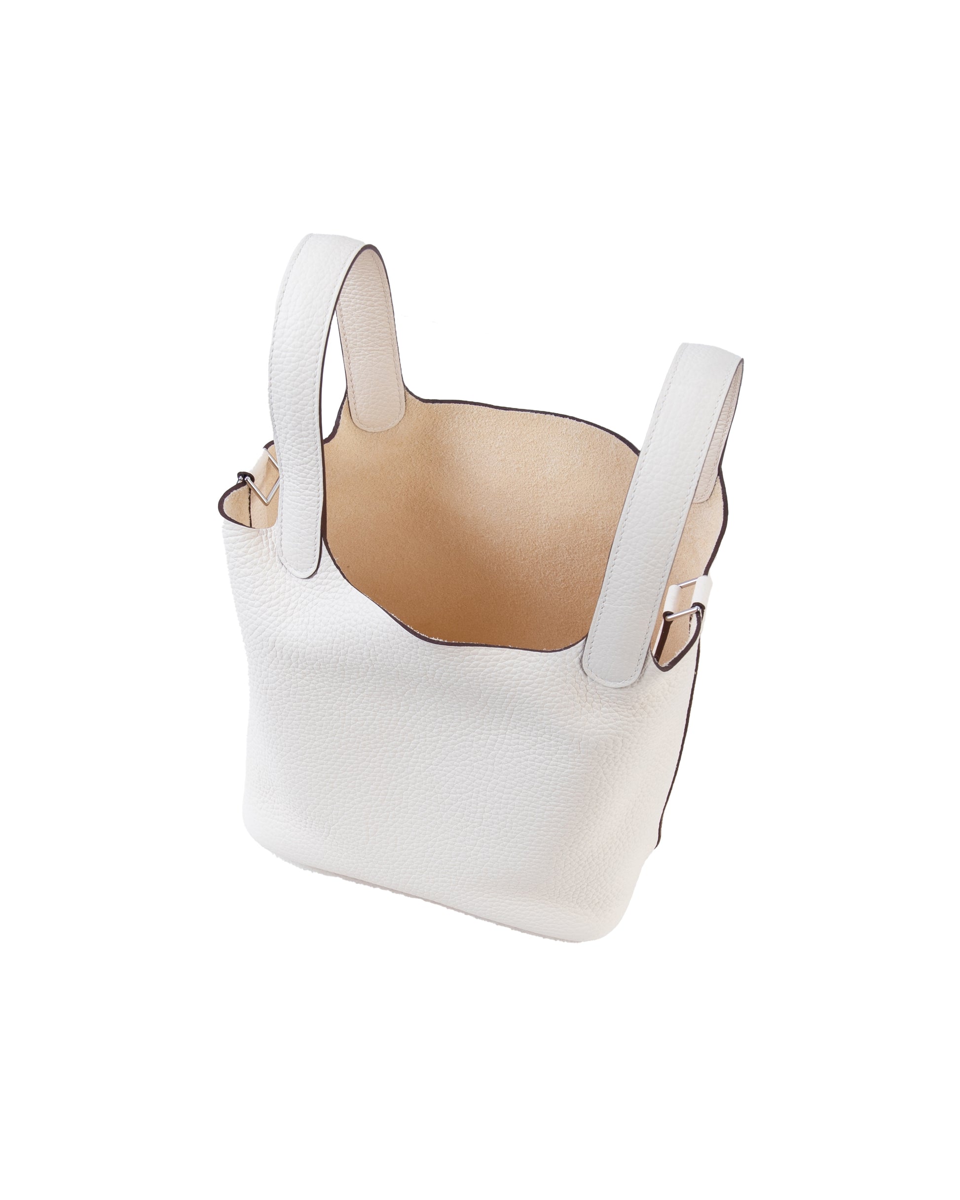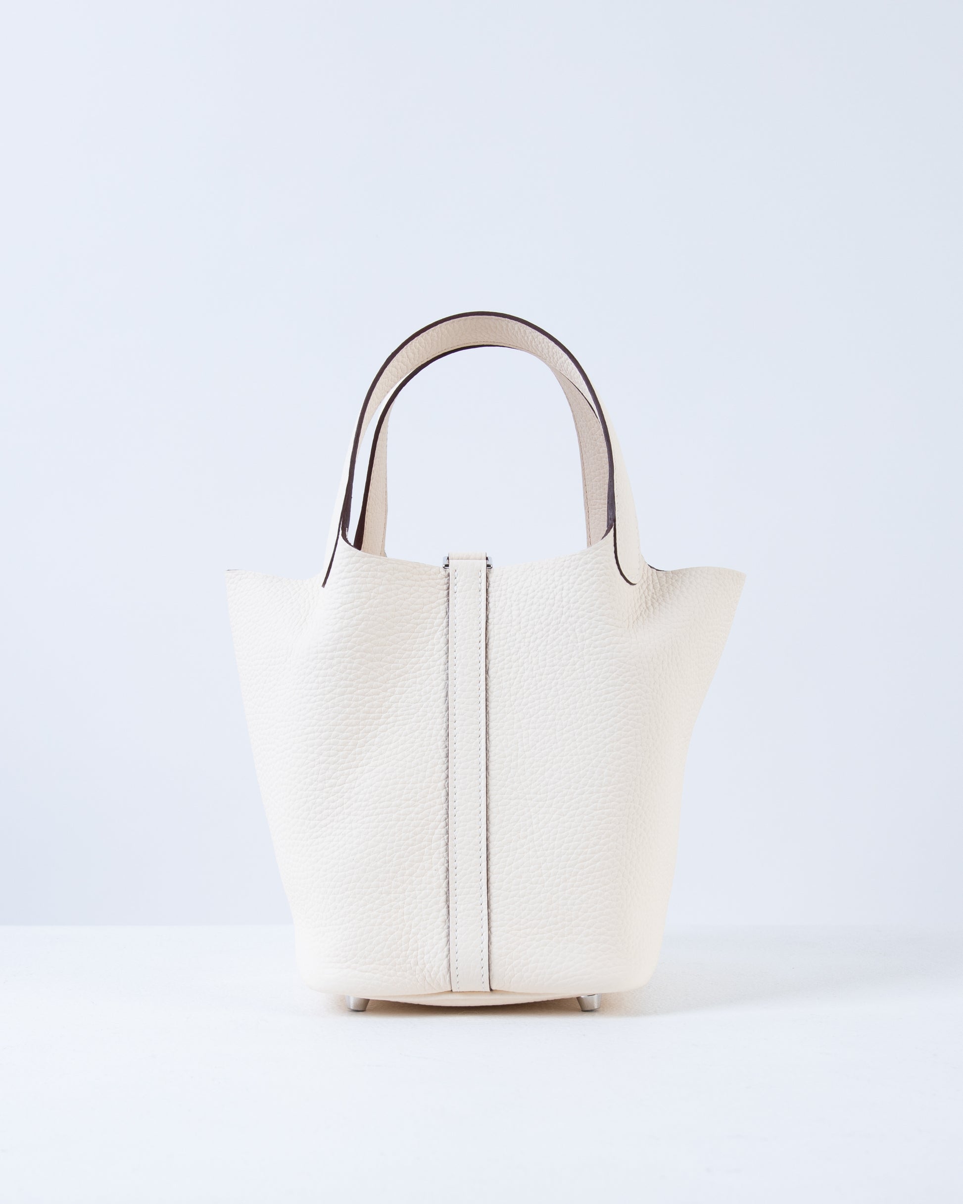 Presenting our Hermès Picotin 18 in Nata, adorned with exquisite Clemence leather and Palladium hardware. Nata, radiating a subtle charm, boasts a warm ivory hue with a mellow character. This delightful shade, brighter than Craie, holds a gentle yellowish tint reminiscent of vanilla ice cream.