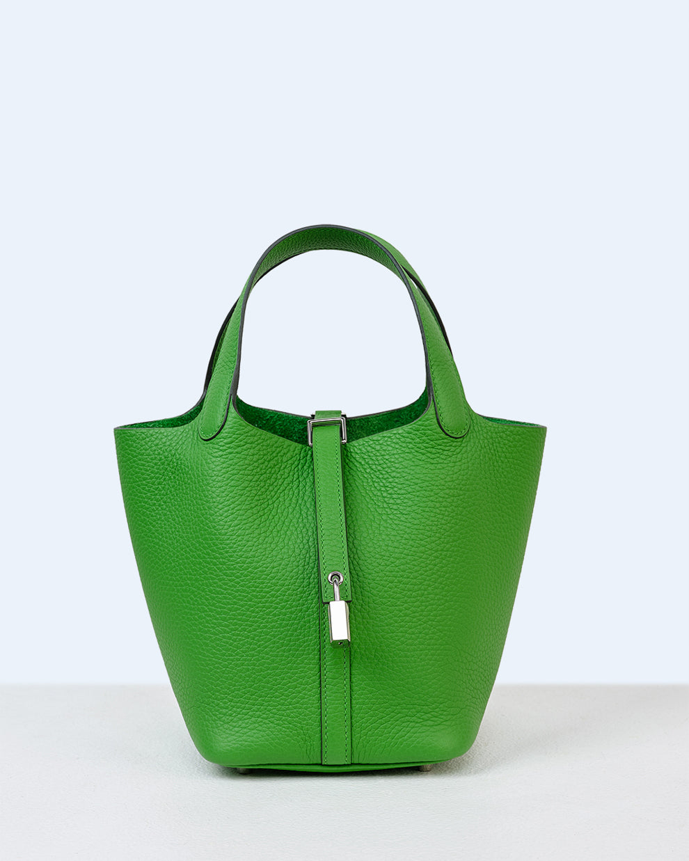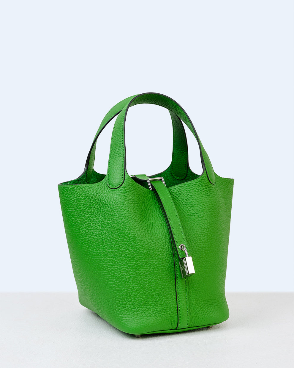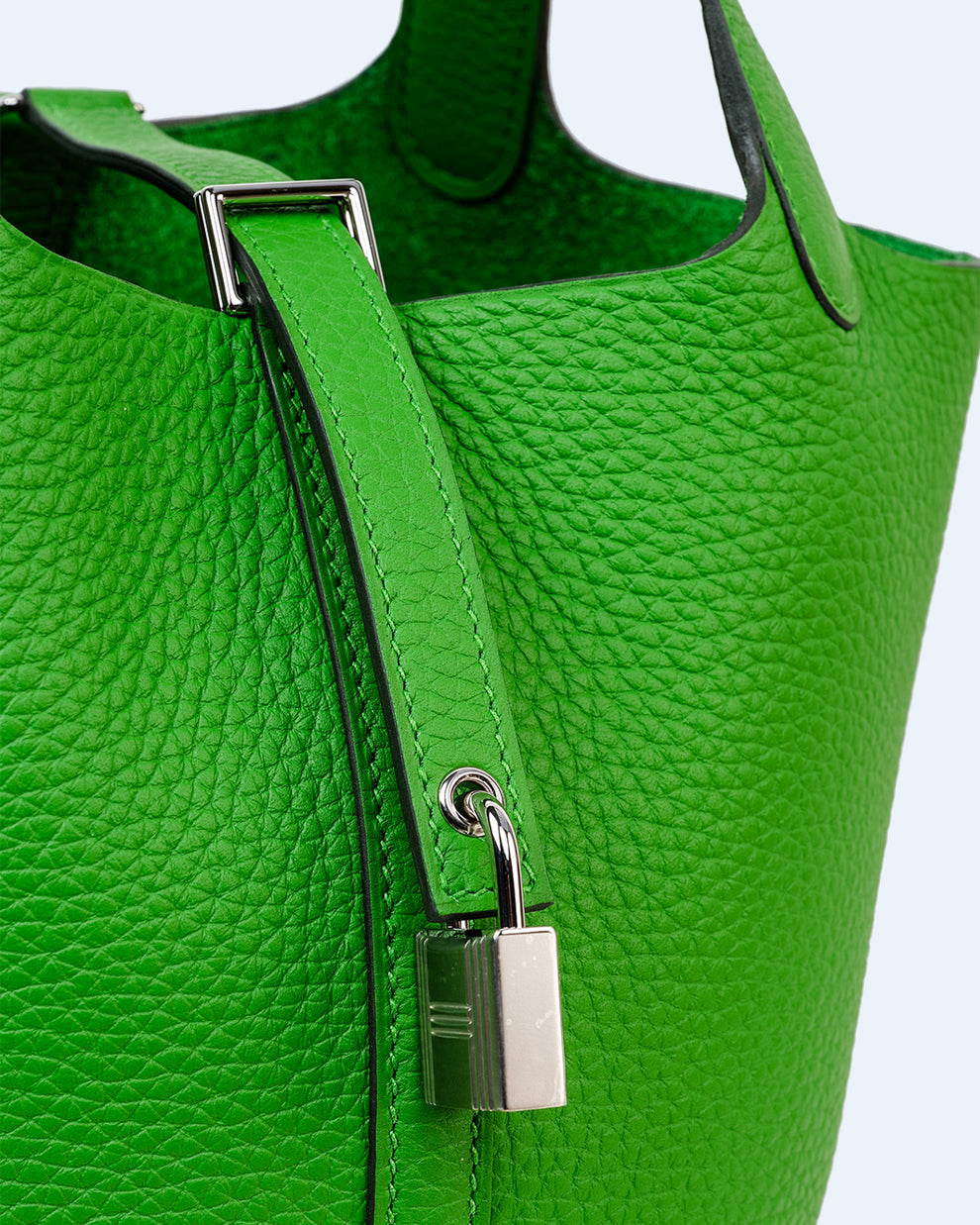 Fashioned from exquisite Vert Yucca Clemence leather, ensuring versatile styling across all seasons. Secured by a leather strap and adorned with a palladium-plated silver padlock, this Picotin 18 exudes both elegance and craftsmanship.